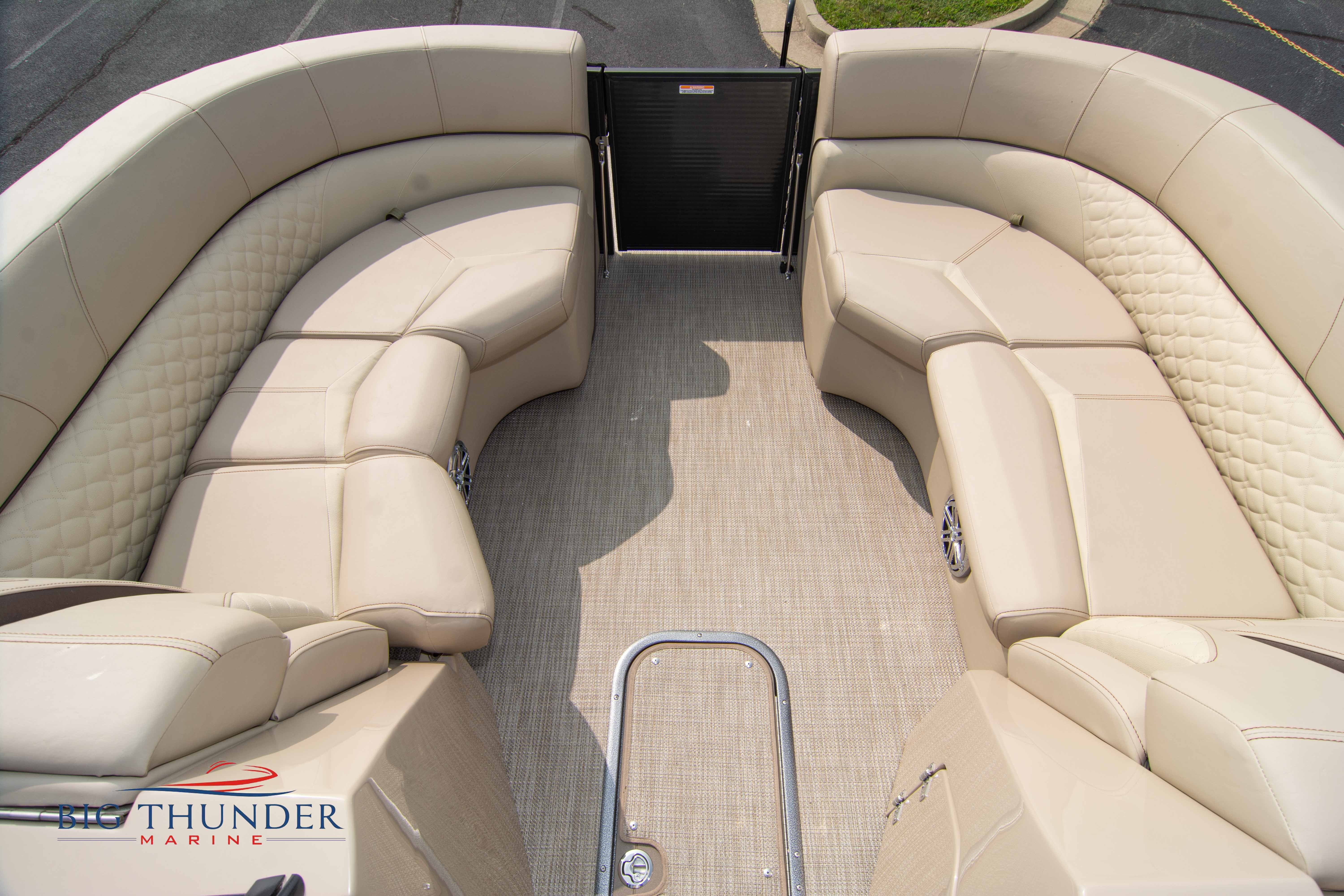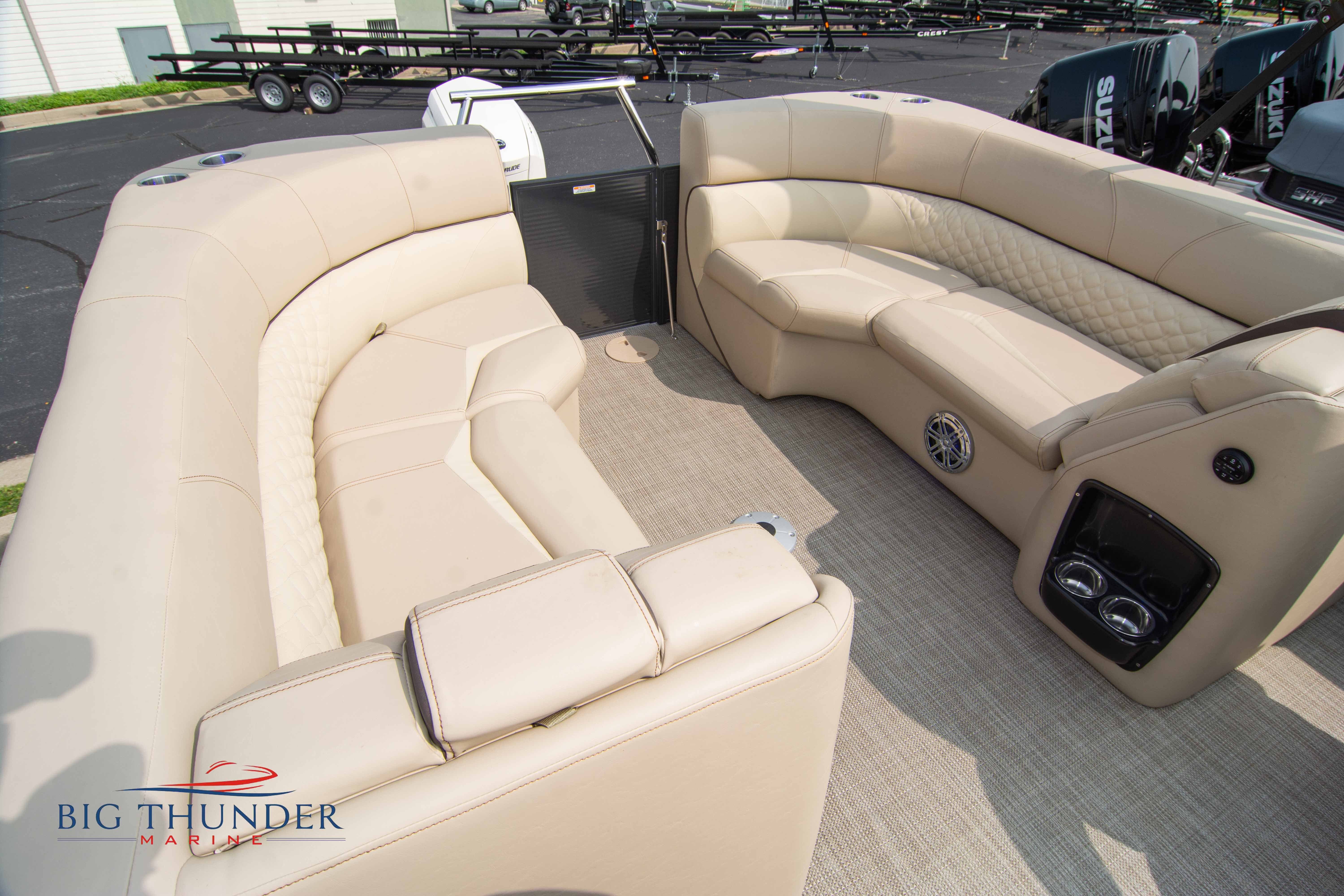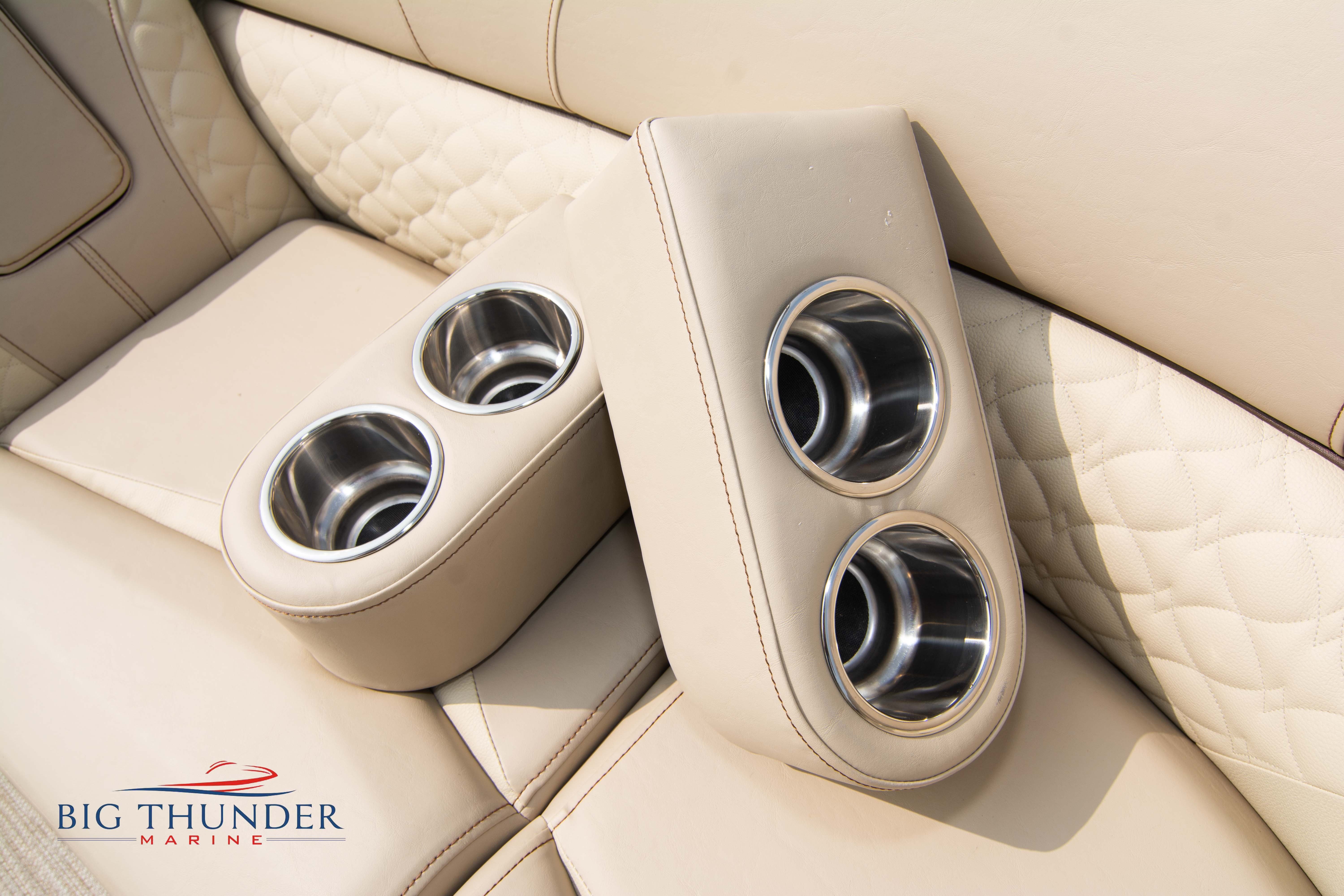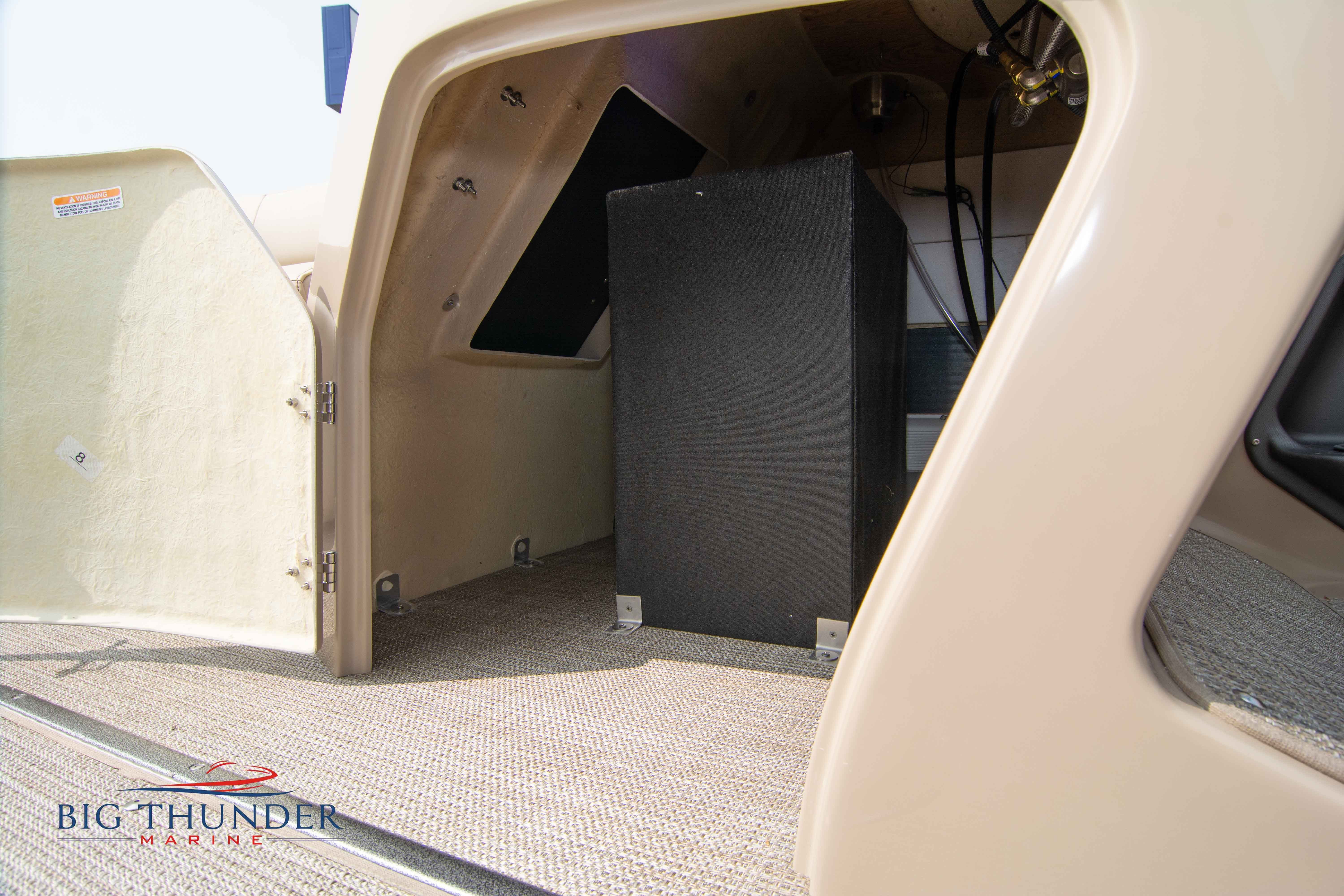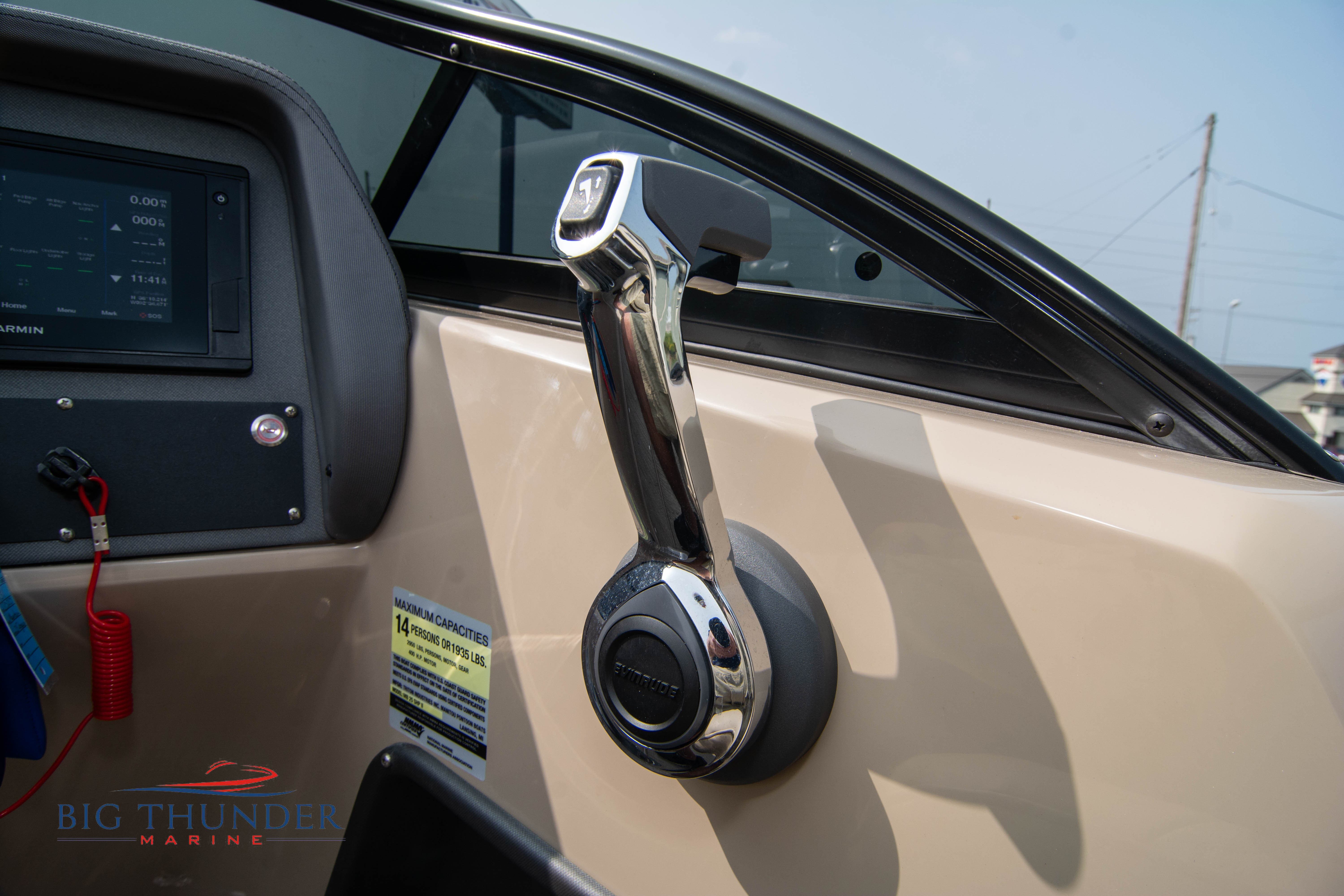 Evinrude Digital DPS Pre-Rig. Evinrude 200 E-Tec - White. Charcoal Metallic Wall Skin. Tan Two-Tone Graphics. Matte Black Powder Coating. Tan Luna Flooring. Tan Furniture. Charcoal Cover & Bimini Top. Power Arm Bimini w/ Black Anodizing & LED Lights. Blue LED Exterior Lights. Blue LED Pedestal & Table Base Light Pkg. Stereo Upgrade - Premium JL MM100 Bluetooth Stereo, (4) JL Chrome LED Spkrs., 10"" Sub & 800W Amp. Garmin Virb Action Camera w/ Standard Mounting Hardware. Garmin GPSmap XS Color Touchscreen Display w/ Gauges & Controls. Battery Charging System. Center In-Tube Storage.