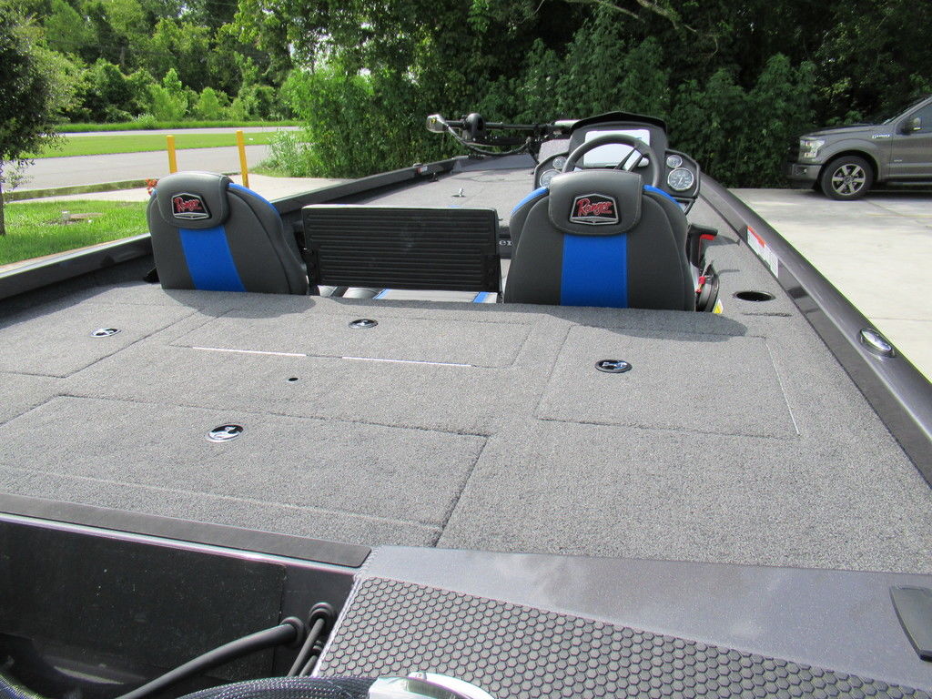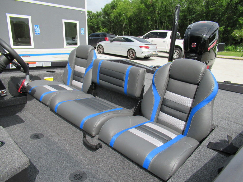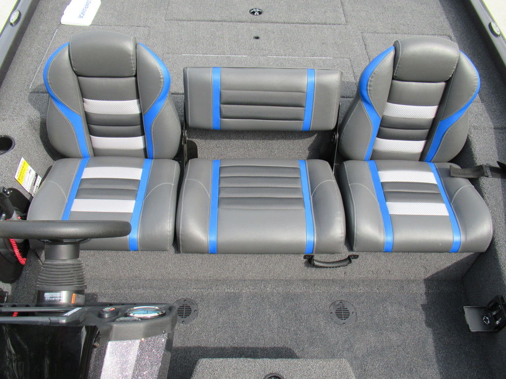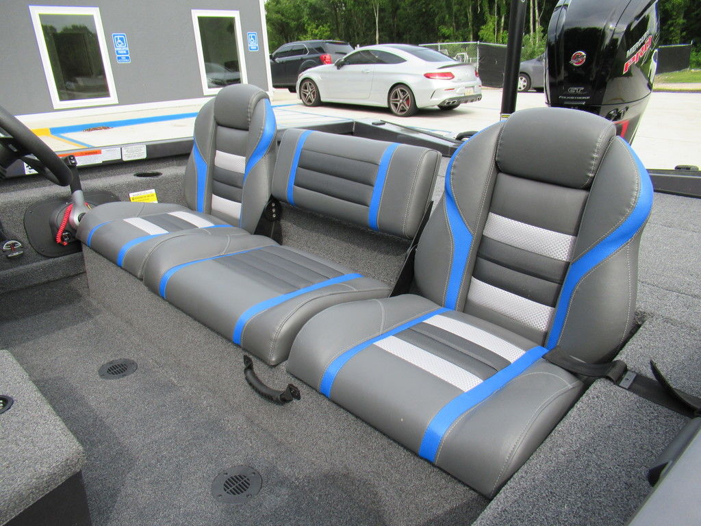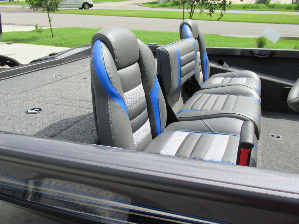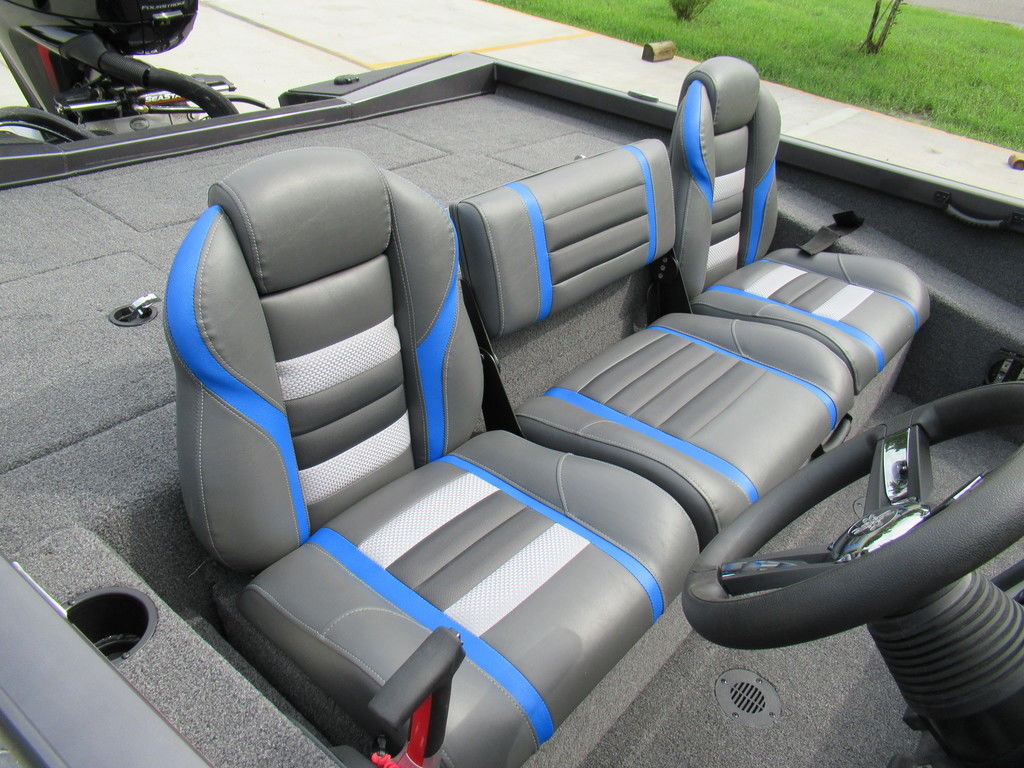 Custom fitted marine upholstery- driver/passenger bucket seating w/ center fold down & two matching fishing seats