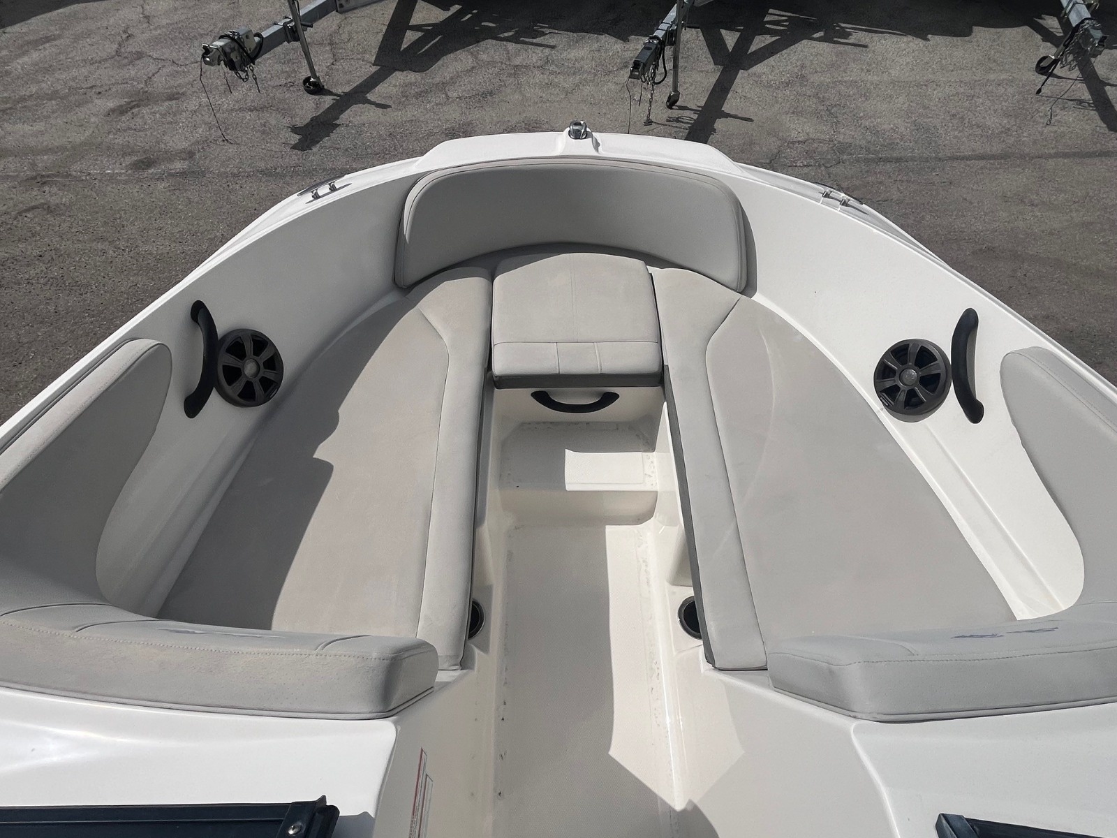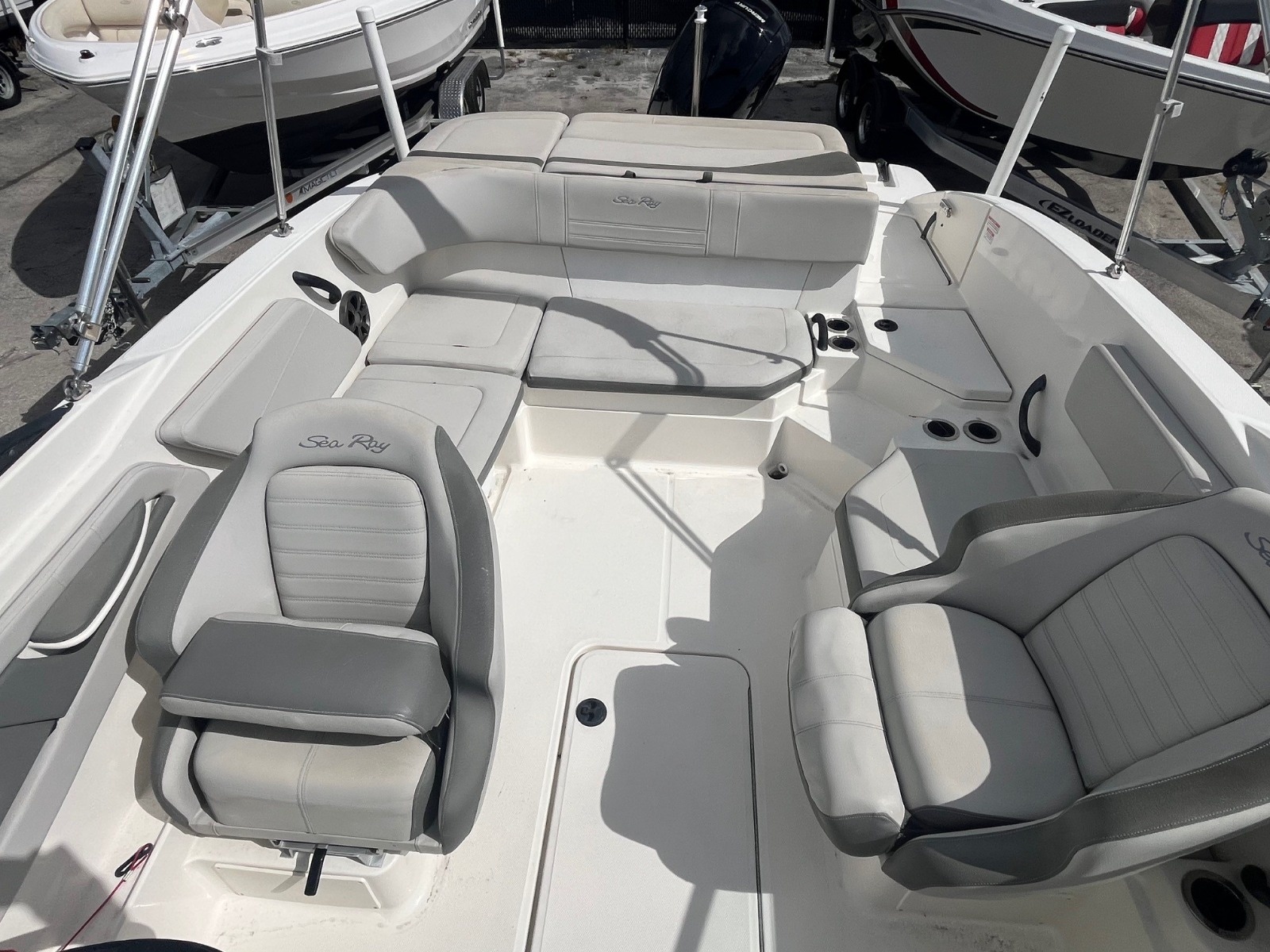 There are more than enough spaces and amenities aboard the SPX 210 Outboard to keep guests entertained all day. The self-bailing cockpit includes comfortable seating with an L-shaped bench, a convertible port companion seat that transforms into a lounger, and cooler storage. The broad bow offers room to stretch out, and the transom sunpad with a supportive backrest provides a lovely spot to lounge near the water. For added convenience, a port-side compartment can be used for storage.