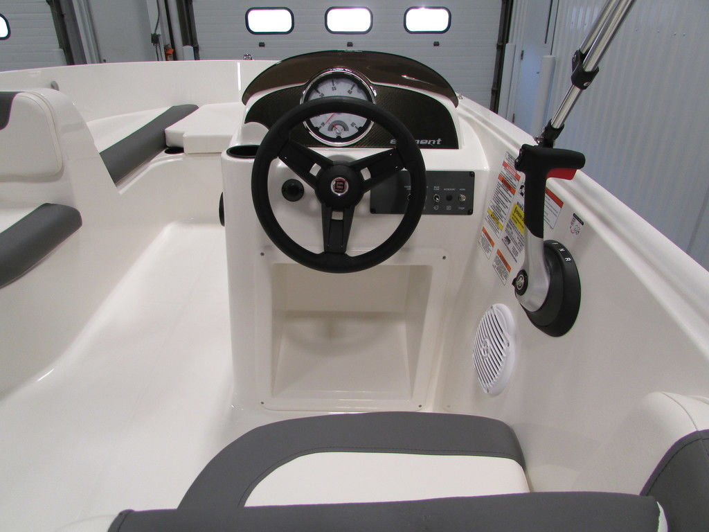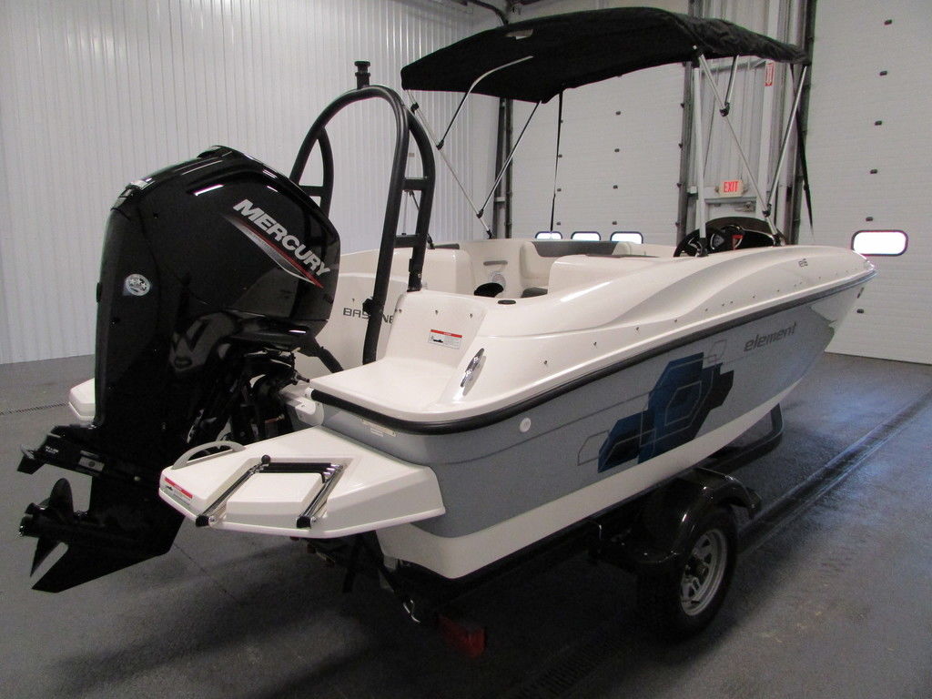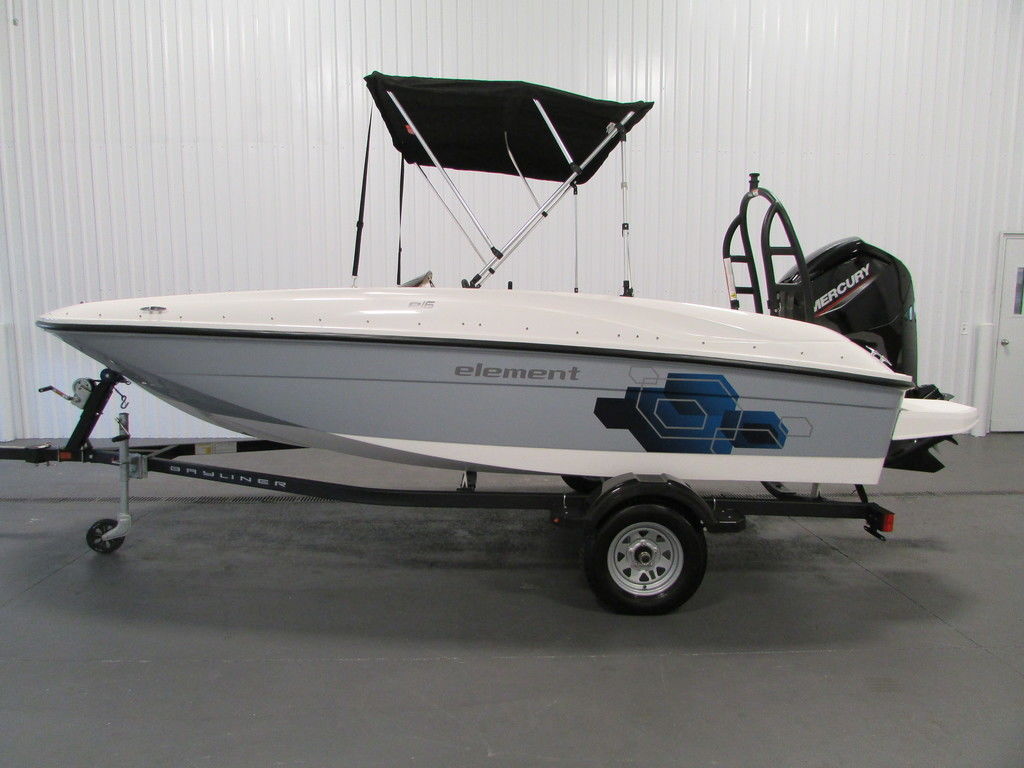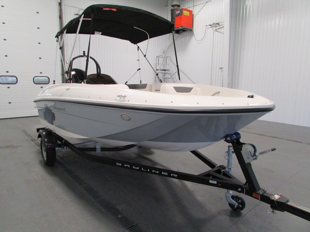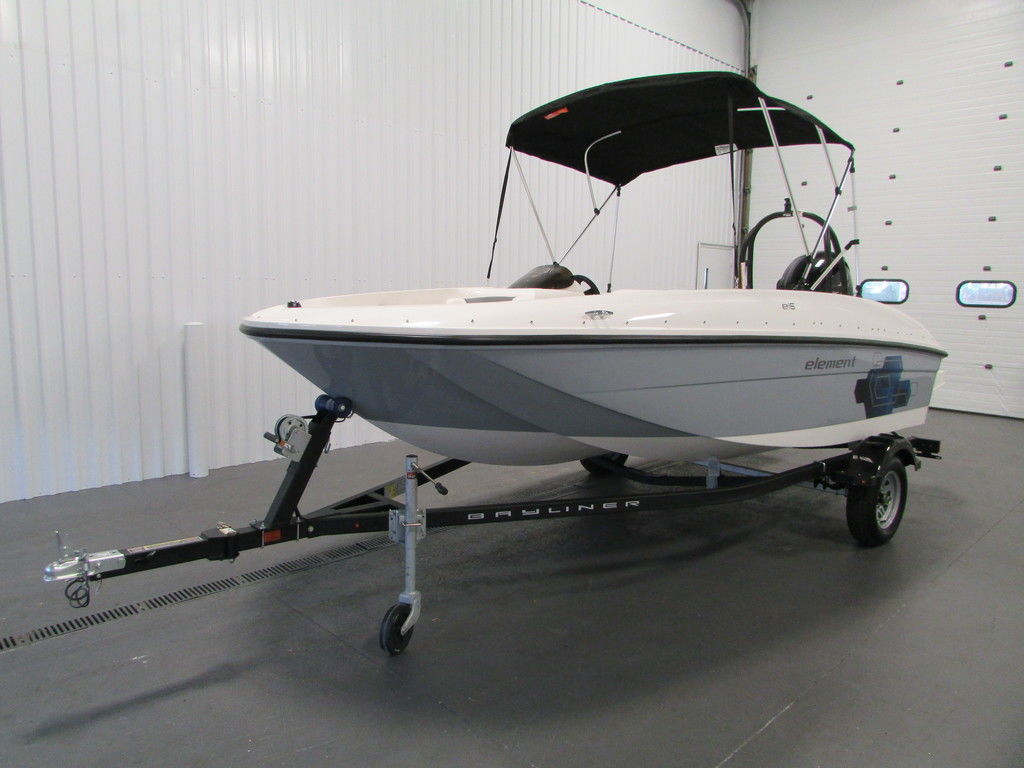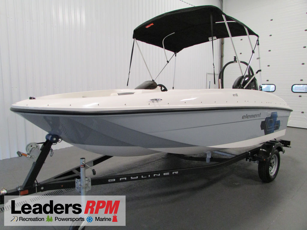 2021 BAYLINER ELEMENT E16 DECKBOAT! A 75 hp Mercury 4-stroke EFI outboard w/power trim powers this affordable fiberglass deckboat. A limited lifetime hull warranty and a 3-year factory engine warranty are included. Optional equipment includes: factory installed snap-on mooring cover, Jensen AM/FM bluetooth stereo w/AUX and USB inputs, removable bimini top w/storage boot, sports ski/tow arch, auto bilge pump, and graphite interior. Features include: starboard side helm w/removable windscreen, Faria 7” dual purpose gauge w/speedometer and voltmeter, bilge pump, electric horn, navigation/anchor lights, under seat storage, U-shaped bow seating, opposing port side seating, stern port/starboard seats, driver’s seat w/under storage, stern filler cushion for sun pad, extended driver backrest pad, passenger safety handles, beverage holders, extended fiberglass swim platforms w/3-step telescoping boarding ladder, fiberglass non-slip floor, (4) mooring cleats, fire extinguisher, marine cranking battery, 12-gallon fuel tank, and 6 person carrying capacity. Also included is a Karavan bunk trailer including; swing tongue, 13” wheels, composite fenders w/steps, bearing buddies, tie down straps, and swivel jack. Trades will be considered and delivery is available. Competitive financing rates and terms are also available. Approximate payment is $219/mo. for 120 mo. with 20% down (WAC). Leaders RPM is one of the largest marine and powersports dealers in the Midwest with over 70,000 sq ft of showroom, parts, and service under one roof located in Kalamazoo, MI. Price is plus freight, prep, sales tax/fees and is subject to change without notice. All rebates to dealer. Contact Us with questions or to request more information.