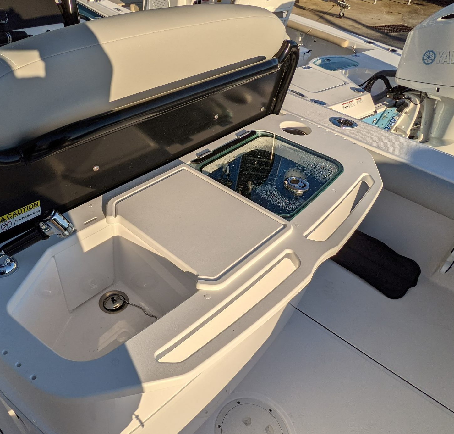 The low-profile, powder-coated bow rails and pop-up cleats combine with the casting platform/bow seating to make cast-netting live bait a breeze! The stainless steel gunwale flush mounted rod holders bedded and through bolted, in addition to the standard under gunwale rod racks, circulating live well with light, and more than 82 gallons of fishbox space makes the 273cc a ready-to-fish machine. The most comfortable place to sit on any boat while underway is the stern and the 273cc provides two incredible foldaway seats on either side of insulated storage.