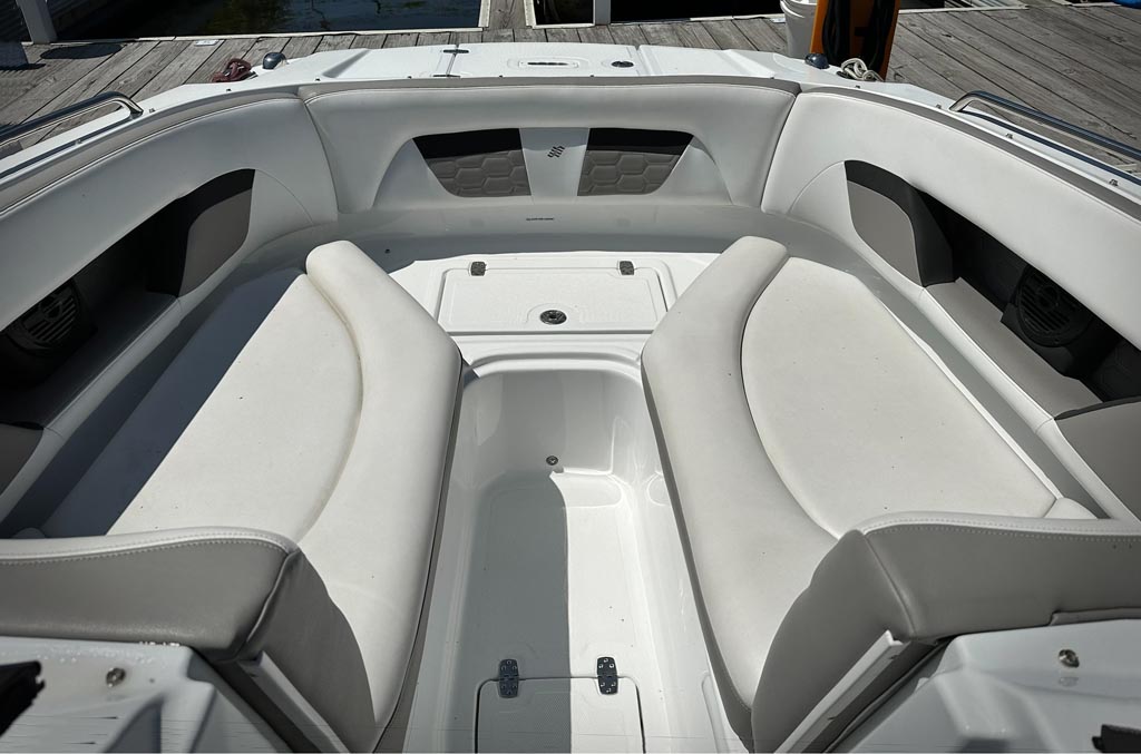 Luxury, class, and style all speak of the HD5. Whether you enjoy a smooth ride or anchoring off the sandbar, she’ll be ready. Quality amenities such as the self-bailing cockpit, stern lounge, and head compartment give this boat plenty of flexibility; all she needs is a family and a captain.