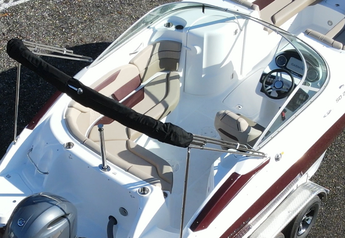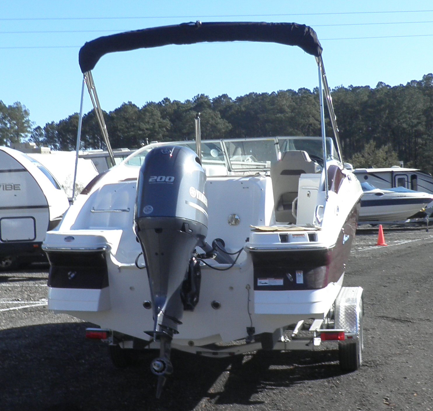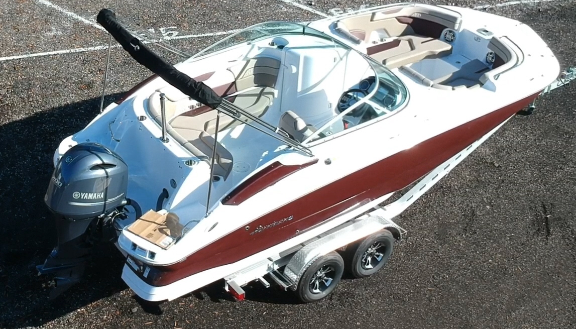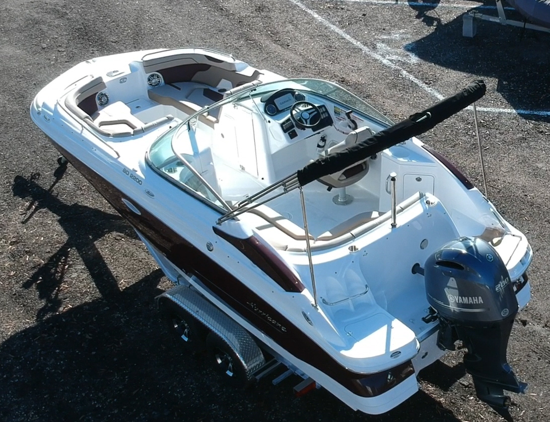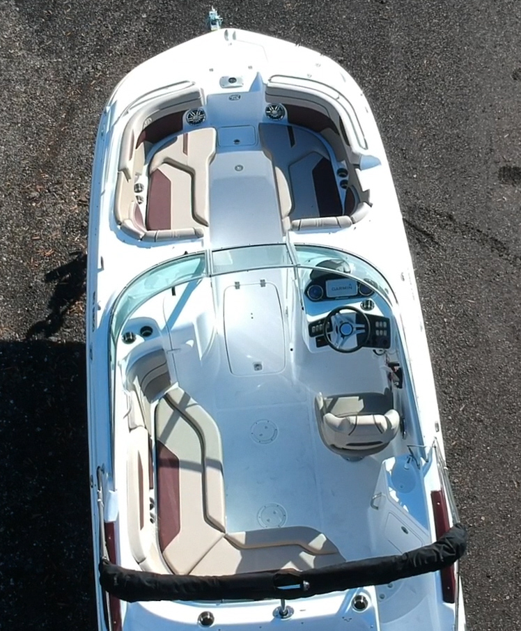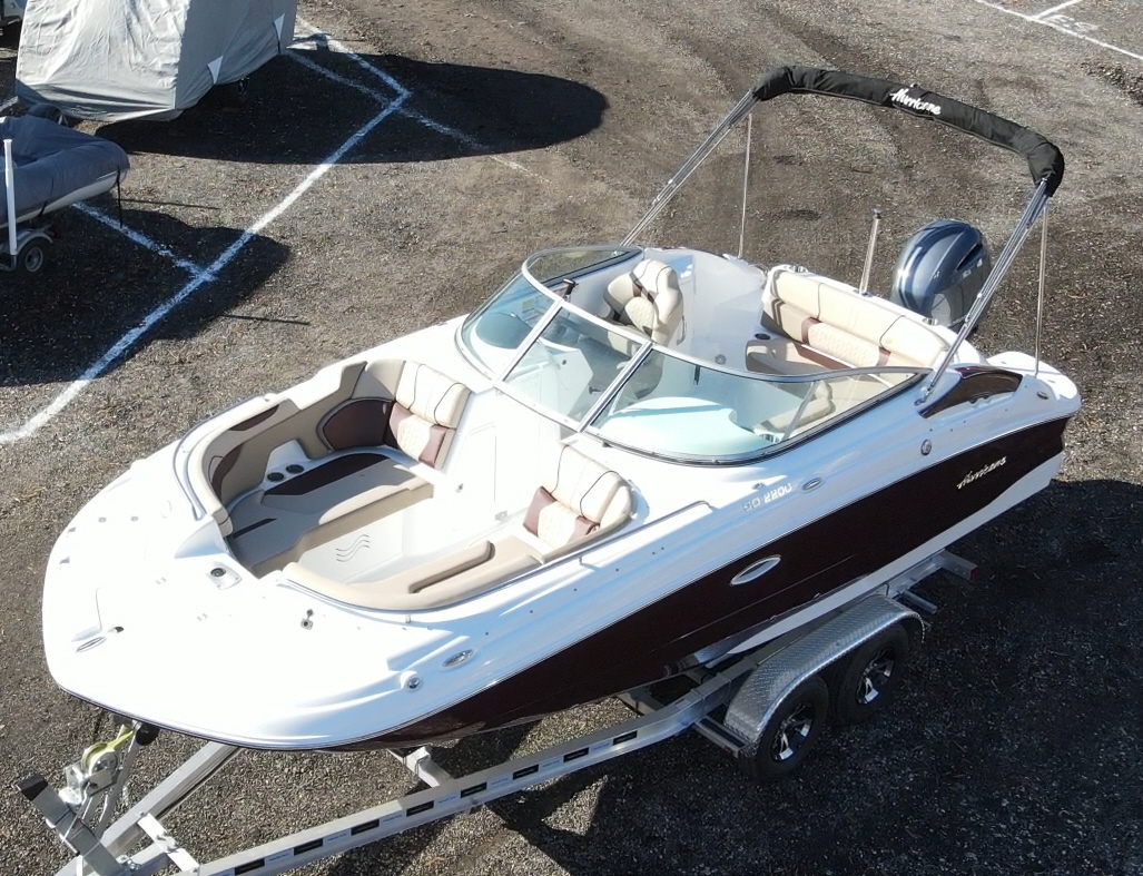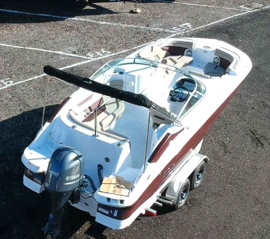 Complete with: Fishing Package, Boat Cover, Stern Wash Down, Dual Battery Switch. Porti Potti, Stainless Steel Black Canopy with Protective Boot , Garmin EchoMap Plus 63 Fishfinder/Chartplotter, Hydraulic Sea Star Steering with Tilt, Stereo and a Dual Axle Aluminum Trailer. Max HP: 250 hp