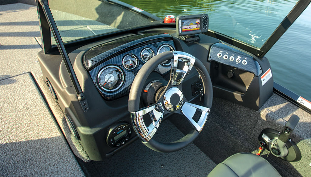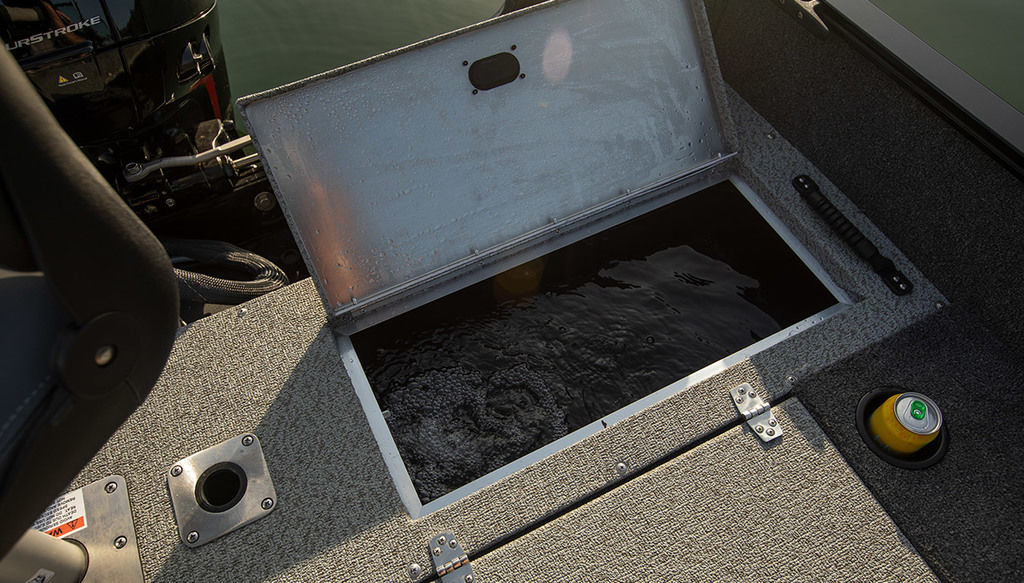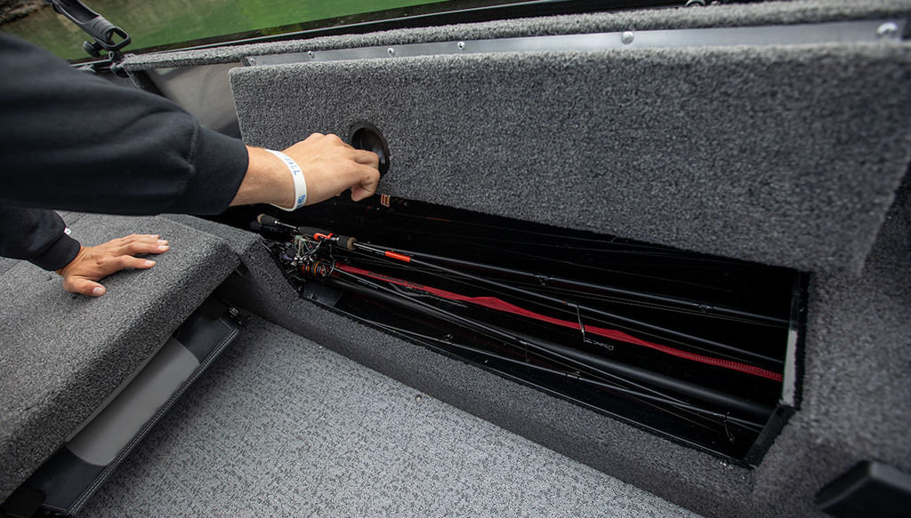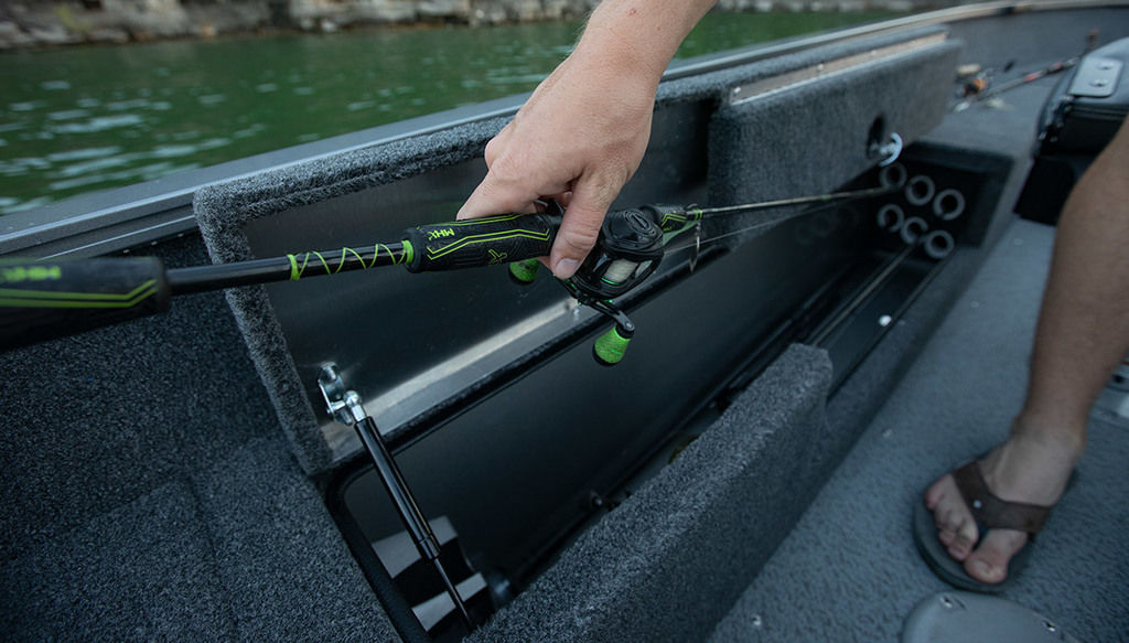 Introducing the FM1675 WT. This Deep-V walk-thru is a true fishing machine. At 16’9” long and 86” wide, there is a ton of room to fish and move about. Two livewells to hold all of your fish without having to go back and forth—an aerated 19-gallon livewell in the stern and another aerated 14-gallon livewell in the bow. There are lots of built-in storage too, including a side rod locker and trolling motor battery storage near the bow. This year we also have a redesigned rear deck conversion bench option and an all-new adjustable gunnel cleat system.