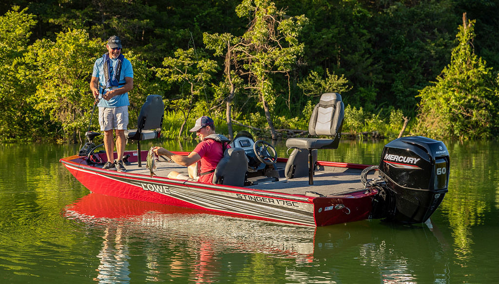 No doubt about it, the Lowe Stinger 175C outpaces the competition, with incredible multi-species functionality, loads of room to maneuver, and premium components that give you the edge. Fold-down driver and passenger seats with center seating accommodate you and your fishing buddies in comfort. An intuitive side console helm with easy-to-read gauges puts you in complete control of the strong, reliable Mercury outboard engine—up to 75 horsepower. Stowaway all your gear in the ample storage onboard and speed to your favorite fishing spot—your trophy bass awaits! Reel ’em in and see why, feature for feature, inch for inch, the Stinger 175C is top of its class.