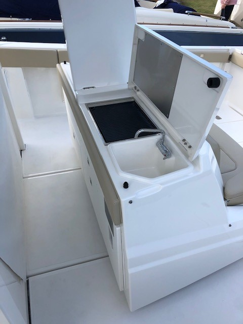 Enjoy a full day of fishing from the ample cockpit until its time to socialize. Then experience our groundbreaking new featurethe patent-pending entertainment center that moves into place at the touch of a button providing uncompromised functionality.