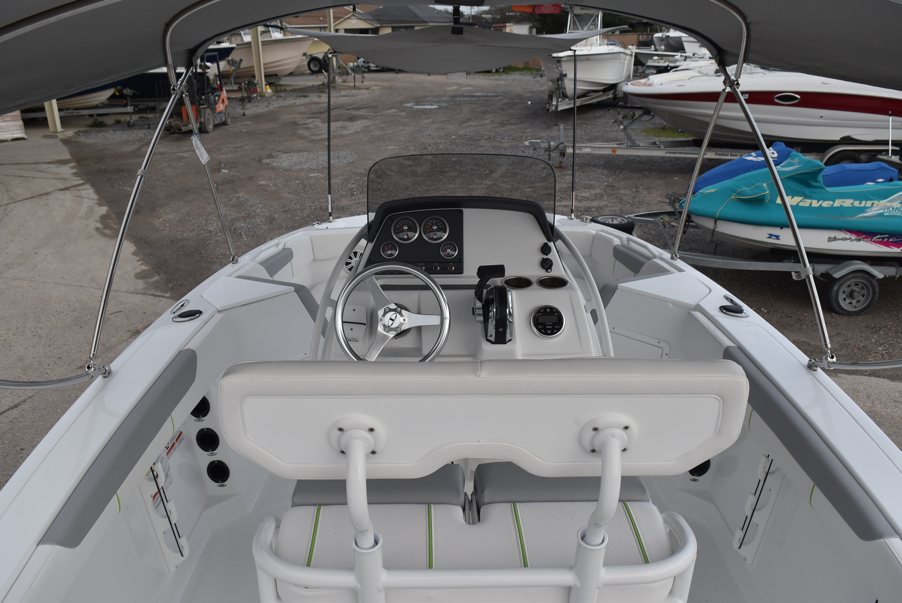 Front-access, in-console storage compartment w/room for optional portable toilet (works w/drop-down Bimini top curtain)
