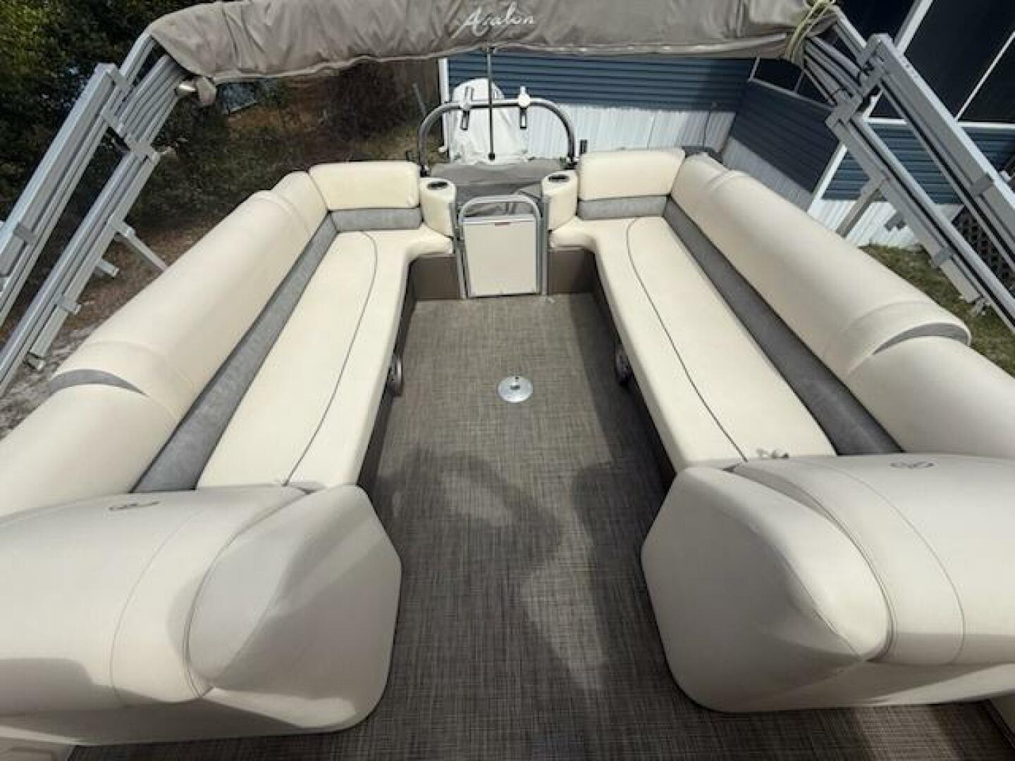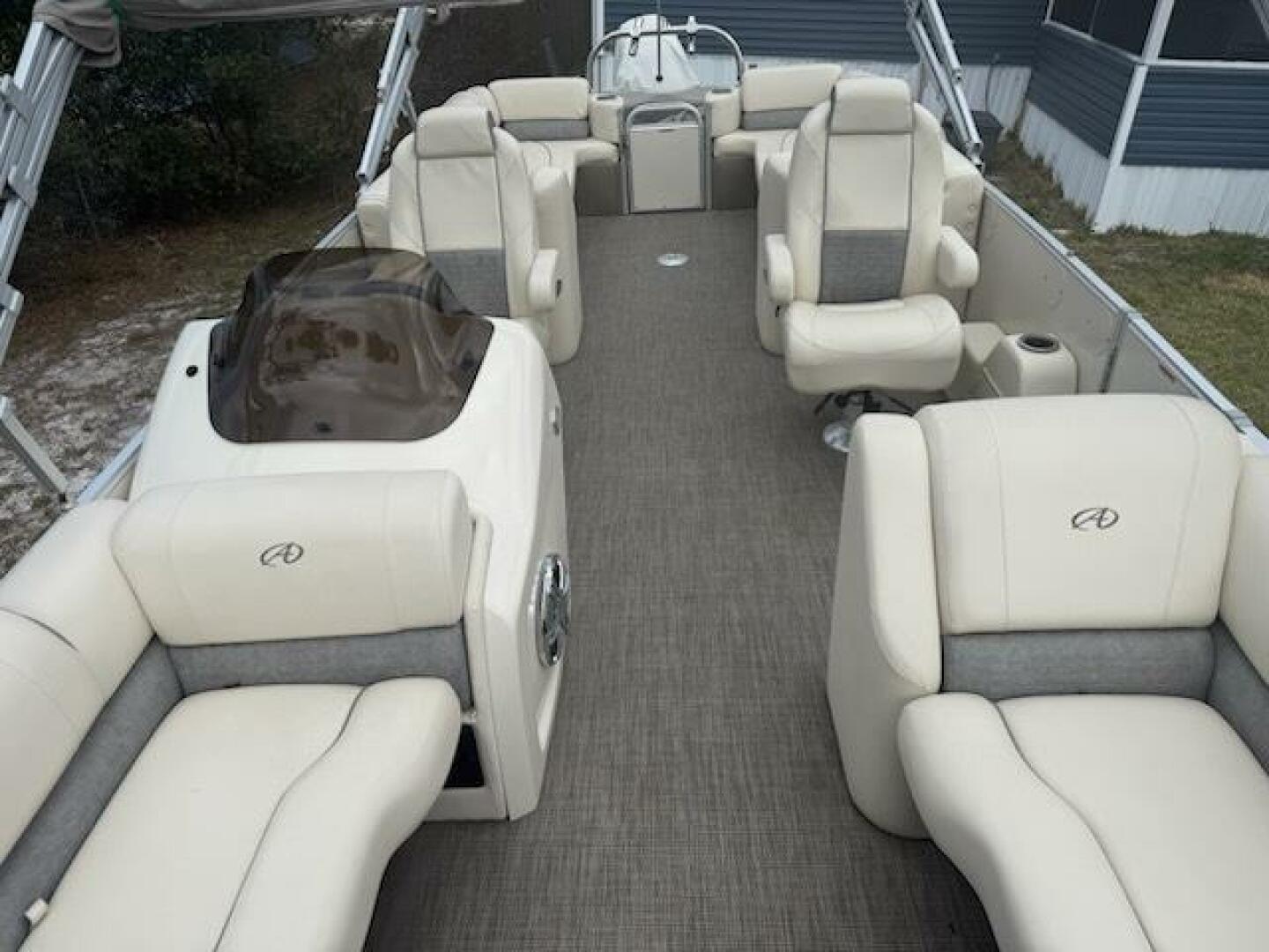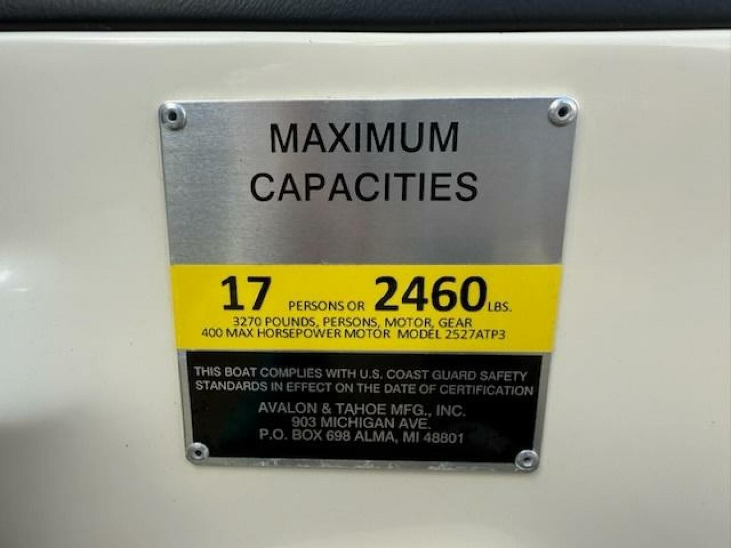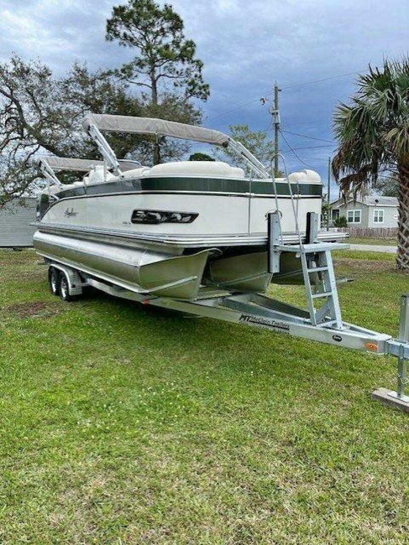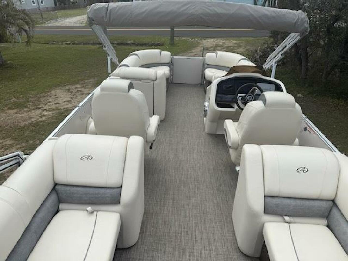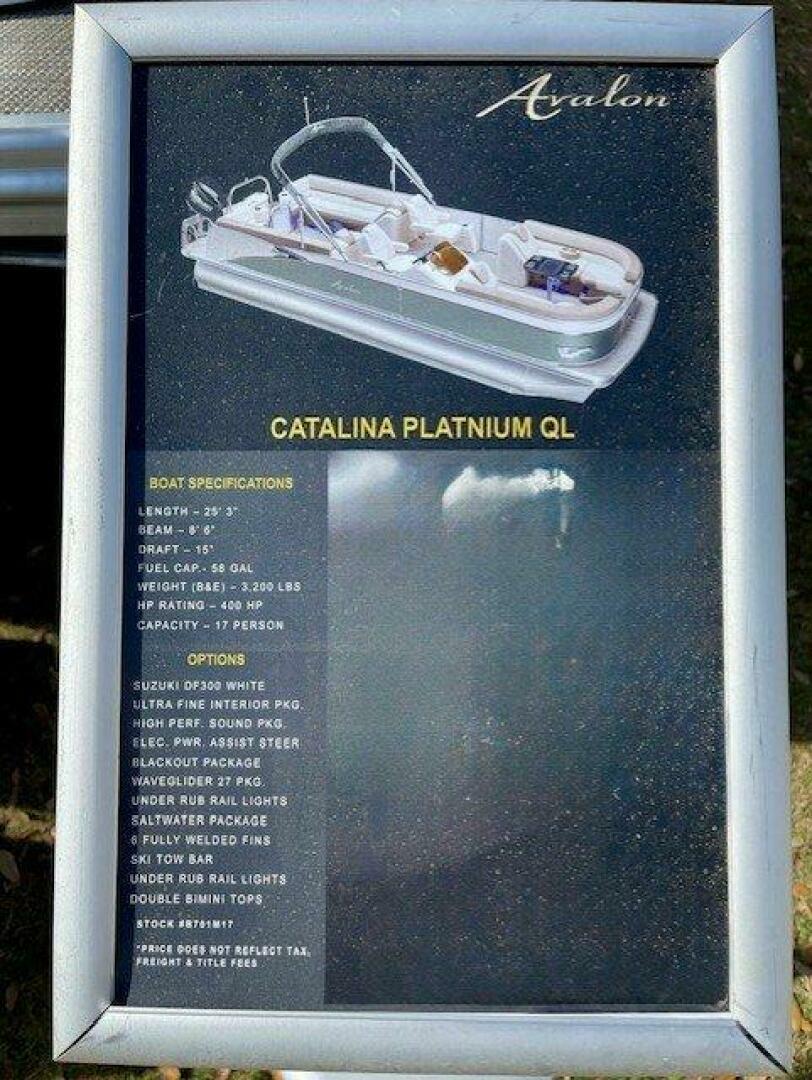 Avalon Saltwater series Catalina Platinum QL series Tritoon.This boat is loaded and only has 19.4 hours on it. It just had its 20-hour service and is ready to go for the water.This is a 25' Tritoon with Dual Bimini tops, and a 300 HP Suzuki Outboard. It was purchased New in March of 2023 and I am the original owner. Motor was flushed after every use. Boat comes with remainder of the transferable factory warranty. Includes all the safety gear needed for the water. This has rated capacity for 17 peoplePrice includes matched Aluminum Trailer!! List of Options included:Ultra Fine Interior Package -features a premium vinyl upgrade with a focus on comfort and style, including option Ultrafine touch vinyl, high-back reclining chairs, and upgraded flooring. Fusion 1000W High Performance sound PackageGarmin GPS/ Depth FinderElectric Power Assist SteeringBlack Out PackageWave Glider 27 Package- features triple 27-inch pontoons with high-performance lifting fins, designed for superior buoyancy and performance, offering a stable and smooth ride, even in rough waters, with enhanced fuel efficiency. Under Rub Rail Lights Saltwater Upgrade Package-include zinc anodes, additional fuel/water separators, and sealed keels. 6 Fully Welded FinsSki Tow BarDouble Bimini TopsFuel Capacity 58 gallonsRated for 400HPDual BatteriesUnder Seat StorageChanging Curtain All required Coast Guard equipment plus Anchor, Dock Bumpers, Dock Lines!The interior is flawless, all seats are in like new condition. Boat was cleaned and wiped down after each use. Boat runs perfectly and it really moves. Top speed is 45MPH and handles great. Boat was always covered when not in use. Boat comes with custom cover.