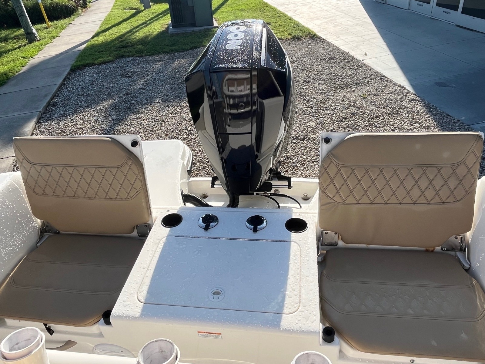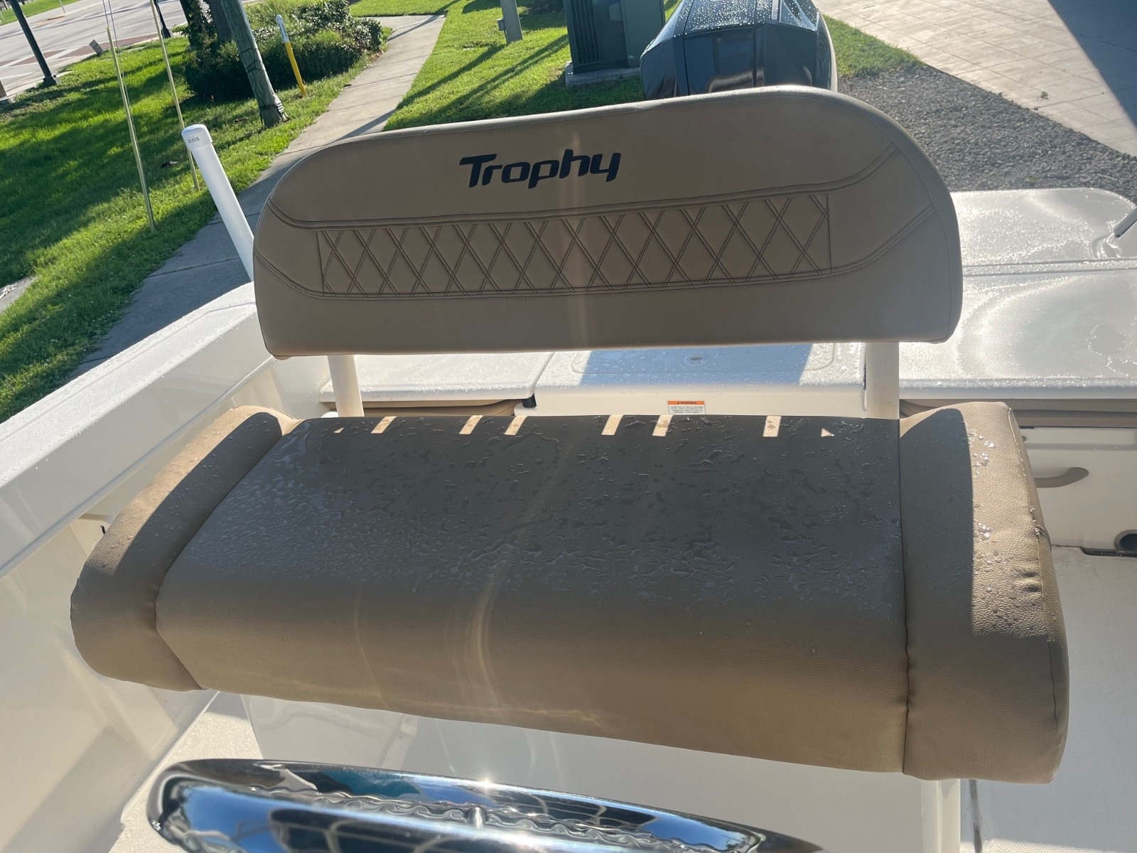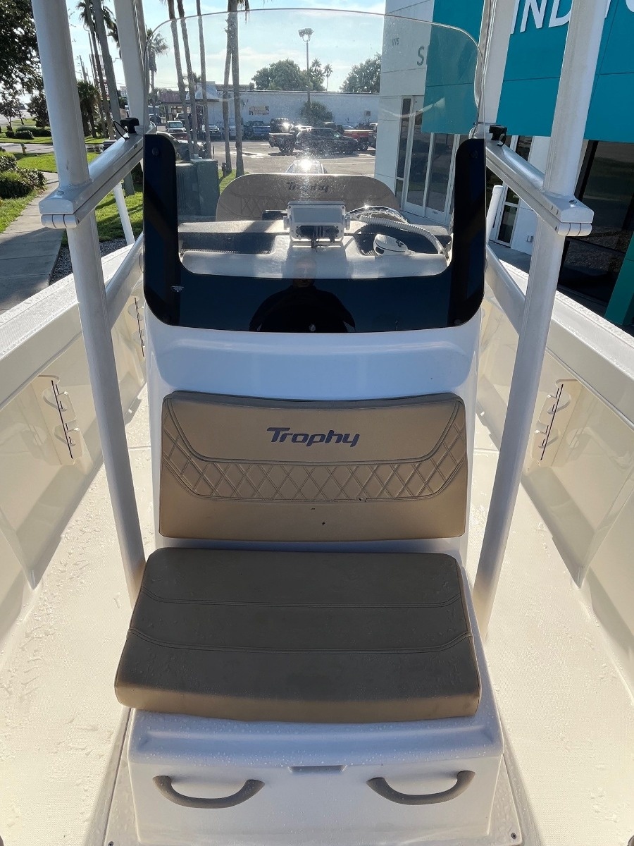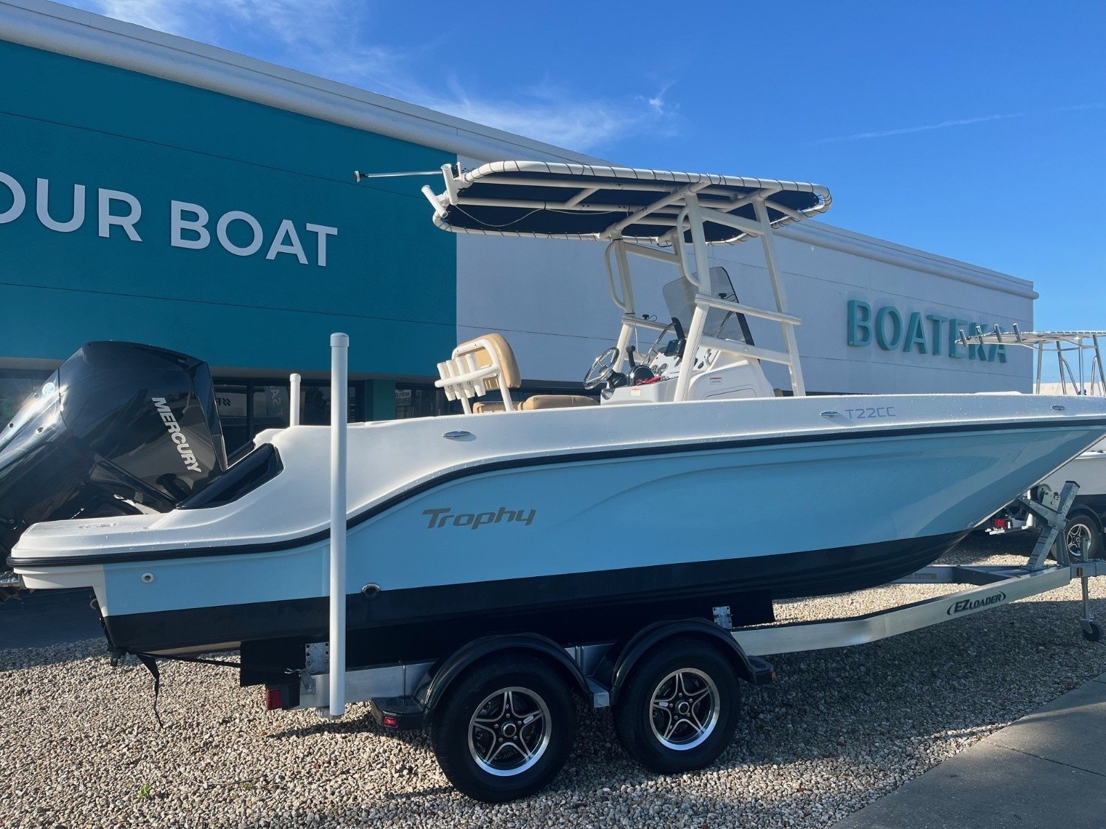 This certified pre-owned Trophy T22 is eligible for Boateka's limited-time financing offer! Secure this center console today with financing as low as 4.99% APR* now through August 8. Use promo code "FINANCE25" to claim at your local Boateka dealership. The T22CC offers the perfect balance of fishing adventure and cruising comfort. Highlights include a deep V-hull, a broad bow for casting or lounging, comfortable aft bench seat, livewells, plus a dry-riding interior ensures an enjoyable ride to your favorite fishing spot or waterfront restaurant. Anglers and non-anglers alike appreciate the easy cleanup of the self-bailing cockpit and the convenience of an enclosed head compartment at the center console. Optional equipment like a ski tow pylon make the T22CC even more versatile.