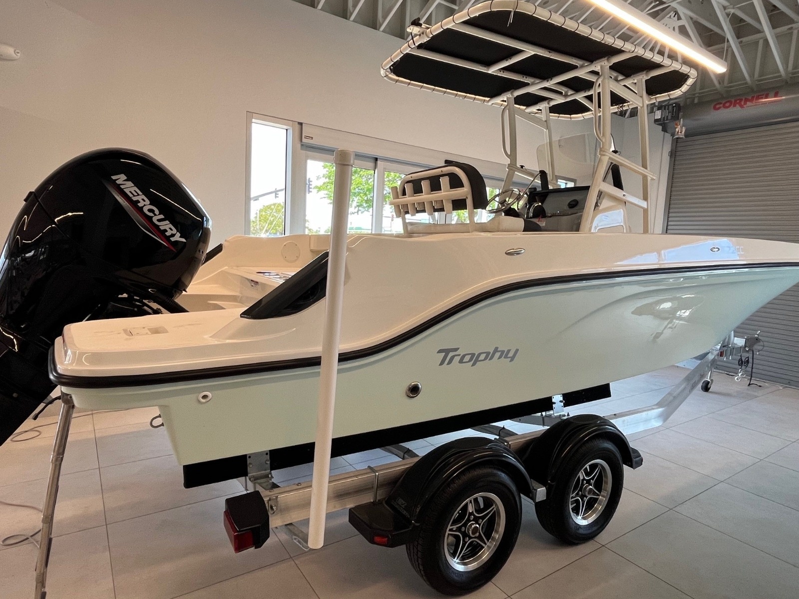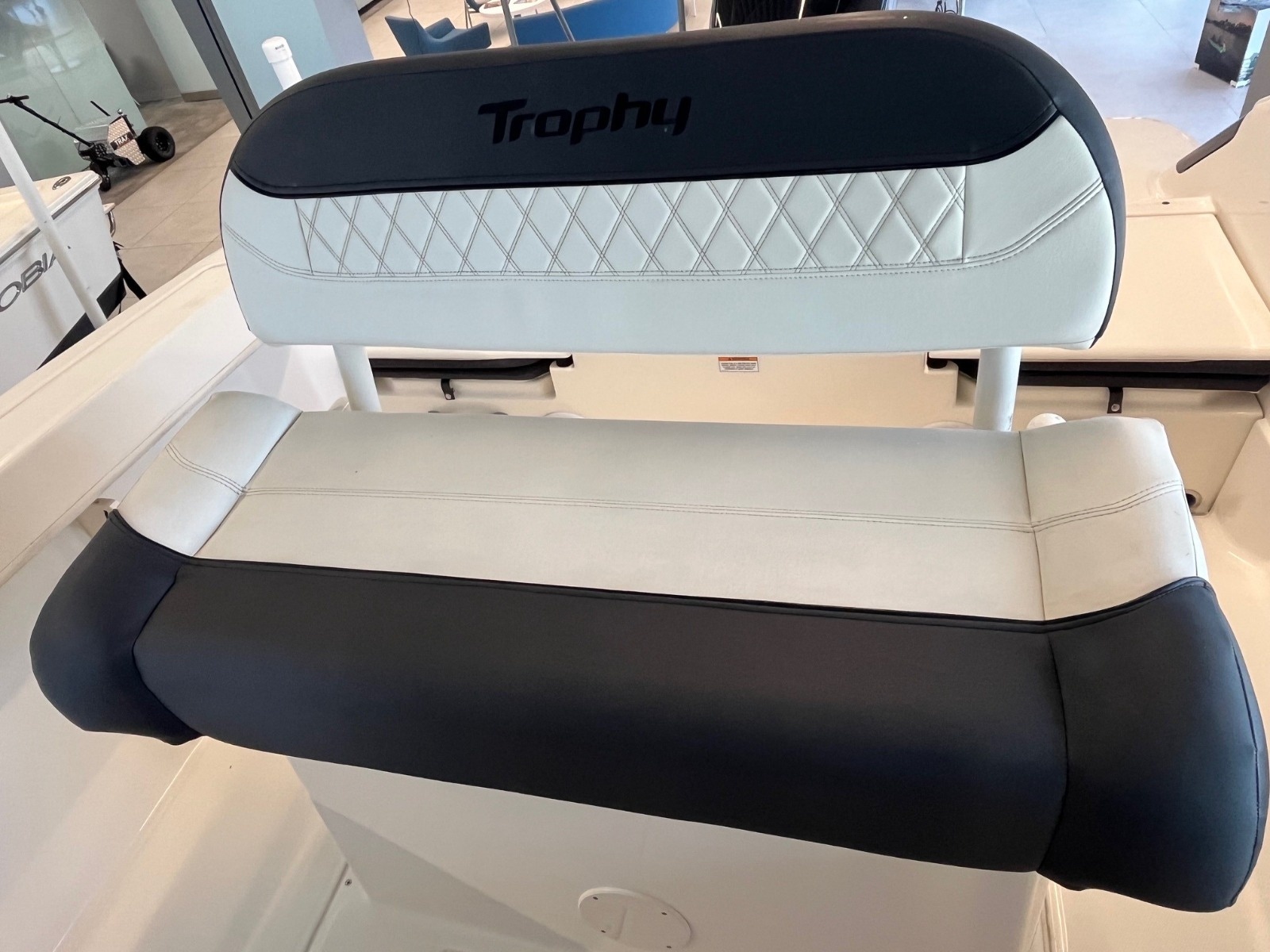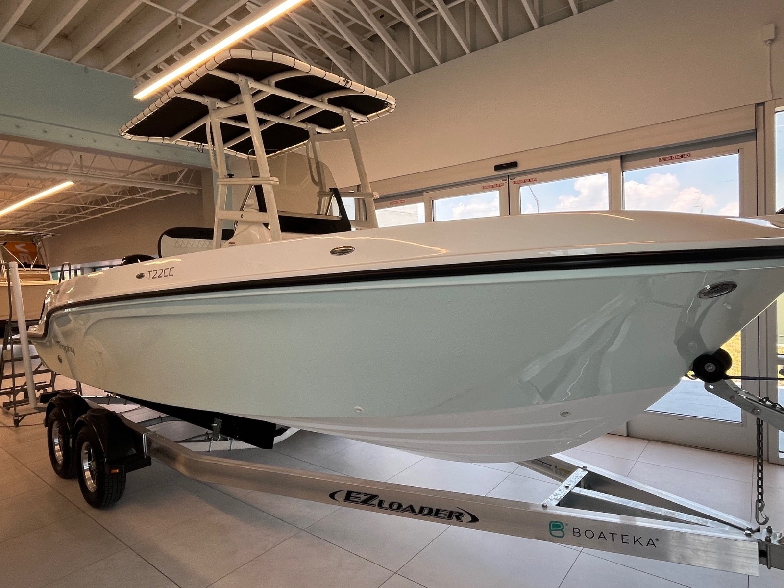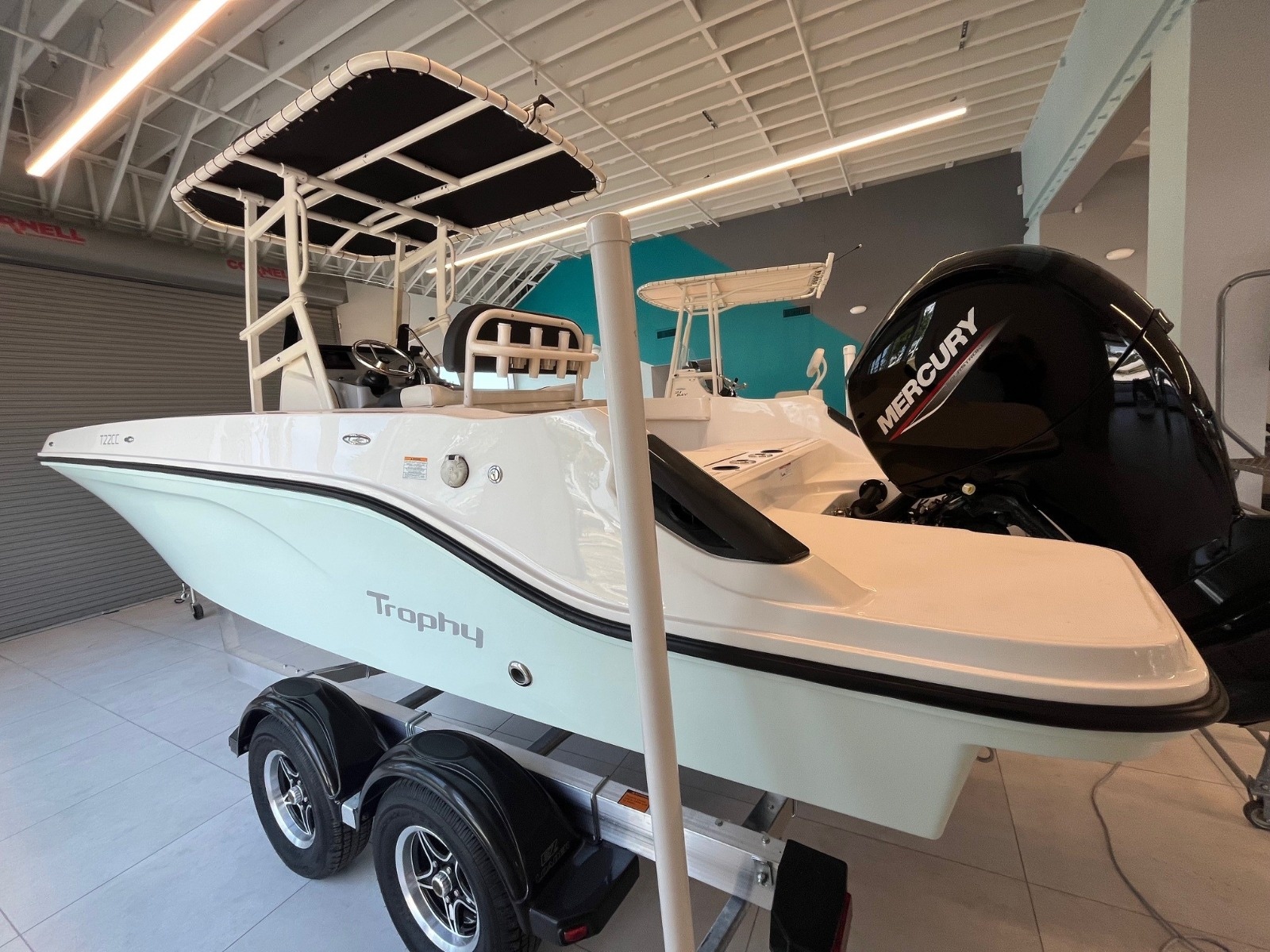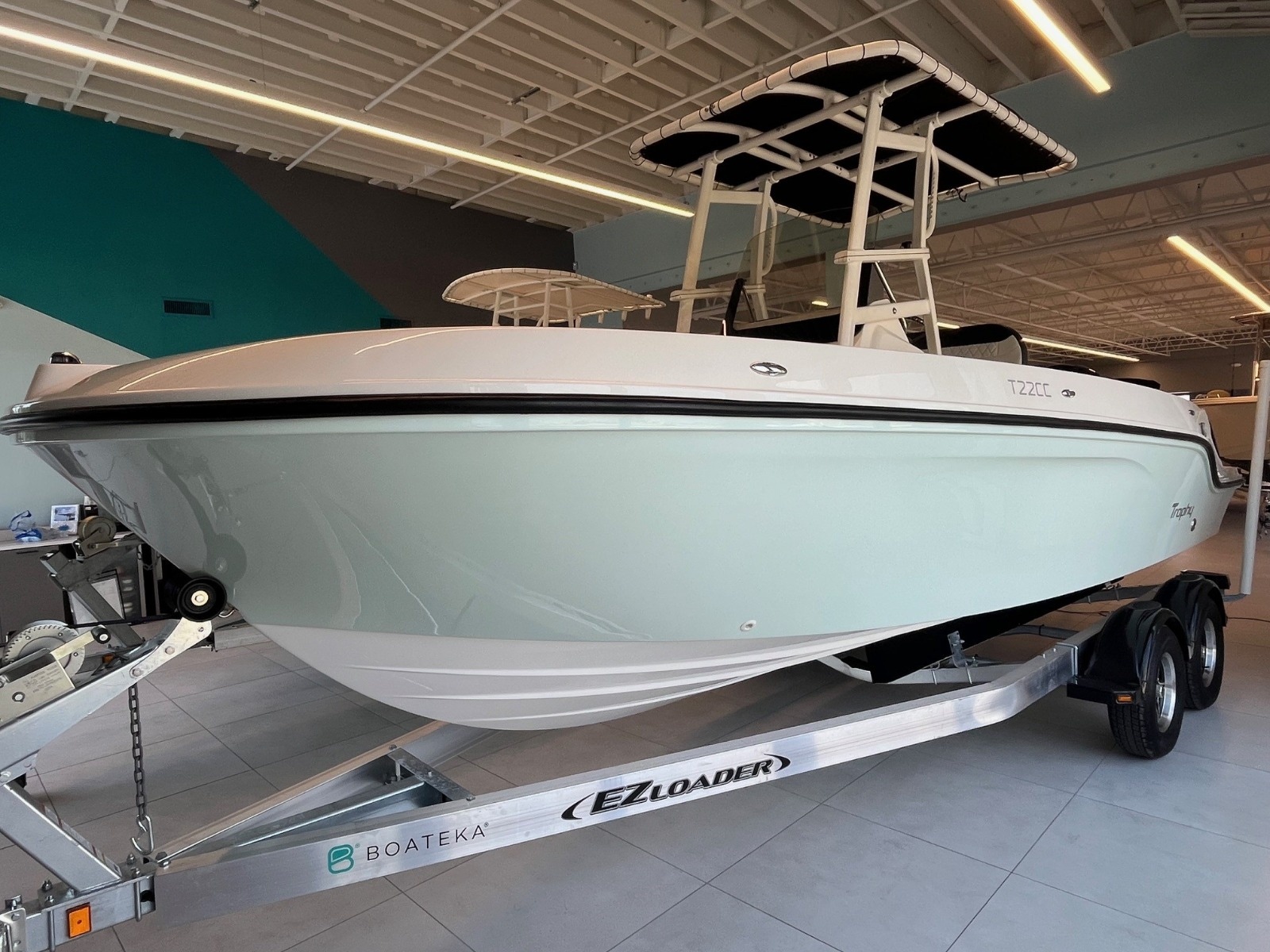 This certified pre-owned Trophy T22 is eligible for Boateka's limited-time financing offer! Secure this center console today with financing as low as 4.99% APR* now through August 8. Use promo code "FINANCE25" to claim at your local Boateka dealership. The T22 CC offers the perfect balance of fishing adventure and cruising comfort. Highlights include a deep V-hull, a broad bow for casting or lounging, comfortable aft bench seat, livewells, plus a dry-riding interior ensures an enjoyable ride to your favorite fishing spot or waterfront restaurant. Anglers and non-anglers alike appreciate the easy cleanup of the self-bailing cockpit and the convenience of an enclosed head compartment at the center console.
