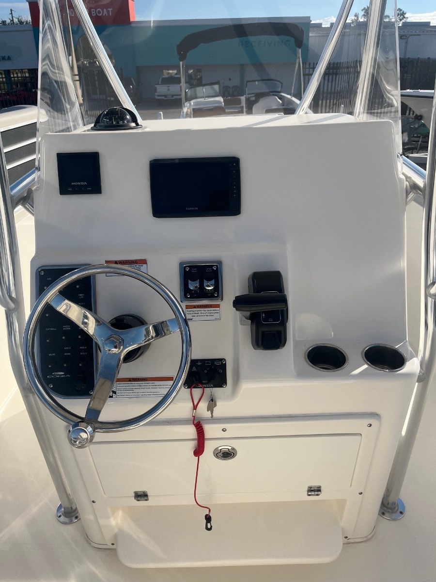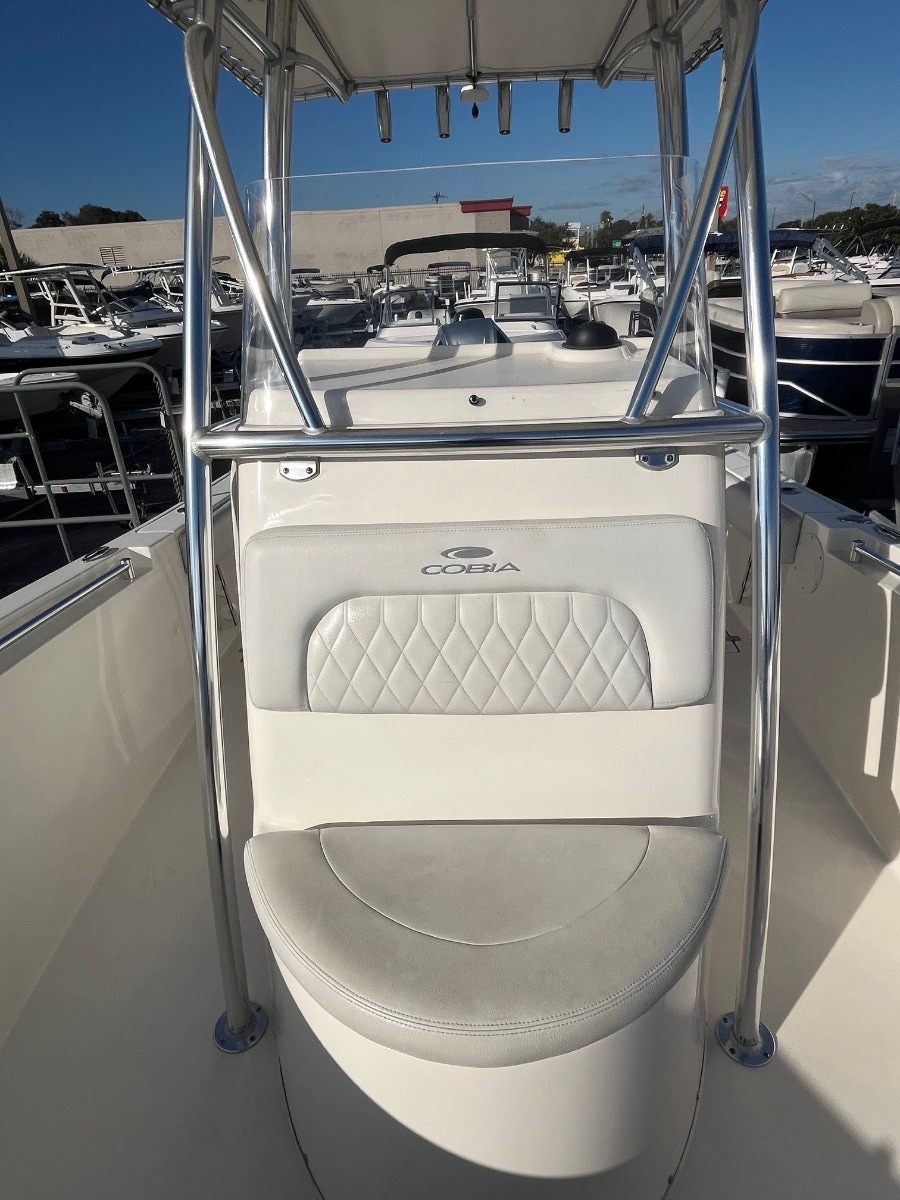 This certified pre-owned Cobia 237 CC is eligible for Boateka's limited-time financing offer! Secure this center console today with financing as low as 4.99% APR* now through August 8. Use promo code "FINANCE25" to claim at your local Boateka dealership.  Tried and true, the venerable 237 CC gives you all you need in fishability and family cruising comfort. A stem to stern level deck, flush mount hardware, recessed bow rail, and hideaway aft bench seating provide a roomy and uncluttered fishing platform. Add to that standard features like an aerated 28 gallon livewell and two, in-deck 40 gallon fish boxes and this boat comes tournament ready. The 237 CC’s smart layout makes it just as comfortable as it is fishy. Whether sandbar hopping or going for a sunset cruise, a perfect blend of seating, storage space, and cockpit room makes for a relaxing and enjoyable experience. And like all Cobias, the 237 CC is built to ABYC standards, the highest in the marine industry, so you can be confident that there’s no safer or better built boat on the water.