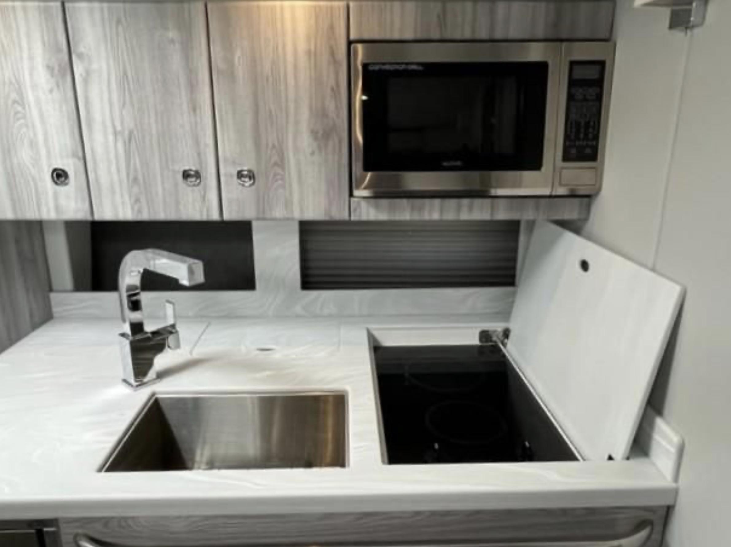 - Stainless Steel Sink, Factory Installed upgraded Kitchen faucet, 2 Burner Stove, Stainless Steel Frig / freezer, Microwave/convection