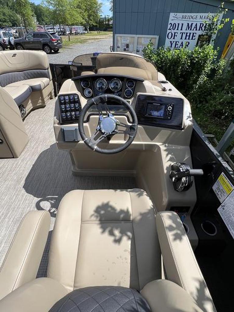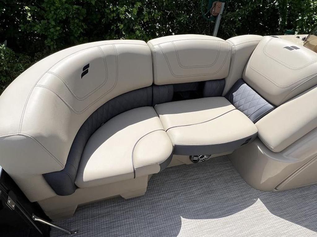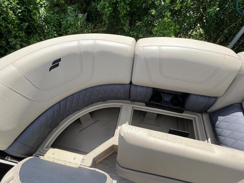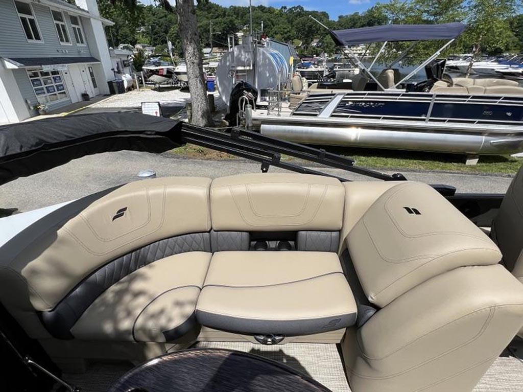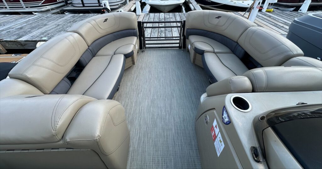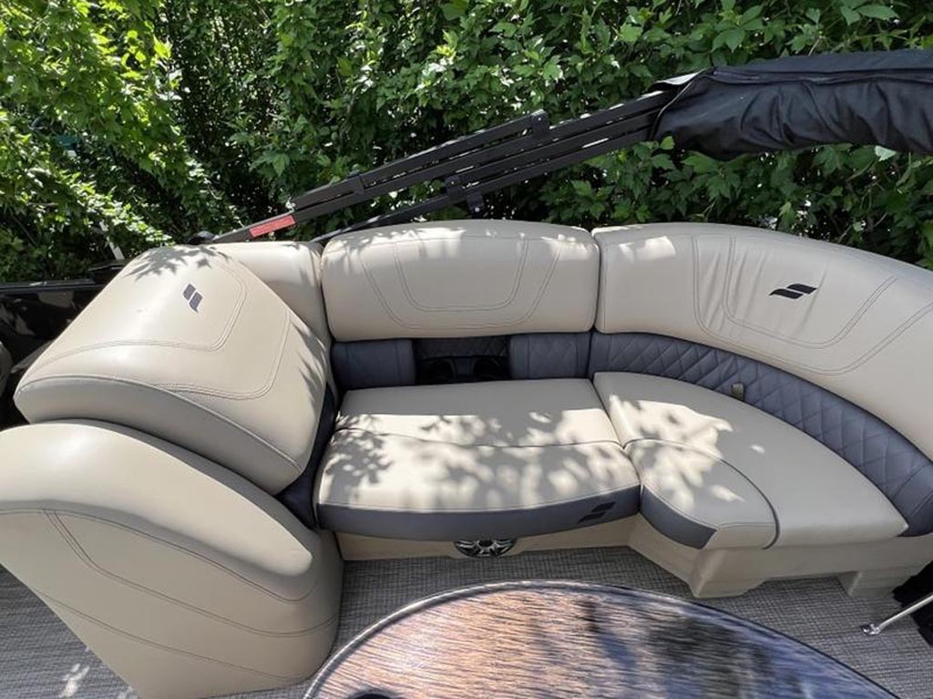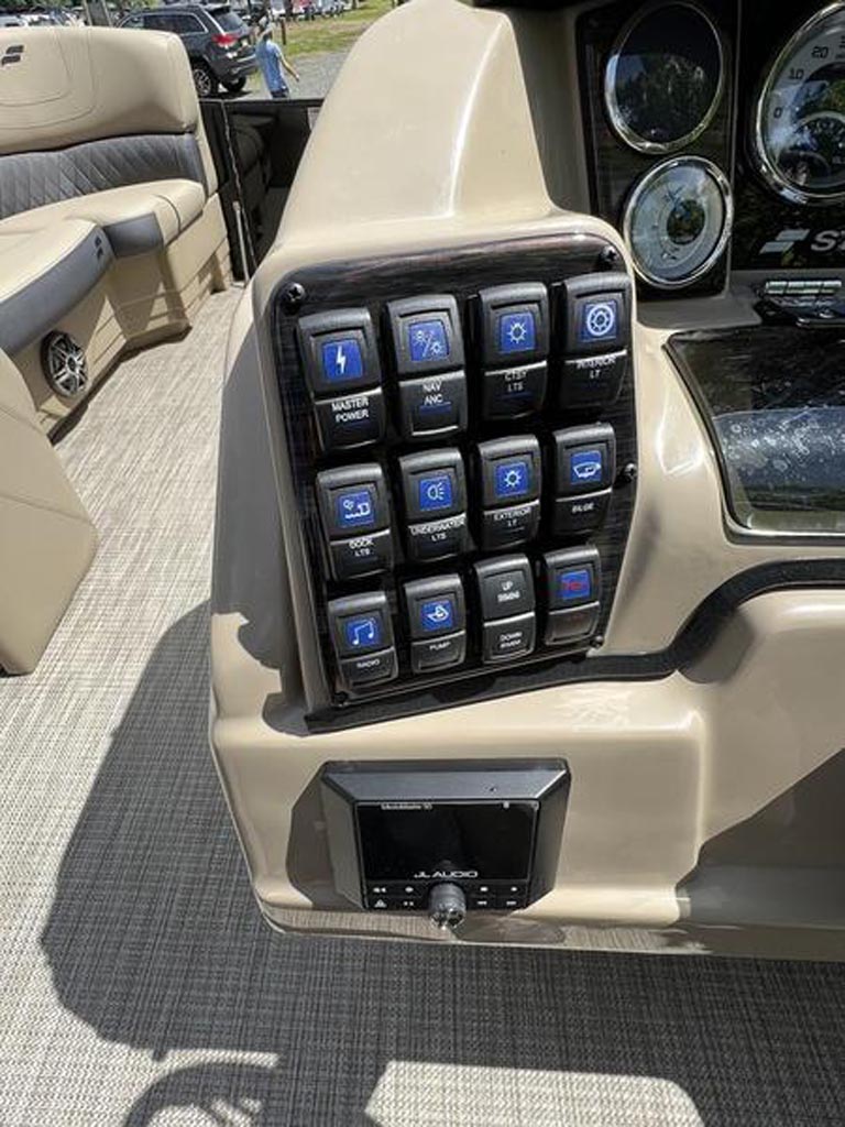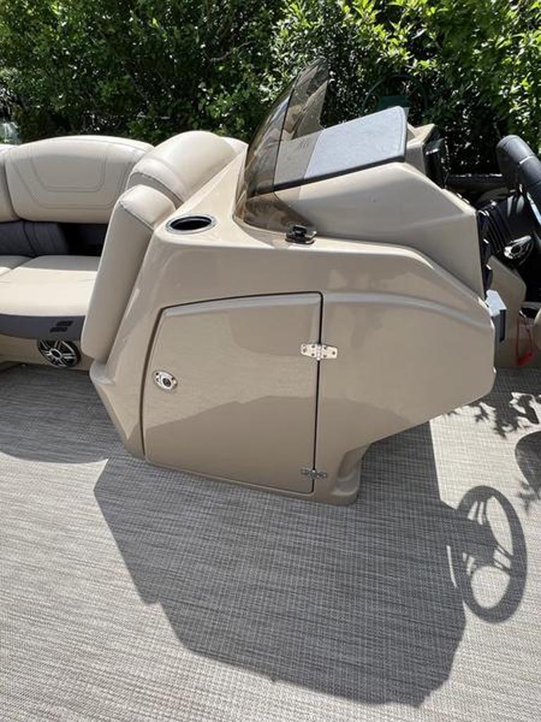 Comes with all standard options. Additional features include full brown seaweave flooring, black playpen cover, powered bimini top, Graph Helix 5 GPS flush mount, coastal package, and deluxe extended deck ski tow.