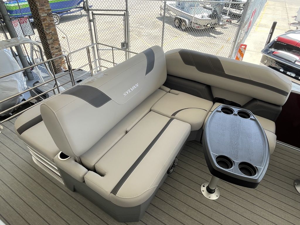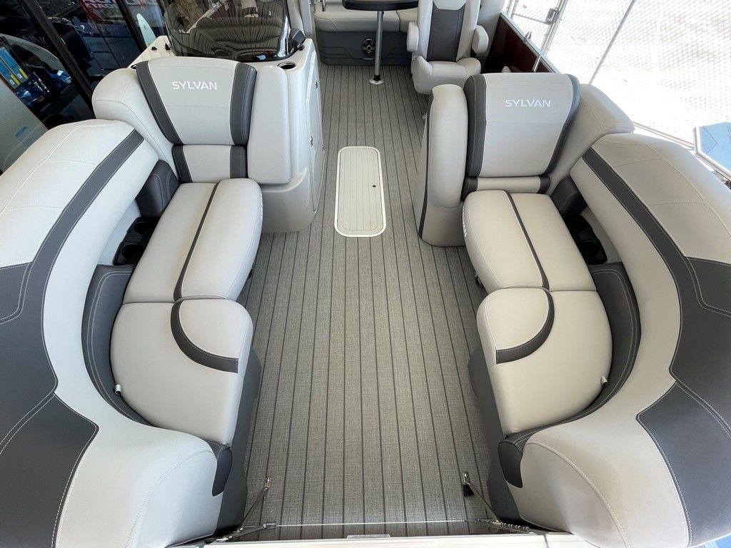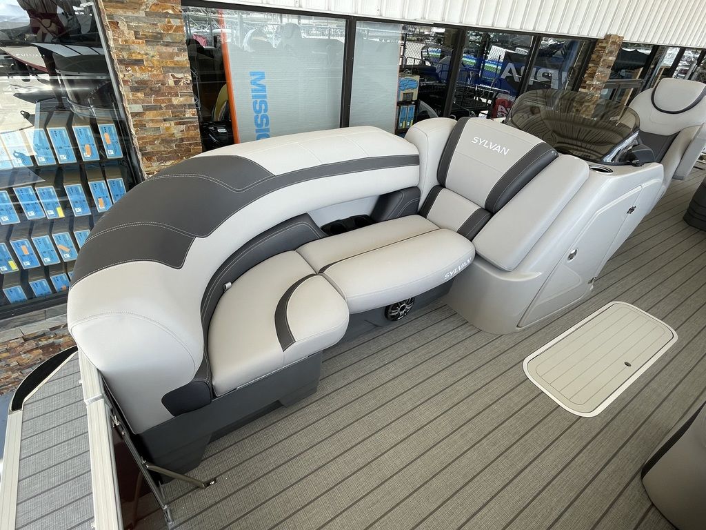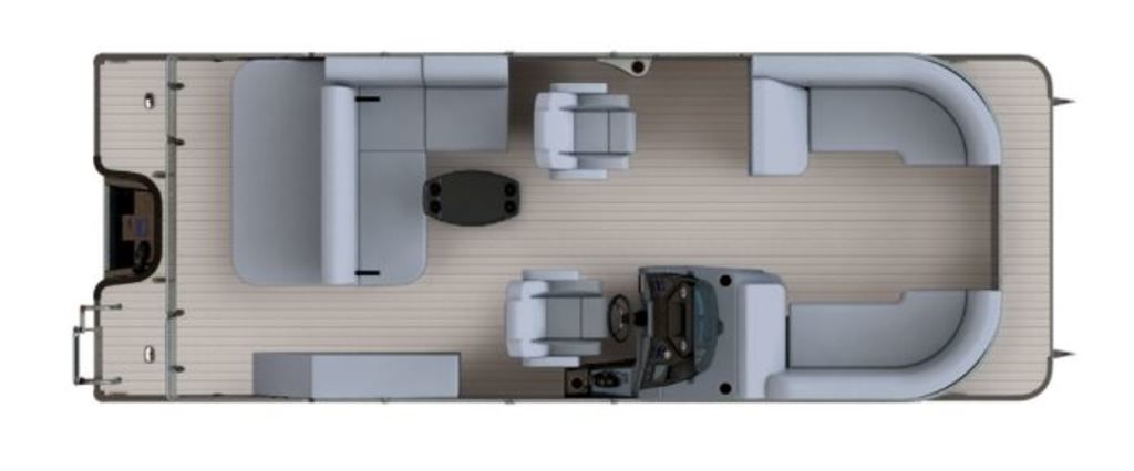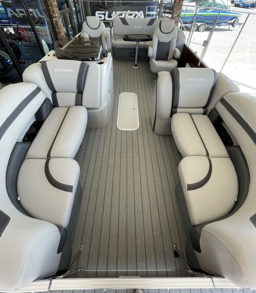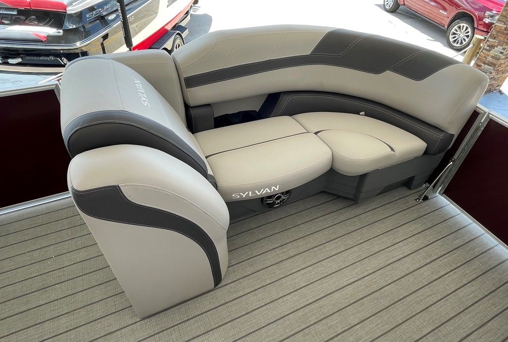 The L-3 CLZ by Sylvan offers a flip back seating arrangement in the rear of the pontoon and dual helm chairs. Flip back to have a dual facing rear lounge with a large rear cushion, or flip forward for the traditional L-group seating, perfect for cruising down the lake.