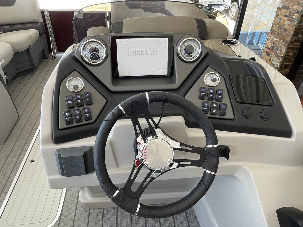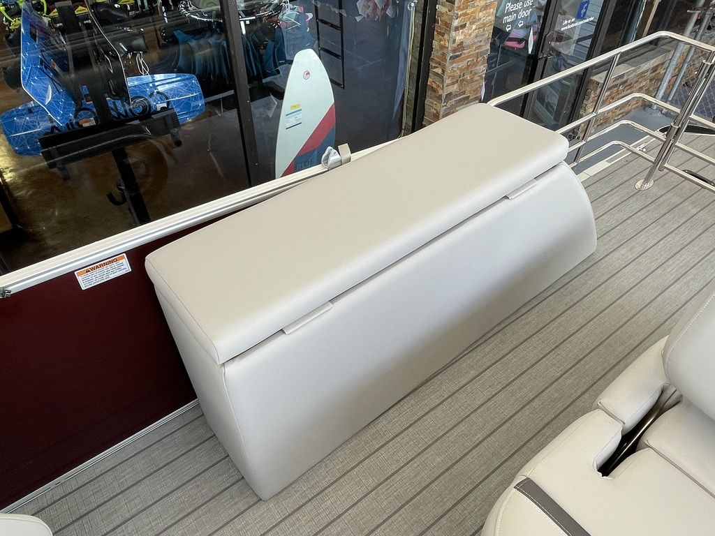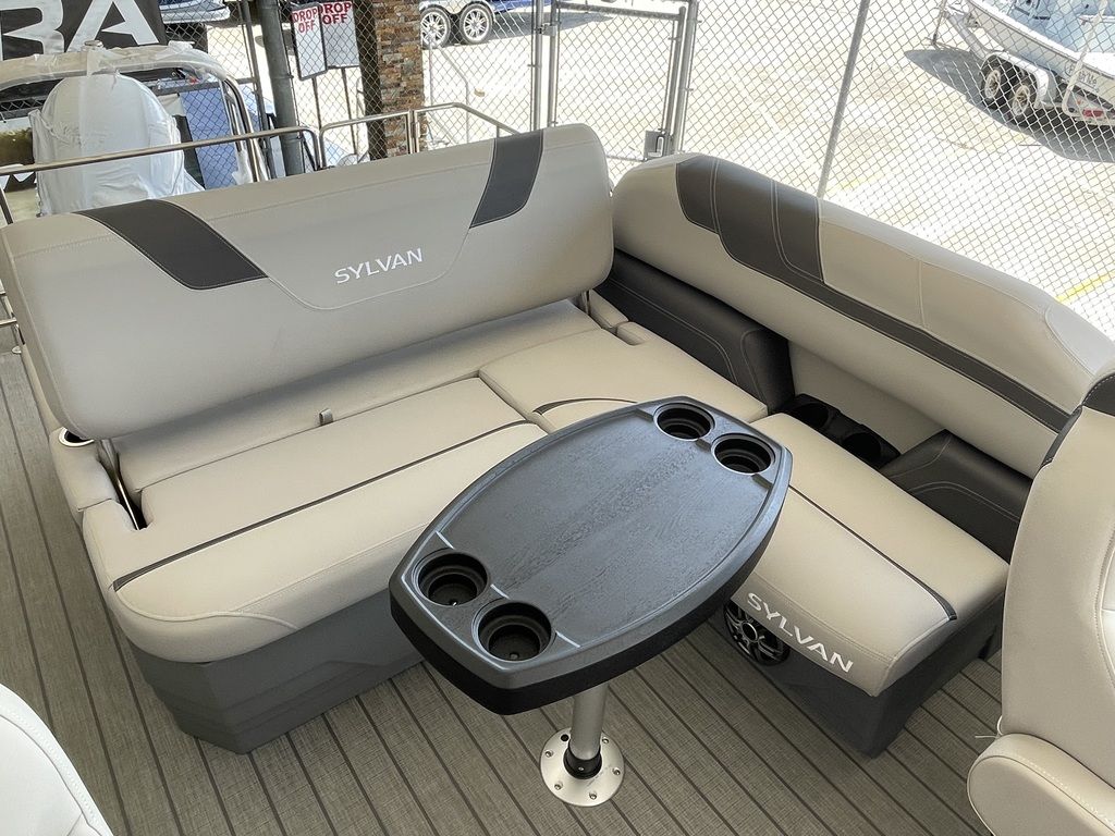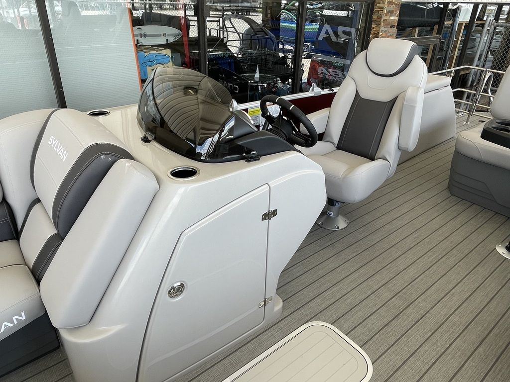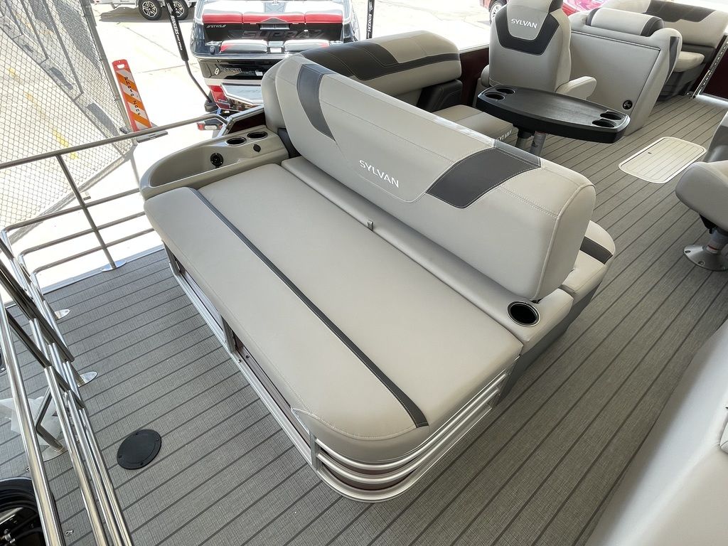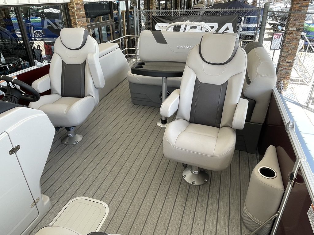 The L-3 CLZ by Sylvan offers a flip back seating arrangement in the rear of the pontoon and dual helm chairs. Flip back to have a dual facing rear lounge with a large rear cushion, or flip forward for the traditional L-group seating, perfect for cruising down the lake.