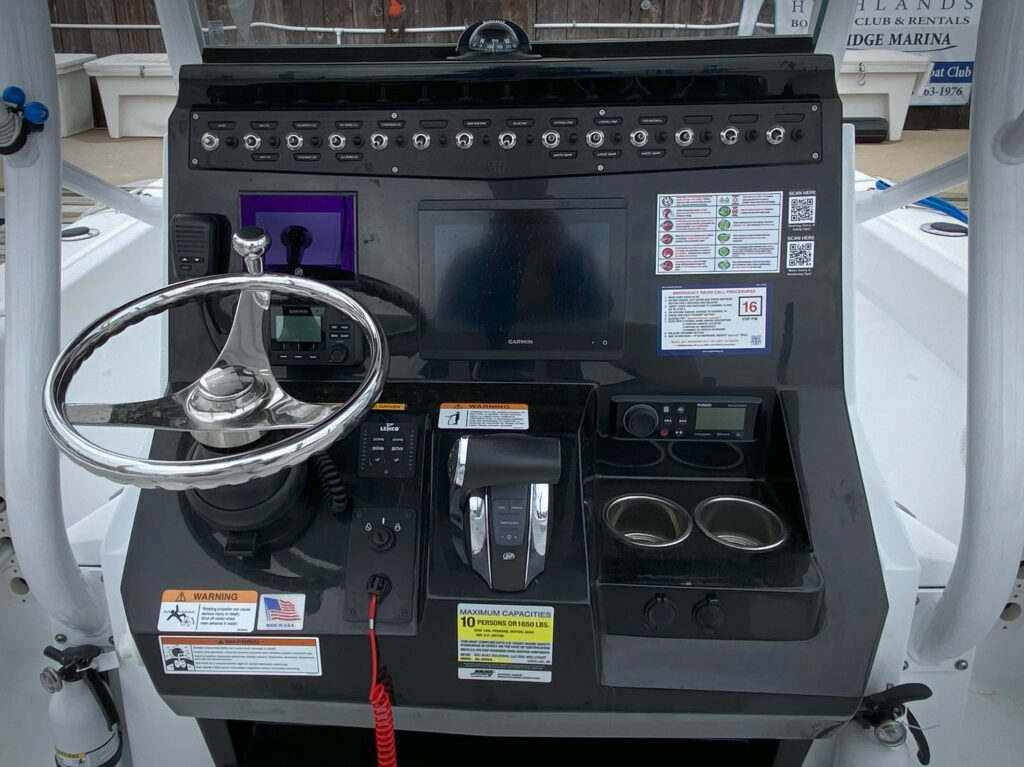 The bow seating package grants additional comfort to passengers, making this boat perfect for family outings. Features include VHF radio and stereo system, deluxe fiberglass T-Top, Garmin GPS and depth sounder, and more!