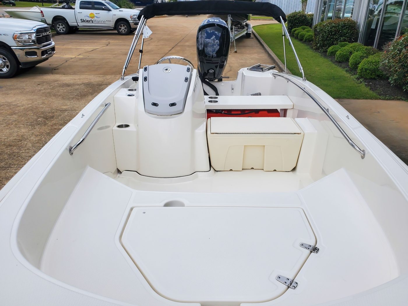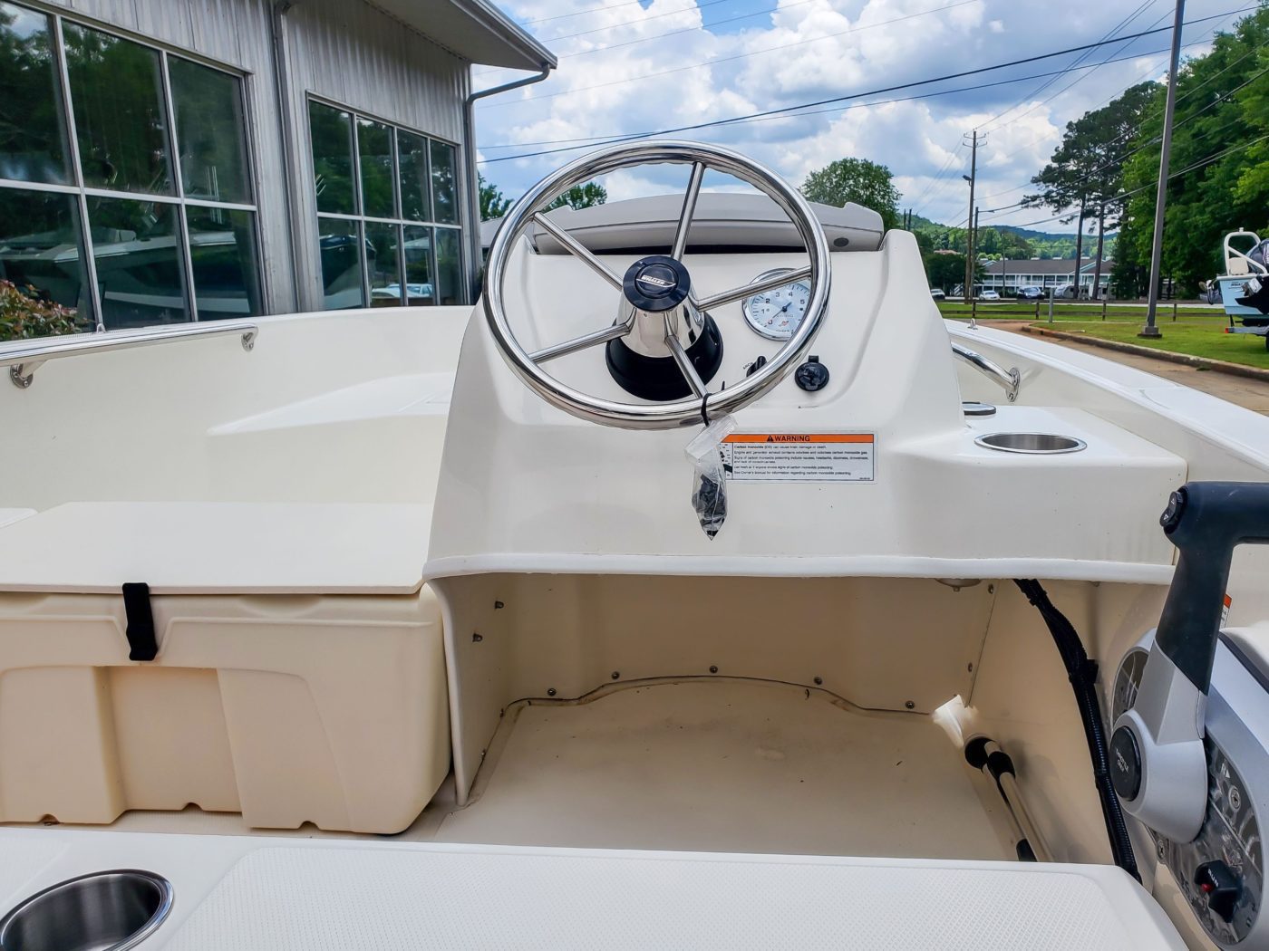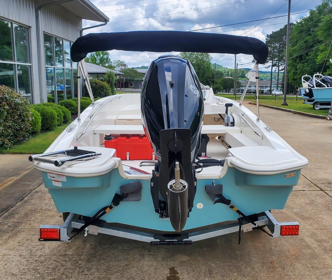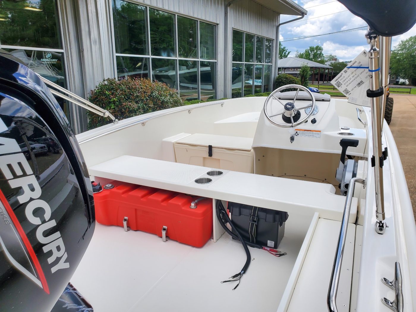 • All hardware 316-L stainless steel All rails welded 316-L stainless steel DECK/COCKPIT 8 cleats (3) 24.5 interior freeboard Bow and stern lifting eyes Bow locker with fiberglass cover and overboard drain Cockpit drain plug Heavy-duty rub rail Side rails welded stainless steel Starboard side storage shelf Swim ladder Transom boarding steps CONSOLE 12-V receptacle Drink holders (2) Fiberglass side console with lockable storage Safety switch Side mount Mercury control Steering wheel stainless steel Tachometer SEATING Console side seat cooler Fiberglass helm bench seat with drink holders (2) MECHANICAL 75 ELPT EFI FourStroke Mercury engine Battery box with hold-down strap Fuel tanks (2)(portable) (6.5 gallons) with holddown strap Navigation lights with rope guide No-feedback steering Propeller – aluminum Vessel view mobile GALVANIZED TRAILER WITH SWING TONGUE LED lights Tie downs Torsion axle Trailer jack Winch with nylon strap Spare tire with holder