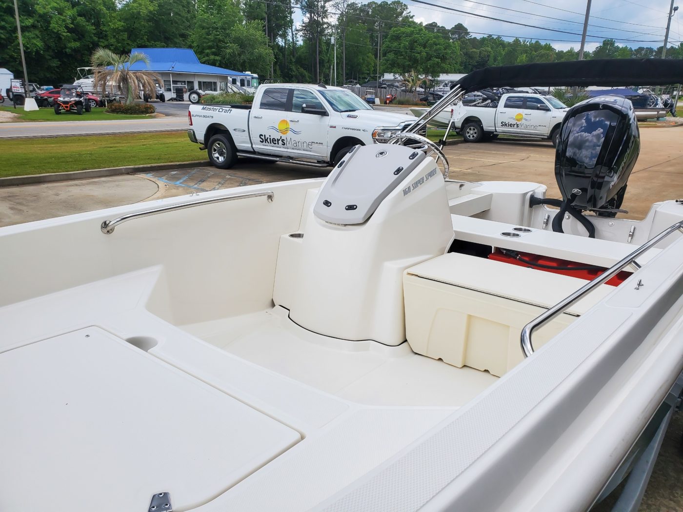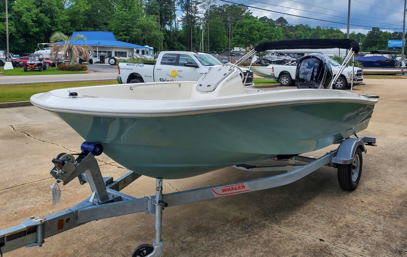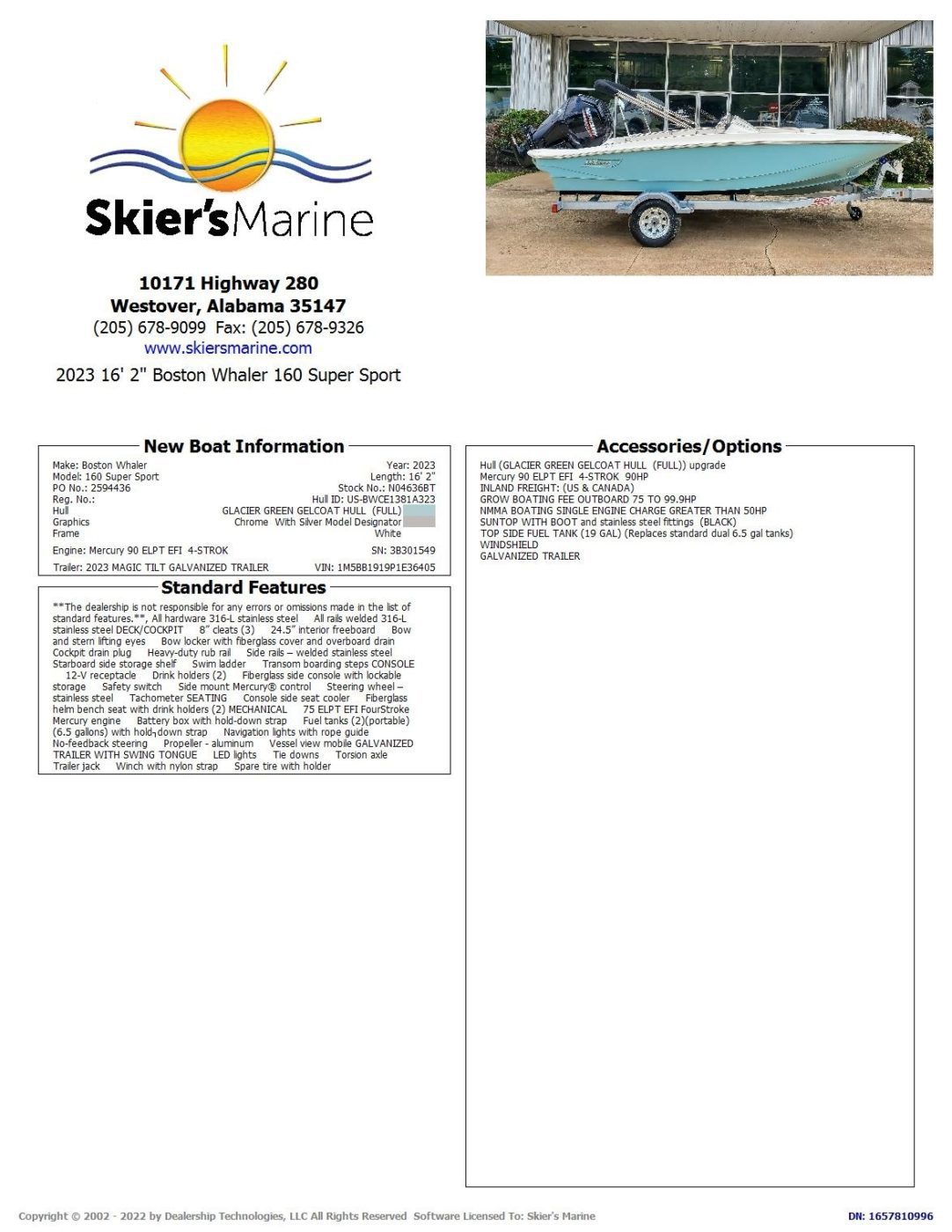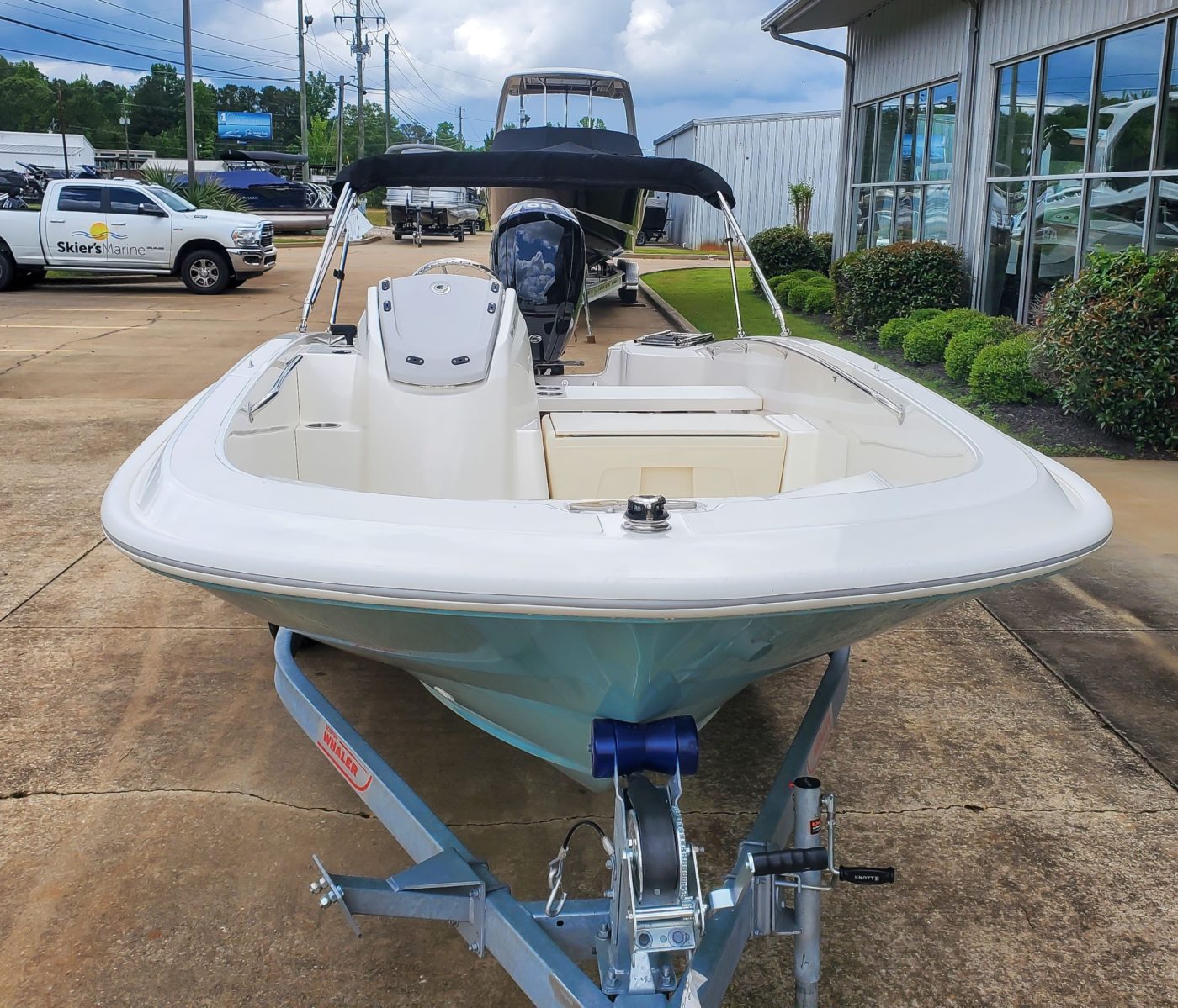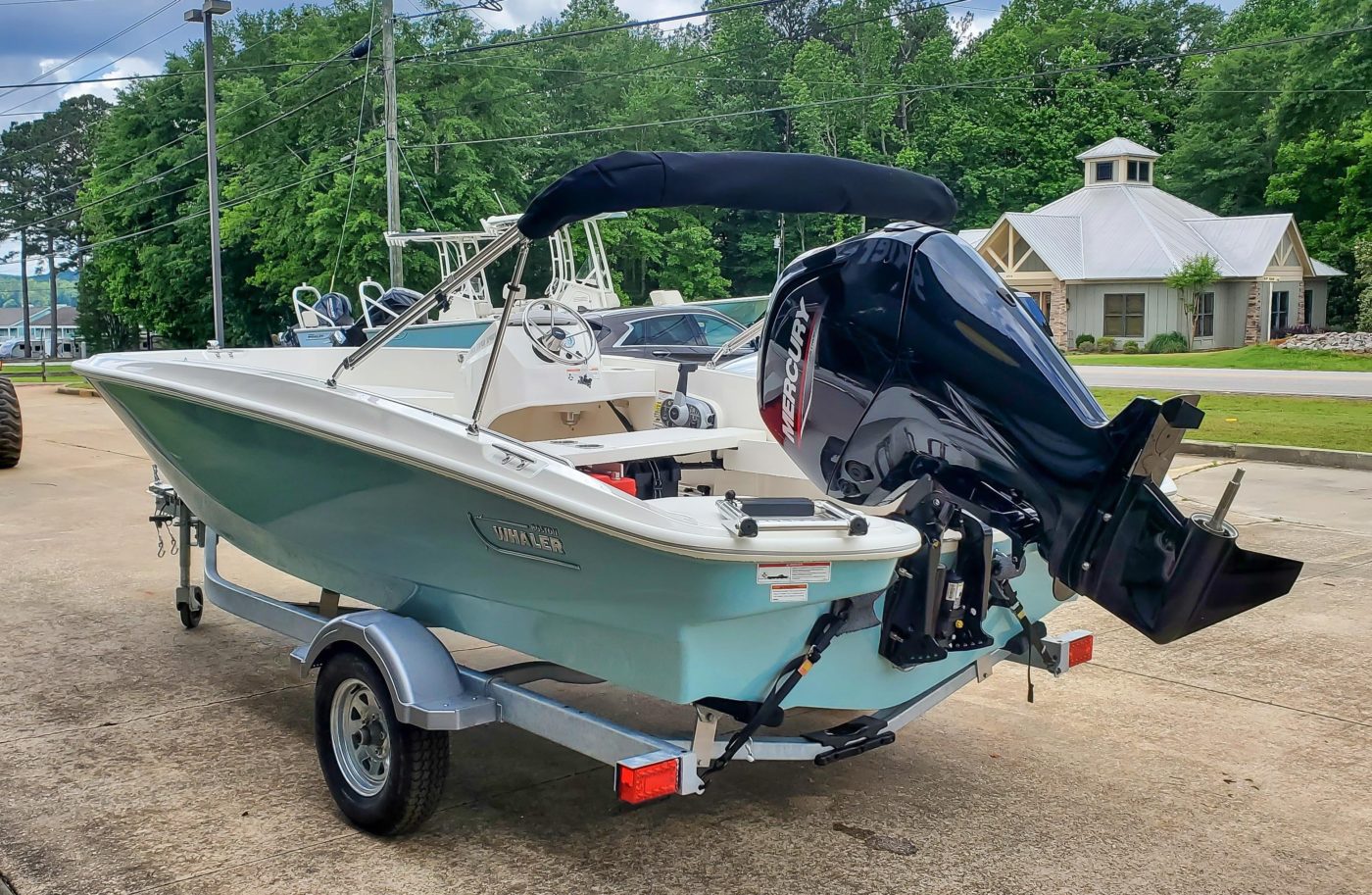 • All hardware 316-L stainless steel All rails welded 316-L stainless steel DECK/COCKPIT 8 cleats (3) 24.5 interior freeboard Bow and stern lifting eyes Bow locker with fiberglass cover and overboard drain Cockpit drain plug Heavy-duty rub rail Side rails welded stainless steel Starboard side storage shelf Swim ladder Transom boarding steps CONSOLE 12-V receptacle Drink holders (2) Fiberglass side console with lockable storage Safety switch Side mount Mercury control Steering wheel stainless steel Tachometer SEATING Console side seat cooler Fiberglass helm bench seat with drink holders (2) MECHANICAL 75 ELPT EFI FourStroke Mercury engine Battery box with hold-down strap Fuel tanks (2)(portable) (6.5 gallons) with holddown strap Navigation lights with rope guide No-feedback steering Propeller – aluminum Vessel view mobile GALVANIZED TRAILER WITH SWING TONGUE LED lights Tie downs Torsion axle Trailer jack Winch with nylon strap Spare tire with holder
