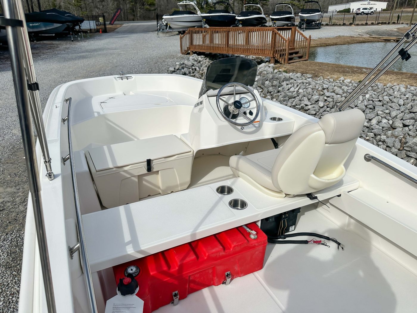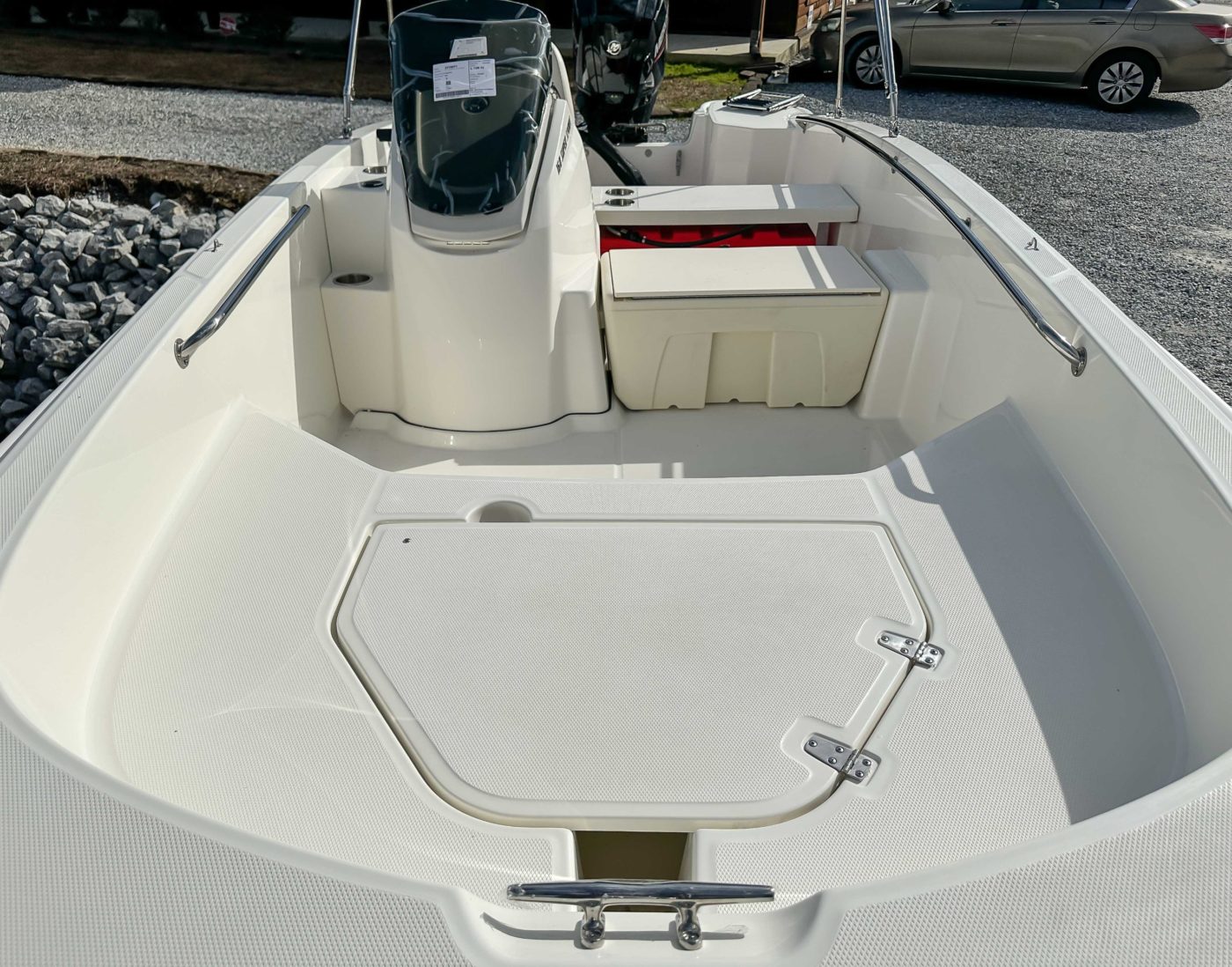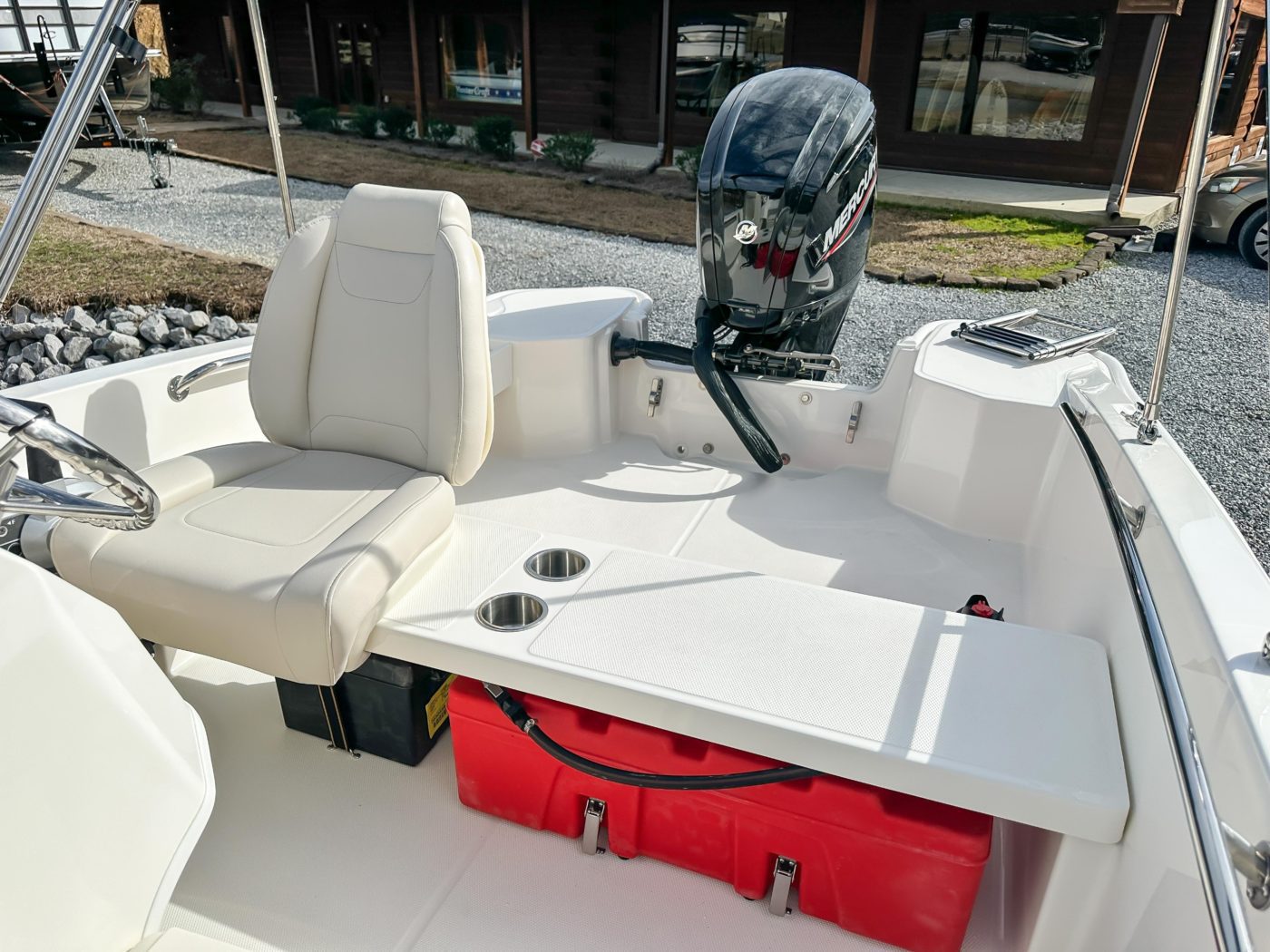 • All hardware 316-L stainless steel All rails welded 316-L stainless steel DECK/COCKPIT 8 cleats (3) 24.5 interior freeboard Bow and stern lifting eyes Bow locker with fiberglass cover and overboard drain Cockpit drain plug Heavy-duty rub rail Side rails welded stainless steel Starboard side storage shelf Swim ladder Transom boarding steps CONSOLE 12-V receptacle Drink holders (2) Fiberglass side console with lockable storage Safety switch Side mount Mercury control Steering wheel stainless steel Tachometer SEATING Console side seat cooler Fiberglass helm bench seat with drink holders (2) MECHANICAL 75 ELPT EFI FourStroke Mercury engine Battery box with hold-down strap Fuel tanks (2)(portable) (6.5 gallons) with holddown strap Navigation lights with rope guide No-feedback steering Propeller – aluminum Vessel view mobile GALVANIZED TRAILER WITH SWING TONGUE LED lights Tie downs Torsion axle Trailer jack Winch with nylon strap Spare tire with holder
