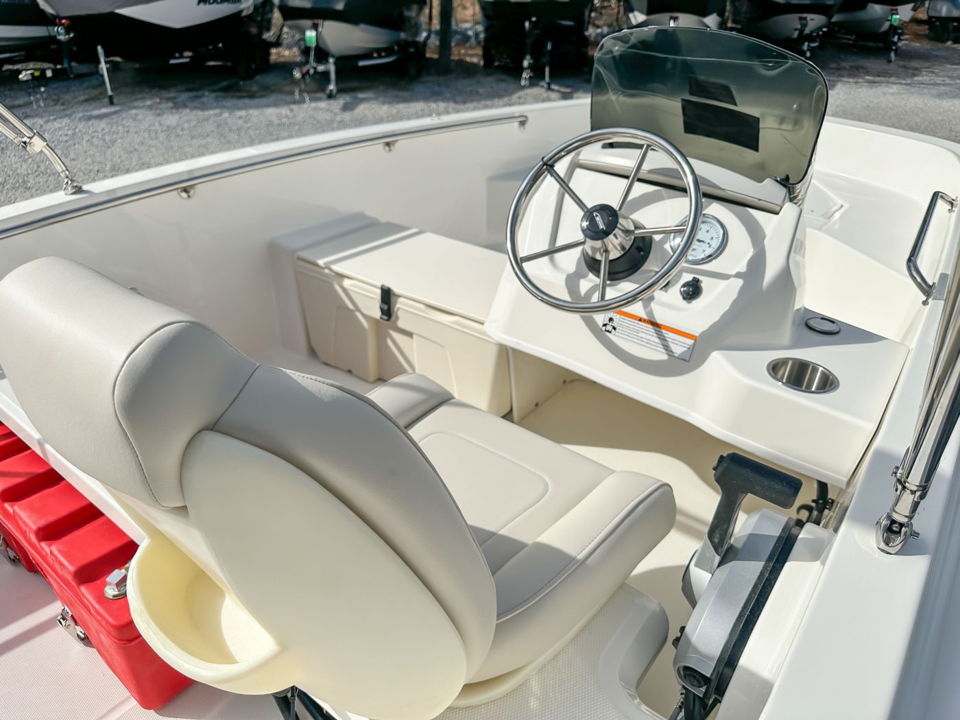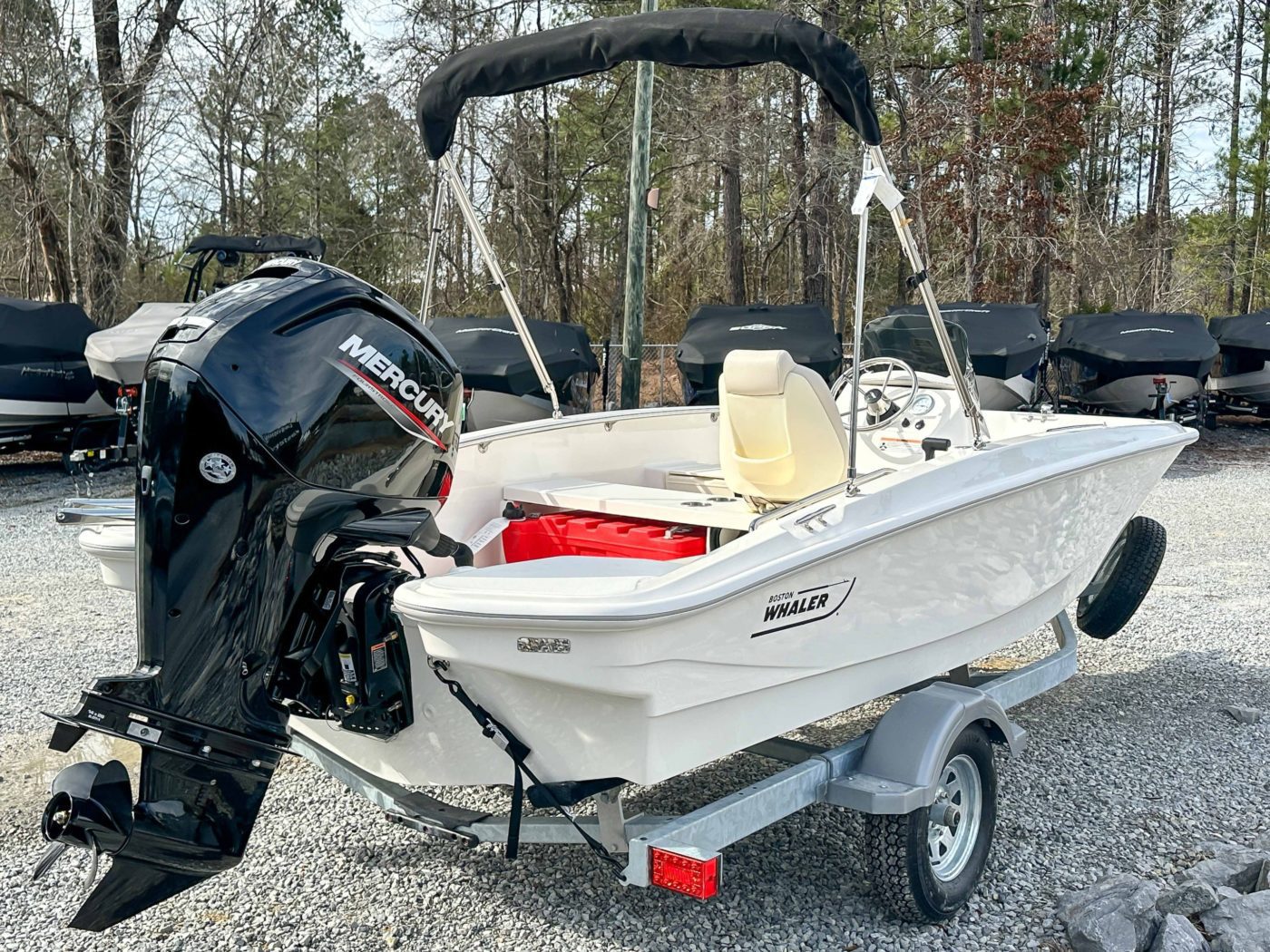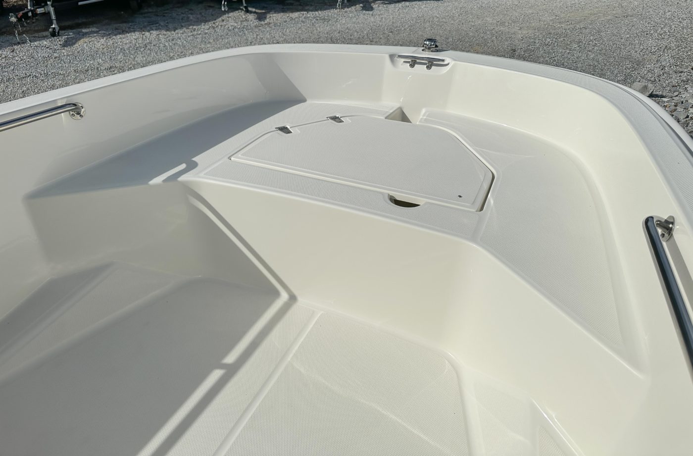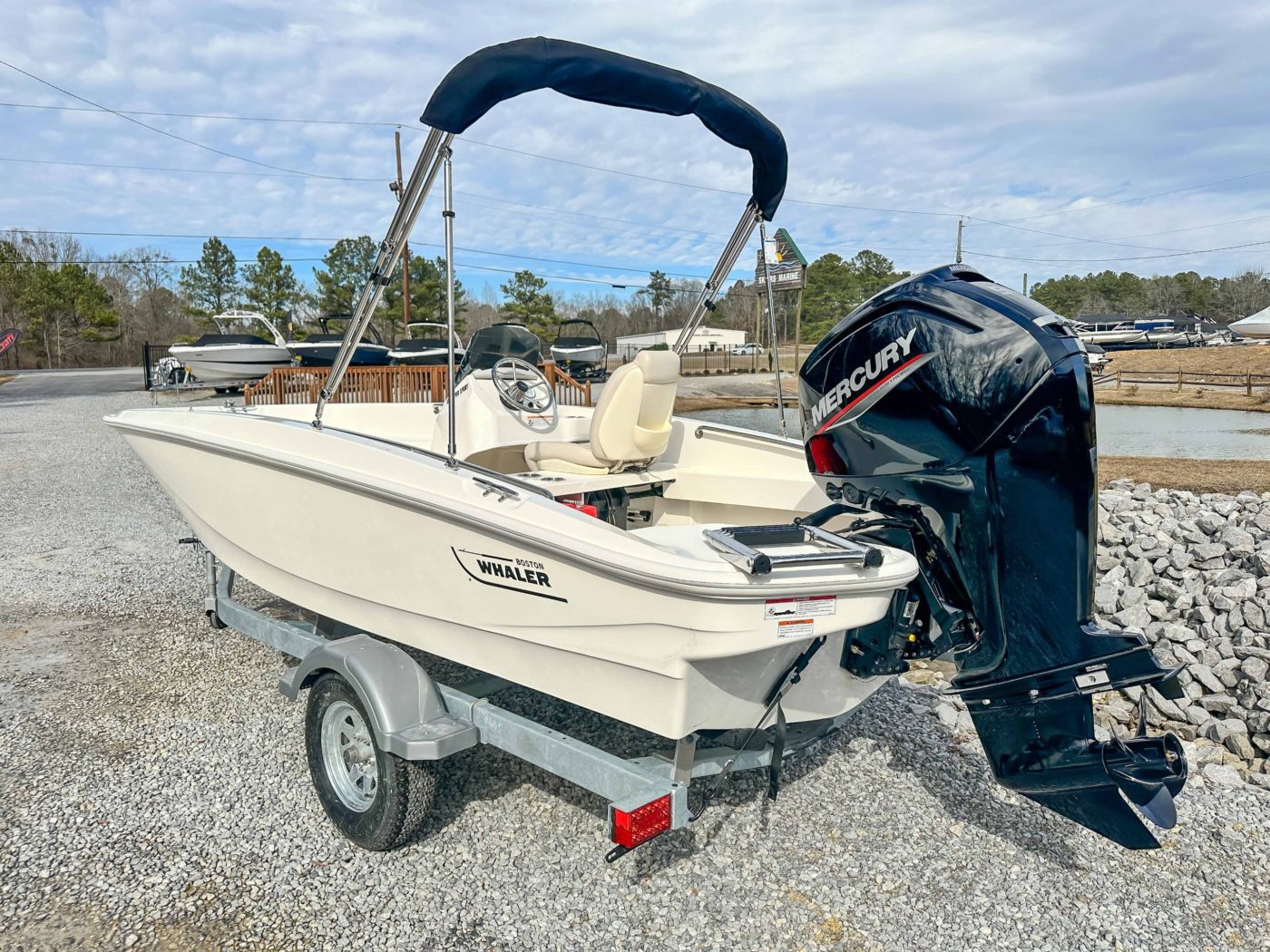 • All hardware 316-L stainless steel All rails welded 316-L stainless steel DECK/COCKPIT 8 cleats (3) 24.5 interior freeboard Bow and stern lifting eyes Bow locker with fiberglass cover and overboard drain Cockpit drain plug Heavy-duty rub rail Side rails welded stainless steel Starboard side storage shelf Swim ladder Transom boarding steps CONSOLE 12-V receptacle Drink holders (2) Fiberglass side console with lockable storage Safety switch Side mount Mercury control Steering wheel stainless steel Tachometer SEATING Console side seat cooler Fiberglass helm bench seat with drink holders (2) MECHANICAL 75 ELPT EFI FourStroke Mercury engine Battery box with hold-down strap Fuel tanks (2)(portable) (6.5 gallons) with holddown strap Navigation lights with rope guide No-feedback steering Propeller – aluminum Vessel view mobile GALVANIZED TRAILER WITH SWING TONGUE LED lights Tie downs Torsion axle Trailer jack Winch with nylon strap Spare tire with holder