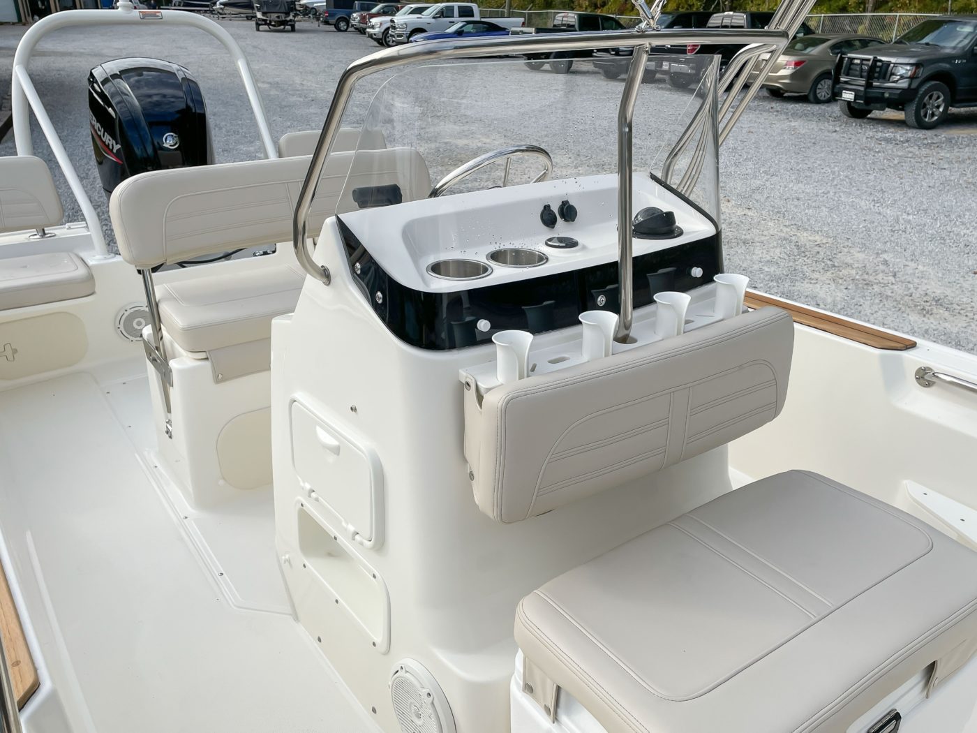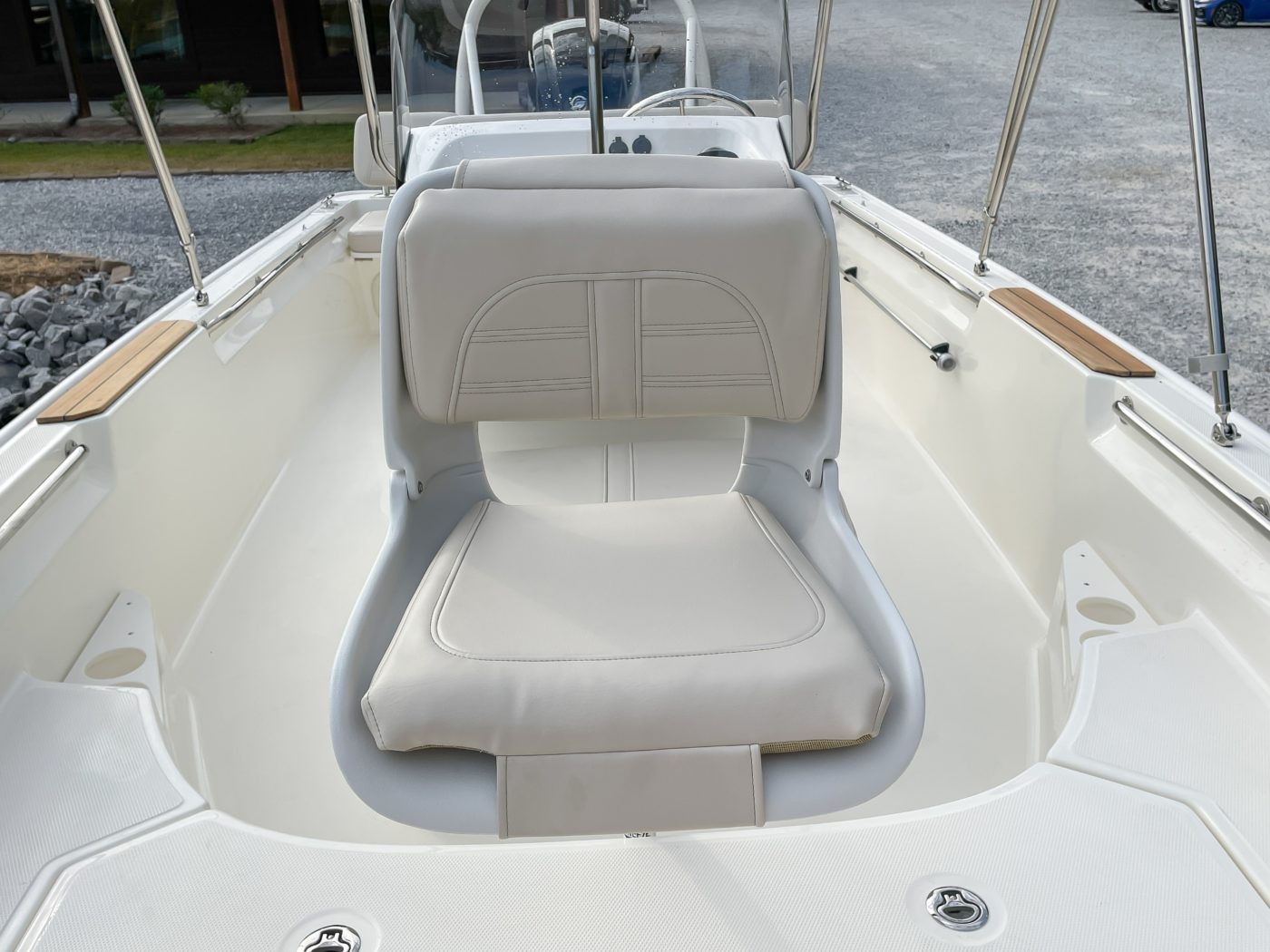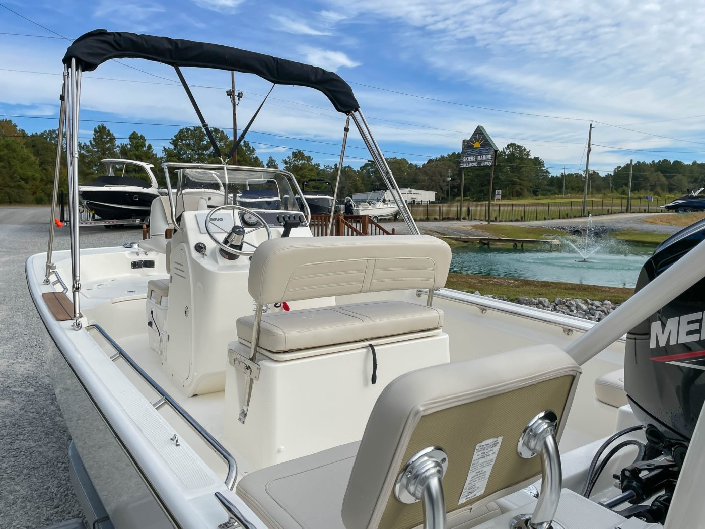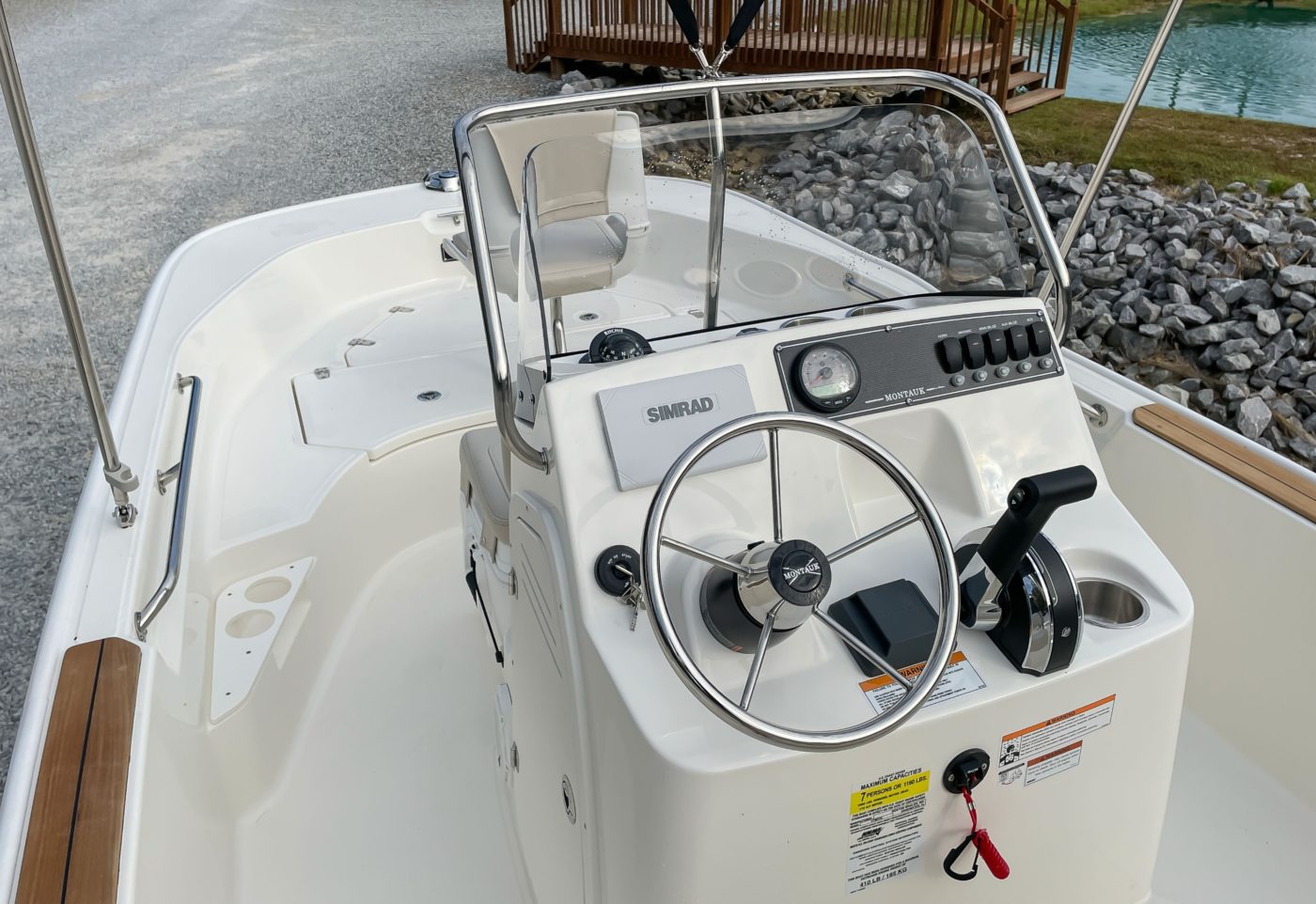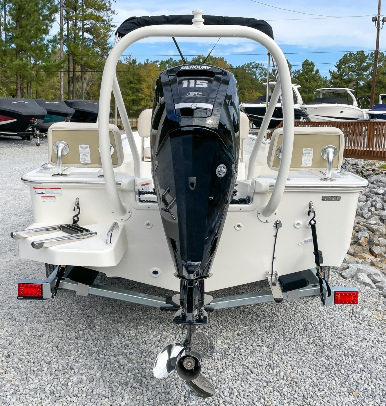 • All hardware 316-L stainless steel All rails welded 316-L stainless steel DECK/COCKPIT 8 stainless steel cleats (3) 19 interior freeboard Boarding steps (midship)(molded-in port and starboard) Bow and stern lifting eyes Bow locker with fiberglass cover and overboard drain Bow rail welded stainless steel Cup holders at bow (2) Forward fishbox with overboard drain Heavy-duty rub rail Integrated transom storage Rod holders (4)(stern) Side rails stainless steel Swim platform with grab rail and telescoping stainless steel swim ladder (fiberglass) CONSOLE 12V receptacle Access door with lockable stainless steel latch Acrylic windshield Electrical switch panel with circuit breaker protection Drink holders (3) Electric horn Mercury binnacle control Partitioned storage at top of helm Stainless steel steering wheel Welded stainless steel grab rail SEATING Reversible pilot seat with locking backrest and storage MECHANICAL 90 EXLPT EFI Black Command Thrust FourStroke Mercury engine Analog instrumentation Battery box and switch with hold-down strap in console Bilge pump with float switch (2) Classic style navigation lights Fuel tanks integrated (25 gallons) Hydraulic steering Smart Craft digital gauges Stainless steel propeller Vessel view mobile GALVANIZED TANDEM AXLE TRAILER WITH SWING TONGUE & DISC BRAKES LED lights Spare tire Tie-downs Torsion Axle Trailer jack Winch with nylon strap