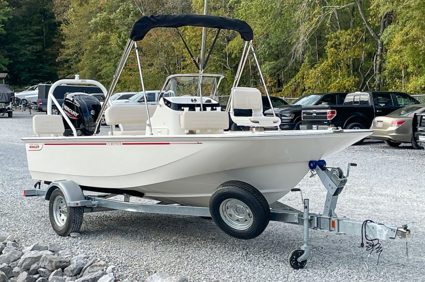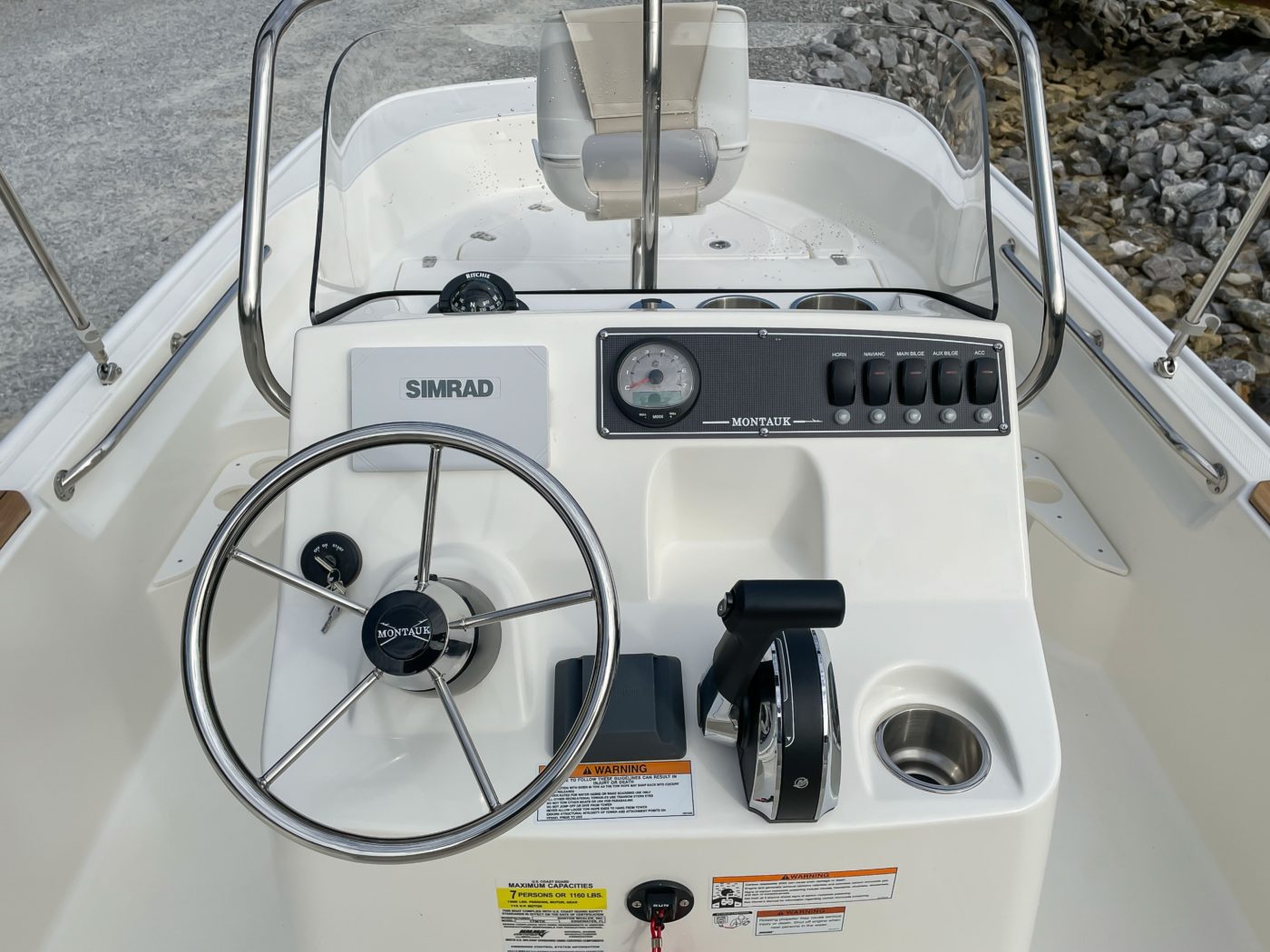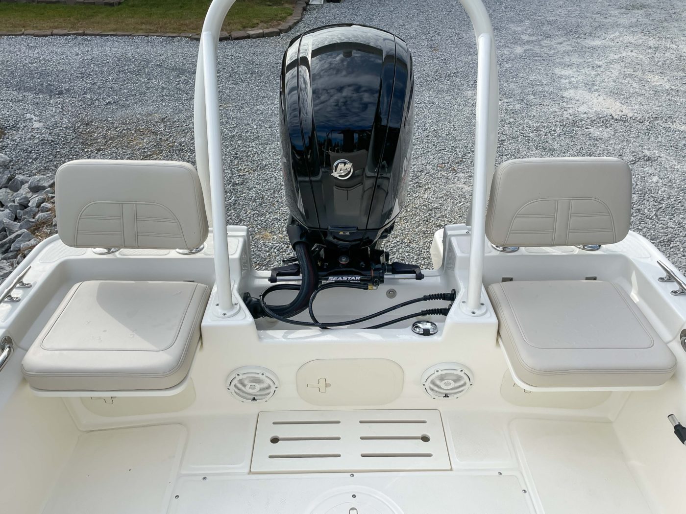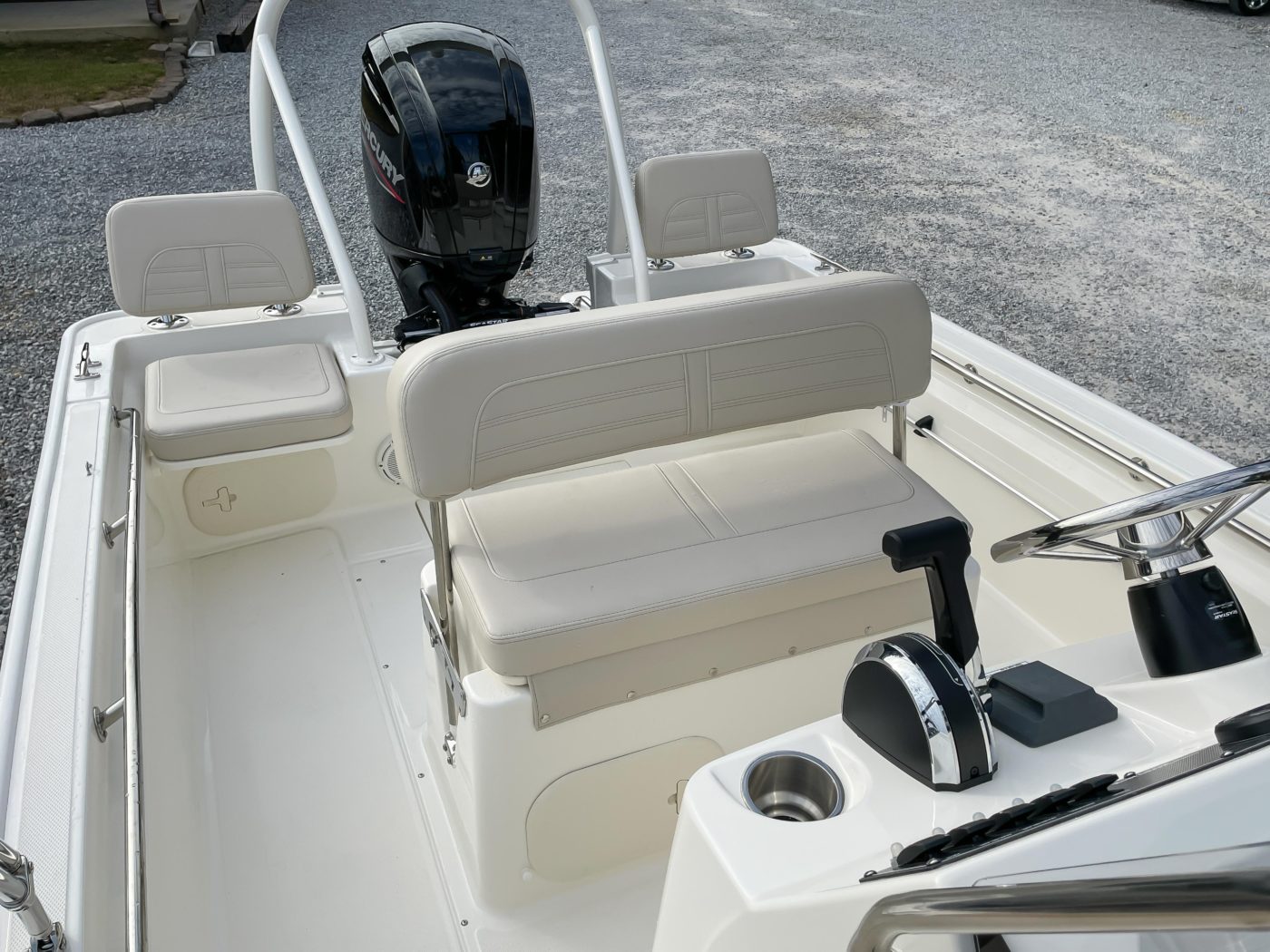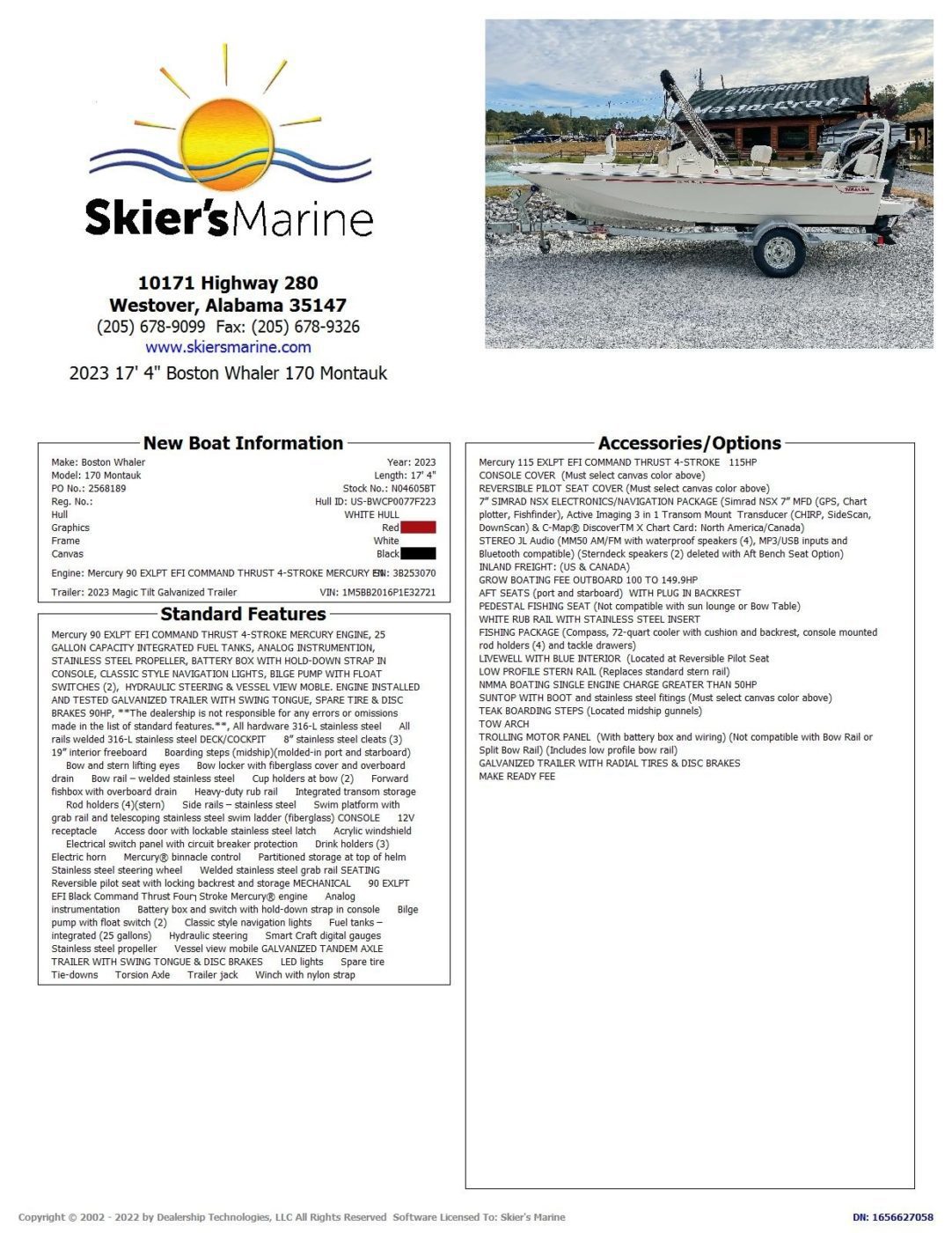 • All hardware 316-L stainless steel All rails welded 316-L stainless steel DECK/COCKPIT 8 stainless steel cleats (3) 19 interior freeboard Boarding steps (midship)(molded-in port and starboard) Bow and stern lifting eyes Bow locker with fiberglass cover and overboard drain Bow rail welded stainless steel Cup holders at bow (2) Forward fishbox with overboard drain Heavy-duty rub rail Integrated transom storage Rod holders (4)(stern) Side rails stainless steel Swim platform with grab rail and telescoping stainless steel swim ladder (fiberglass) CONSOLE 12V receptacle Access door with lockable stainless steel latch Acrylic windshield Electrical switch panel with circuit breaker protection Drink holders (3) Electric horn Mercury binnacle control Partitioned storage at top of helm Stainless steel steering wheel Welded stainless steel grab rail SEATING Reversible pilot seat with locking backrest and storage MECHANICAL 90 EXLPT EFI Black Command Thrust FourStroke Mercury engine Analog instrumentation Battery box and switch with hold-down strap in console Bilge pump with float switch (2) Classic style navigation lights Fuel tanks integrated (25 gallons) Hydraulic steering Smart Craft digital gauges Stainless steel propeller Vessel view mobile GALVANIZED TANDEM AXLE TRAILER WITH SWING TONGUE & DISC BRAKES LED lights Spare tire Tie-downs Torsion Axle Trailer jack Winch with nylon strap