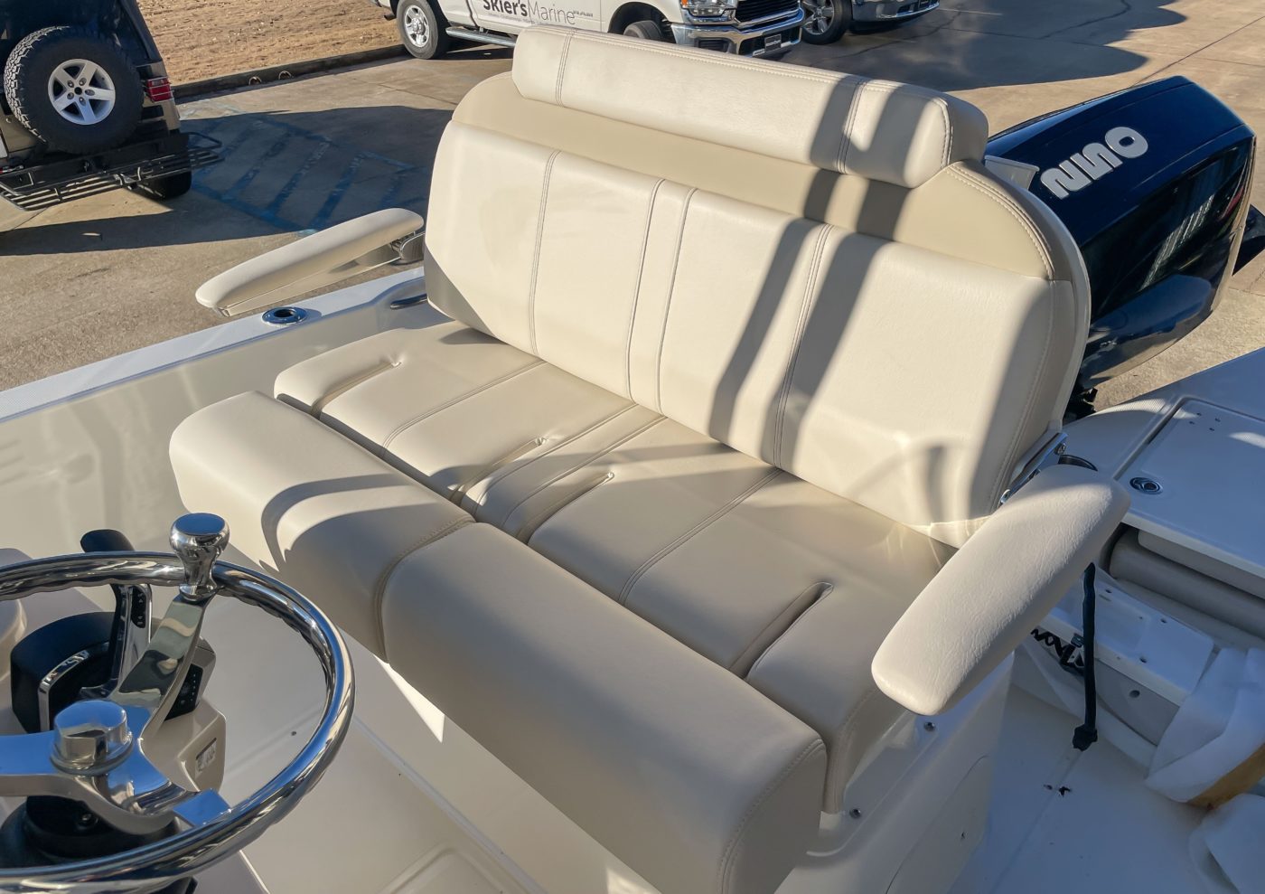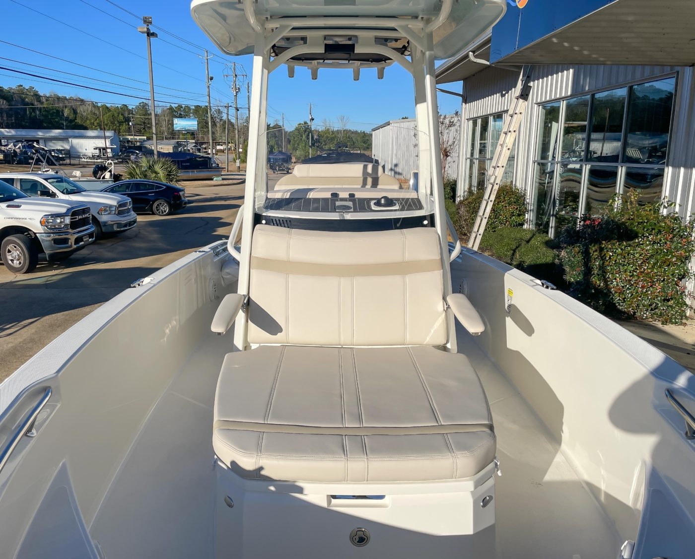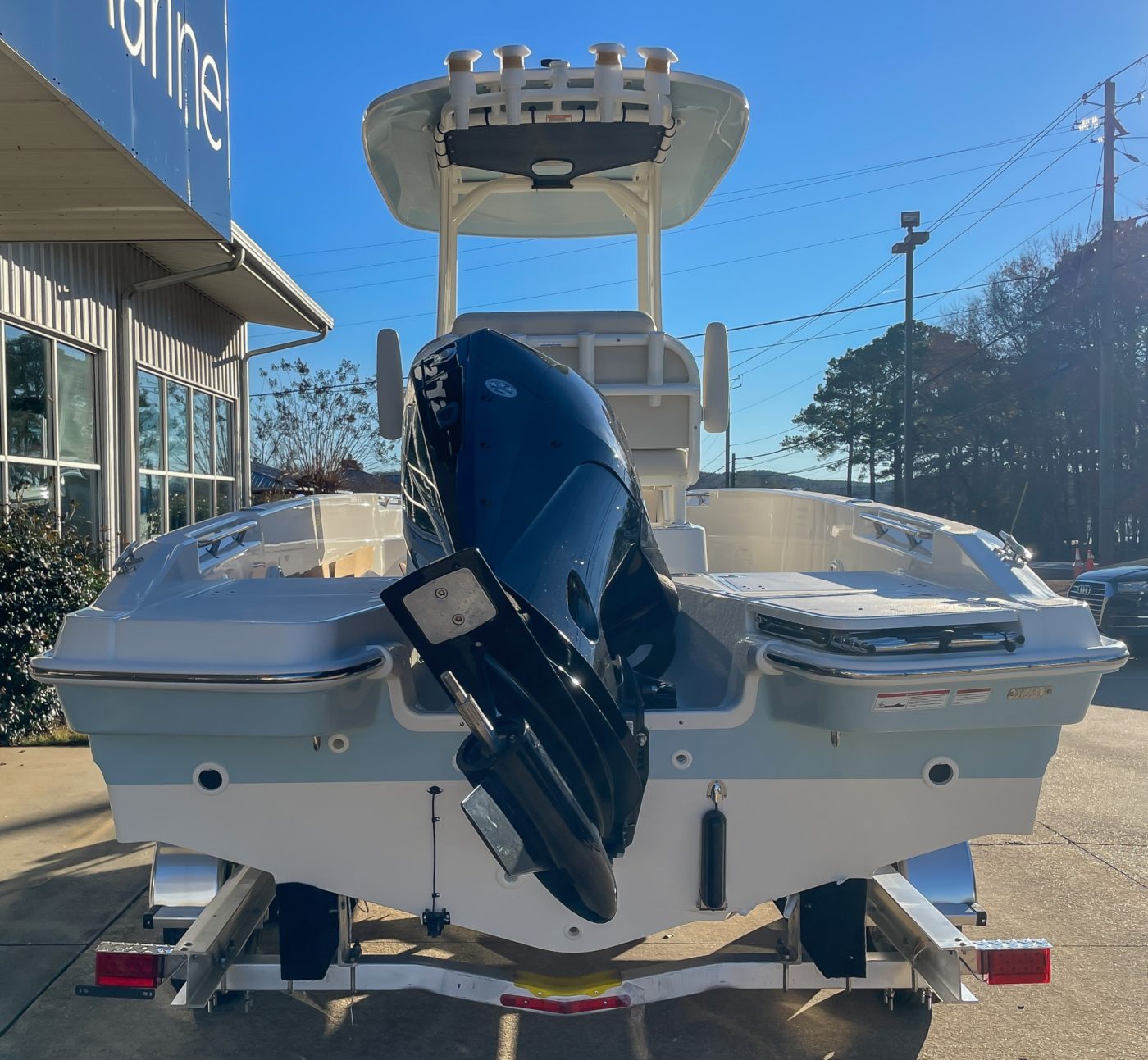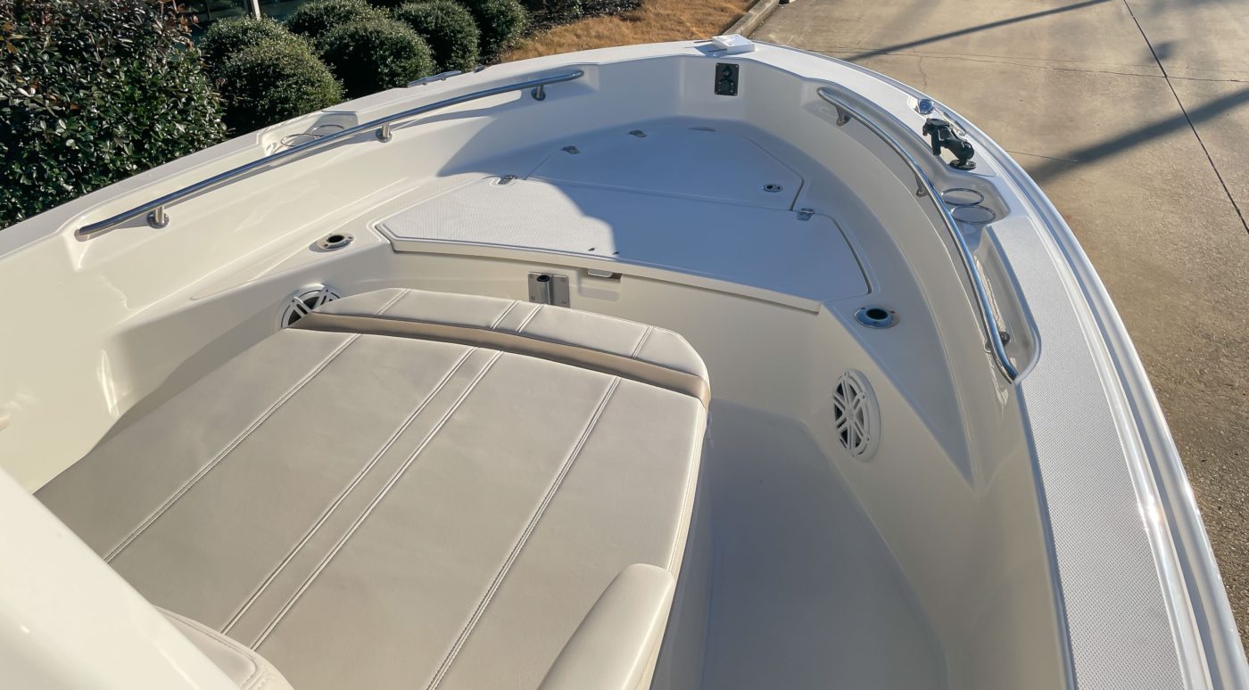 • All hardware 316-L stainless steel All rails welded 316-L stainless steel DECK/COCKPIT 22″ interior freeboard 8″ cleats; bow (2), stern (2), spring line (2) Low profile bow rail – welded stainless steel Bow and stern lifting eyes Casting platform Port and Starboard aft Drink holders Stainless steel, forward (4), lounge (2), console (2), aft seats (2) Garboard drain plug Rod holders Stainless steel, stern deck (4), gunnel mounted (2), Bow (2) Heavy-duty rub rail Self-bailing cockpit sole Low profile aft side rails – welded stainless steel Swim platform with telescoping ladder Trolling motor flat at bow CONSOLE HDPE access door in aluminum frame with stainless steel latch Acrylic windshield Compass Console face tan gelcoat Drink holders (2) SS Electronics mounting surface (for 12 display) Grab rail – welded stainless steel (delete with T-Top or Fiberglass Hardtop) Electrical switch panel with circuit breaker protection Interior LED light Cast stainless steel steering wheel with knob Head Removable Porta potti Wireless phone charger SEATING Forward console lounge with armrests; drink holders (2) Reversible pilot seat with locking backrest and integrated cooler Port and Starboard stern seats with folding backrests STORAGE Bow, anchor locker with overboard drain and stainless steel gas shock Forward fishbox/storage with overboard drain Lockable console front storage – holds multiple rods, buckets, gear Lockable console storage Cooler / Storage in reversible pilot seat base MECHANICAL 200 XL V6 CMS (DTS) Mercury FourStroke with hydraulic power steering and fuel/water separator SmartCraft deluxe gauge package Tilt steering Propeller – Stainless steel Fuel tank – 80 gallon Automatic bilge pump Dual battery trays with switch and automatic charging relay for house bank charging Electric horn Fuel/water separator Navigation lights Vessel View Mobile