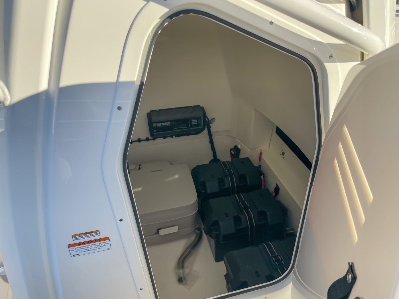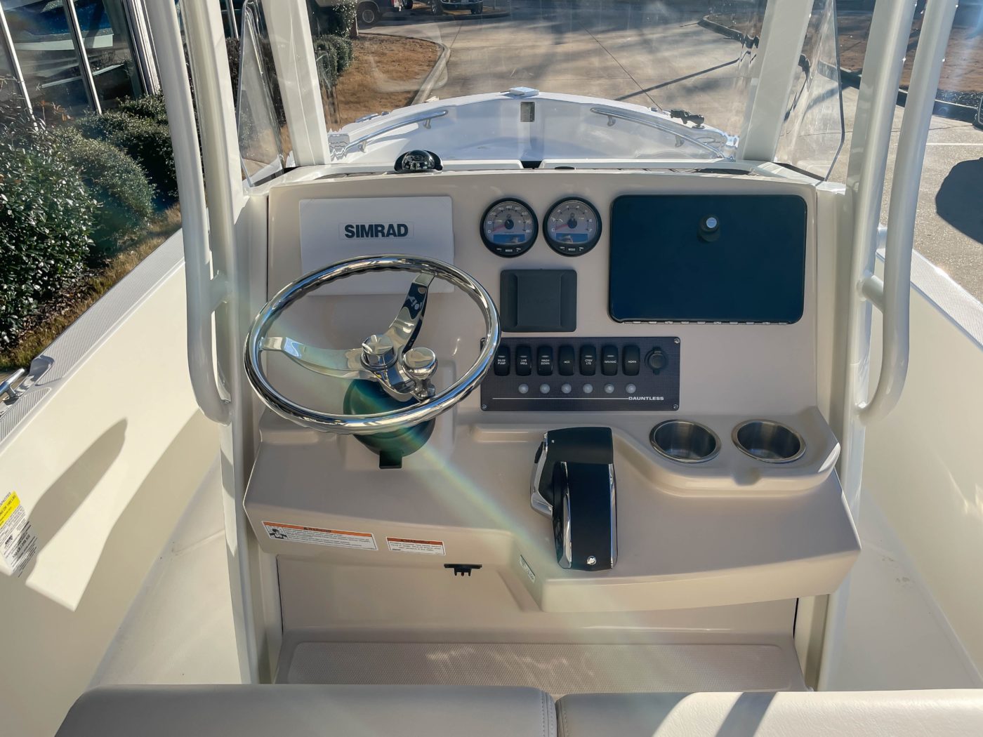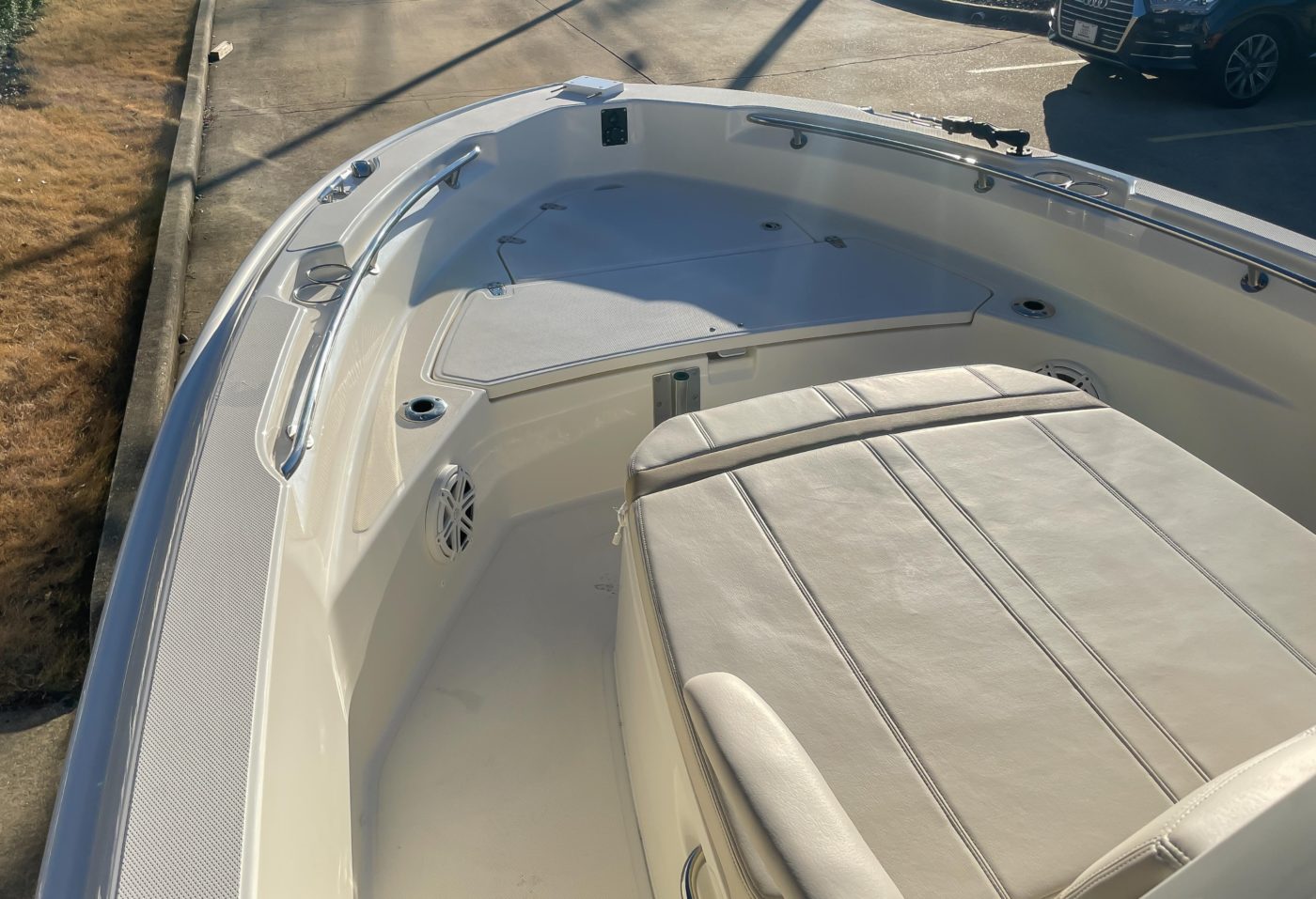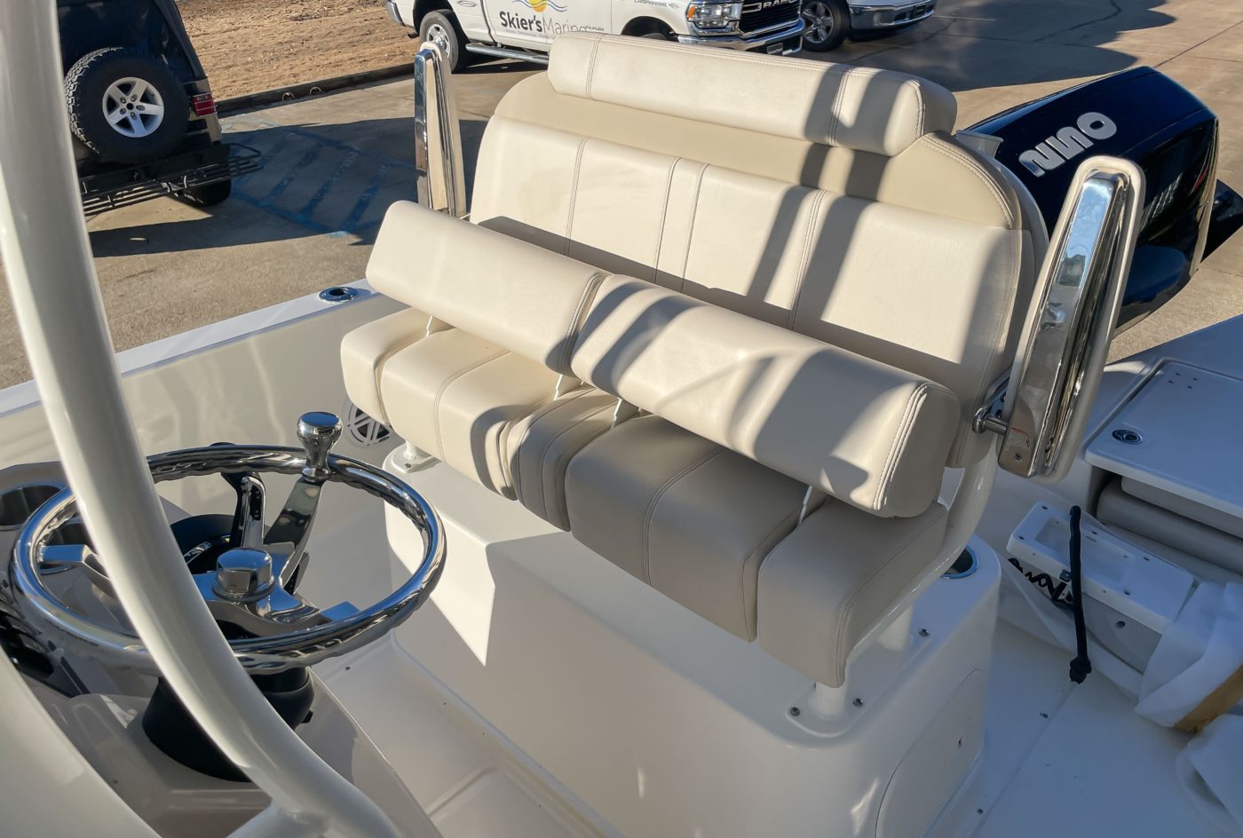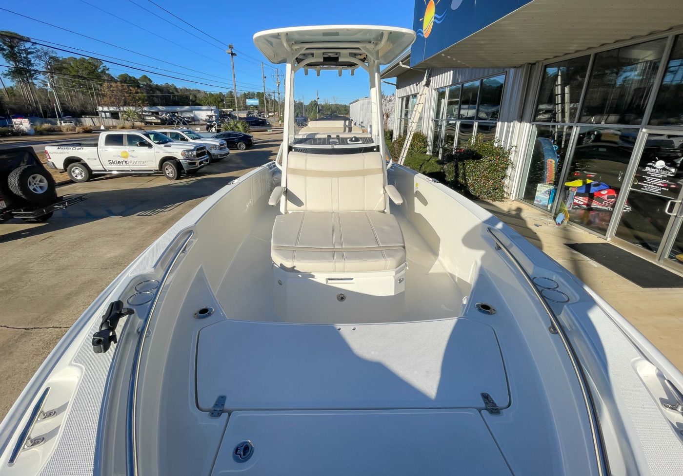 • All hardware 316-L stainless steel All rails welded 316-L stainless steel DECK/COCKPIT 22″ interior freeboard 8″ cleats; bow (2), stern (2), spring line (2) Low profile bow rail – welded stainless steel Bow and stern lifting eyes Casting platform Port and Starboard aft Drink holders Stainless steel, forward (4), lounge (2), console (2), aft seats (2) Garboard drain plug Rod holders Stainless steel, stern deck (4), gunnel mounted (2), Bow (2) Heavy-duty rub rail Self-bailing cockpit sole Low profile aft side rails – welded stainless steel Swim platform with telescoping ladder Trolling motor flat at bow CONSOLE HDPE access door in aluminum frame with stainless steel latch Acrylic windshield Compass Console face tan gelcoat Drink holders (2) SS Electronics mounting surface (for 12 display) Grab rail – welded stainless steel (delete with T-Top or Fiberglass Hardtop) Electrical switch panel with circuit breaker protection Interior LED light Cast stainless steel steering wheel with knob Head Removable Porta potti Wireless phone charger SEATING Forward console lounge with armrests; drink holders (2) Reversible pilot seat with locking backrest and integrated cooler Port and Starboard stern seats with folding backrests STORAGE Bow, anchor locker with overboard drain and stainless steel gas shock Forward fishbox/storage with overboard drain Lockable console front storage – holds multiple rods, buckets, gear Lockable console storage Cooler / Storage in reversible pilot seat base MECHANICAL 200 XL V6 CMS (DTS) Mercury FourStroke with hydraulic power steering and fuel/water separator SmartCraft deluxe gauge package Tilt steering Propeller – Stainless steel Fuel tank – 80 gallon Automatic bilge pump Dual battery trays with switch and automatic charging relay for house bank charging Electric horn Fuel/water separator Navigation lights Vessel View Mobile