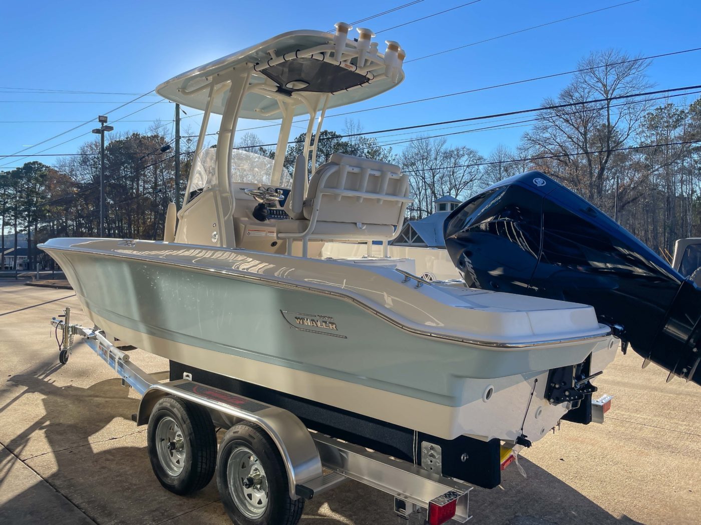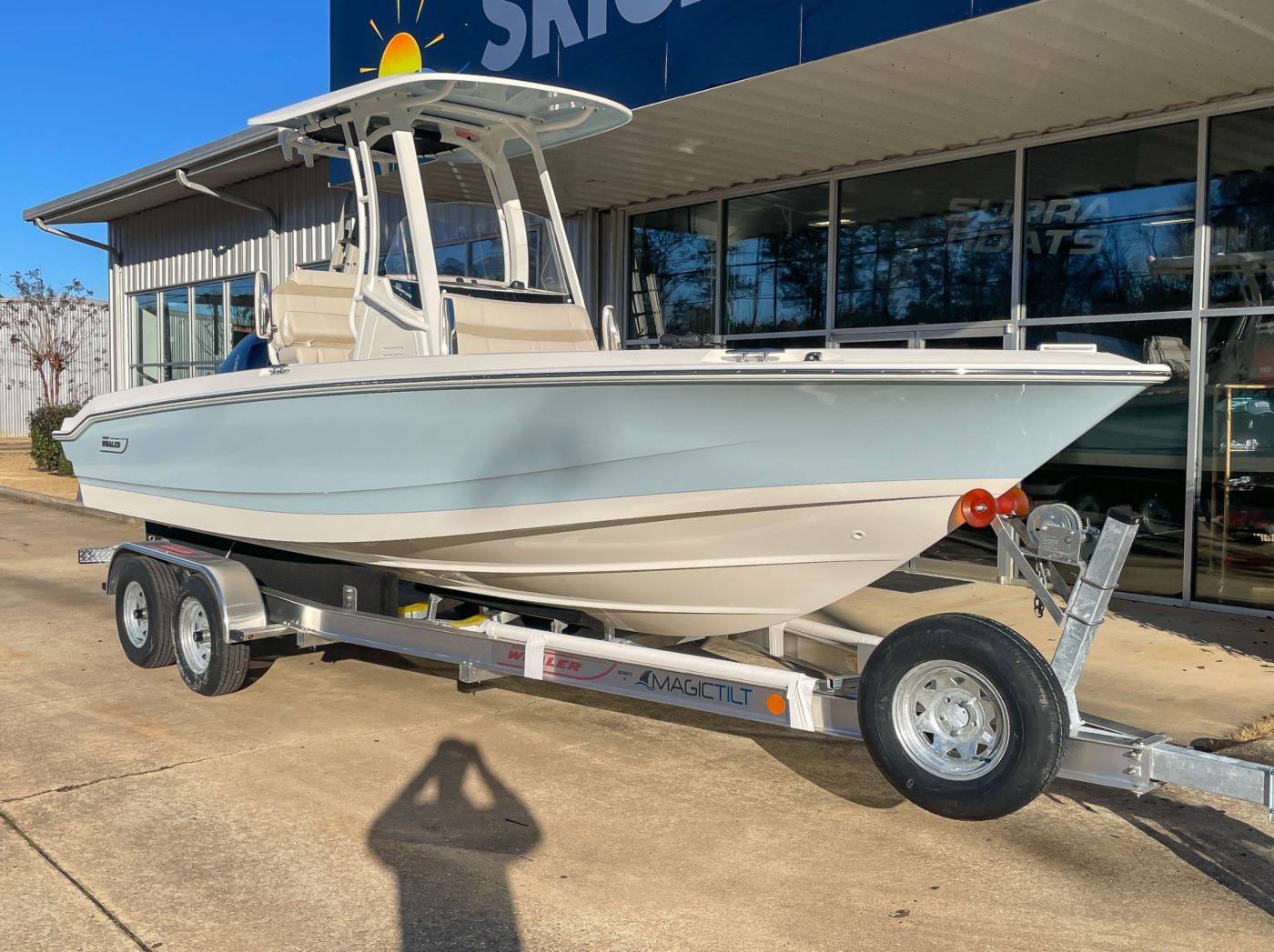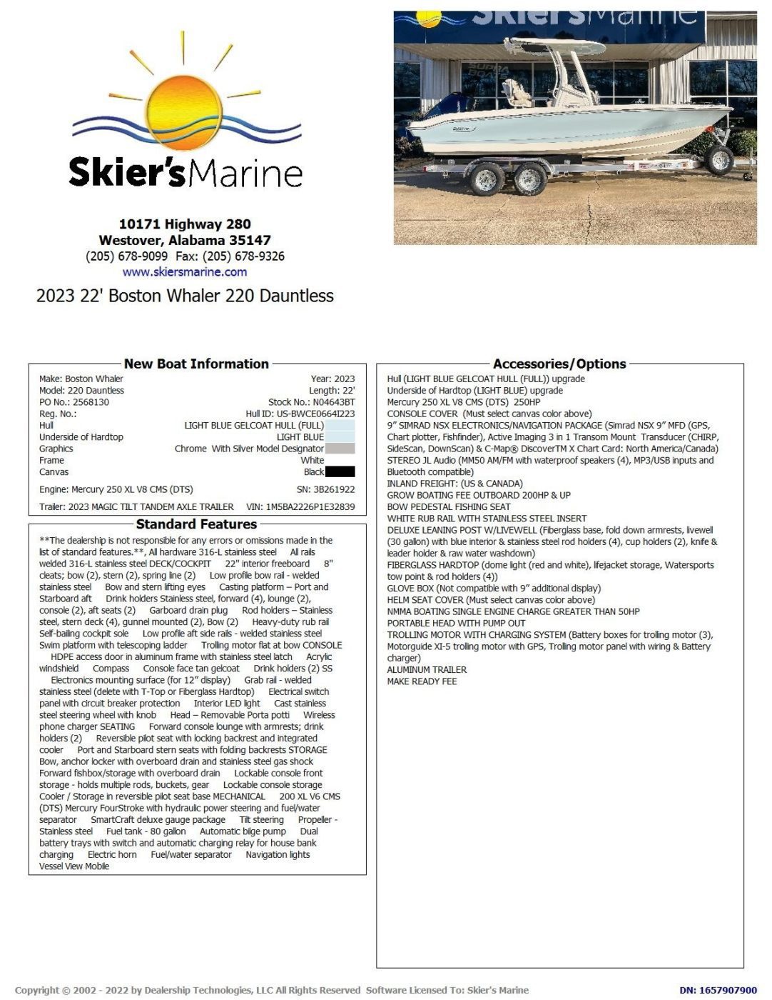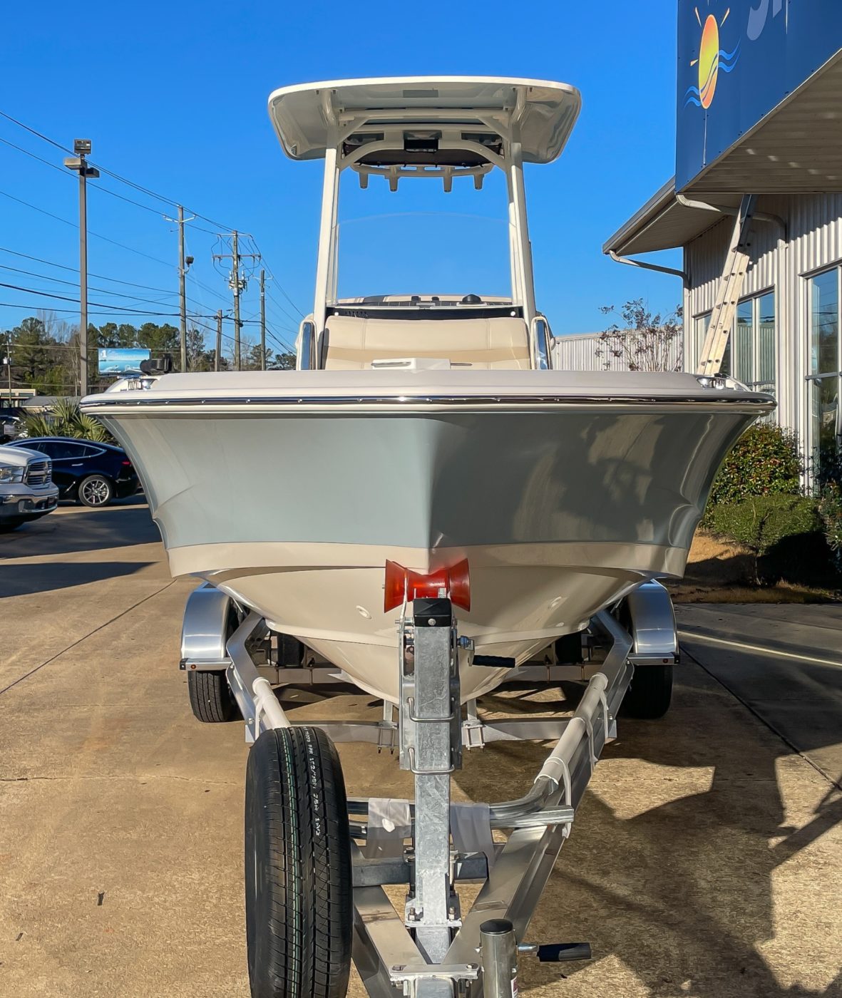 • All hardware 316-L stainless steel All rails welded 316-L stainless steel DECK/COCKPIT 22″ interior freeboard 8″ cleats; bow (2), stern (2), spring line (2) Low profile bow rail – welded stainless steel Bow and stern lifting eyes Casting platform Port and Starboard aft Drink holders Stainless steel, forward (4), lounge (2), console (2), aft seats (2) Garboard drain plug Rod holders Stainless steel, stern deck (4), gunnel mounted (2), Bow (2) Heavy-duty rub rail Self-bailing cockpit sole Low profile aft side rails – welded stainless steel Swim platform with telescoping ladder Trolling motor flat at bow CONSOLE HDPE access door in aluminum frame with stainless steel latch Acrylic windshield Compass Console face tan gelcoat Drink holders (2) SS Electronics mounting surface (for 12 display) Grab rail – welded stainless steel (delete with T-Top or Fiberglass Hardtop) Electrical switch panel with circuit breaker protection Interior LED light Cast stainless steel steering wheel with knob Head Removable Porta potti Wireless phone charger SEATING Forward console lounge with armrests; drink holders (2) Reversible pilot seat with locking backrest and integrated cooler Port and Starboard stern seats with folding backrests STORAGE Bow, anchor locker with overboard drain and stainless steel gas shock Forward fishbox/storage with overboard drain Lockable console front storage – holds multiple rods, buckets, gear Lockable console storage Cooler / Storage in reversible pilot seat base MECHANICAL 200 XL V6 CMS (DTS) Mercury FourStroke with hydraulic power steering and fuel/water separator SmartCraft deluxe gauge package Tilt steering Propeller – Stainless steel Fuel tank – 80 gallon Automatic bilge pump Dual battery trays with switch and automatic charging relay for house bank charging Electric horn Fuel/water separator Navigation lights Vessel View Mobile