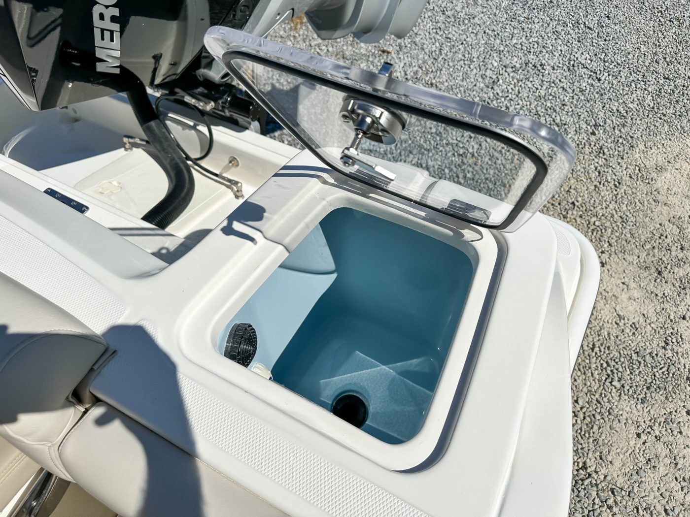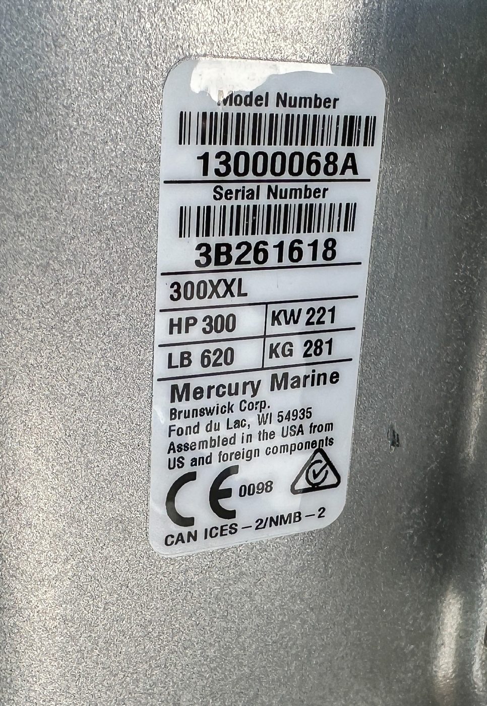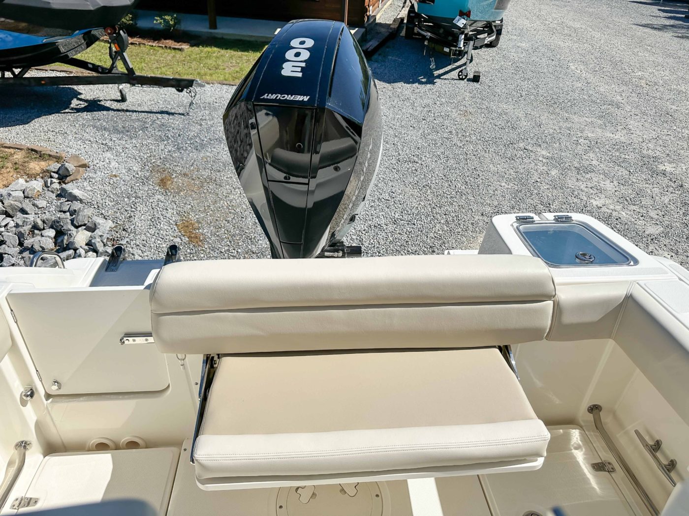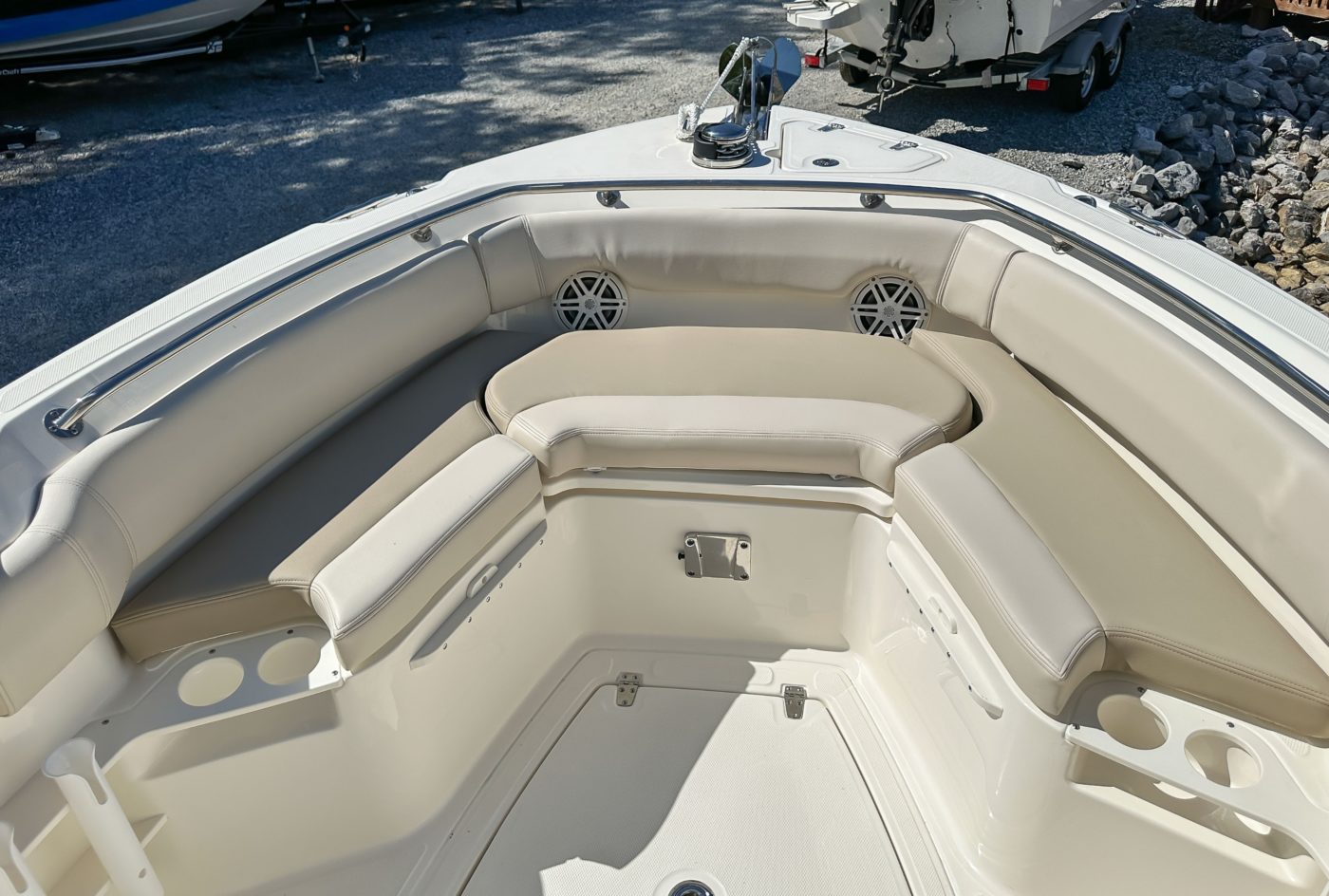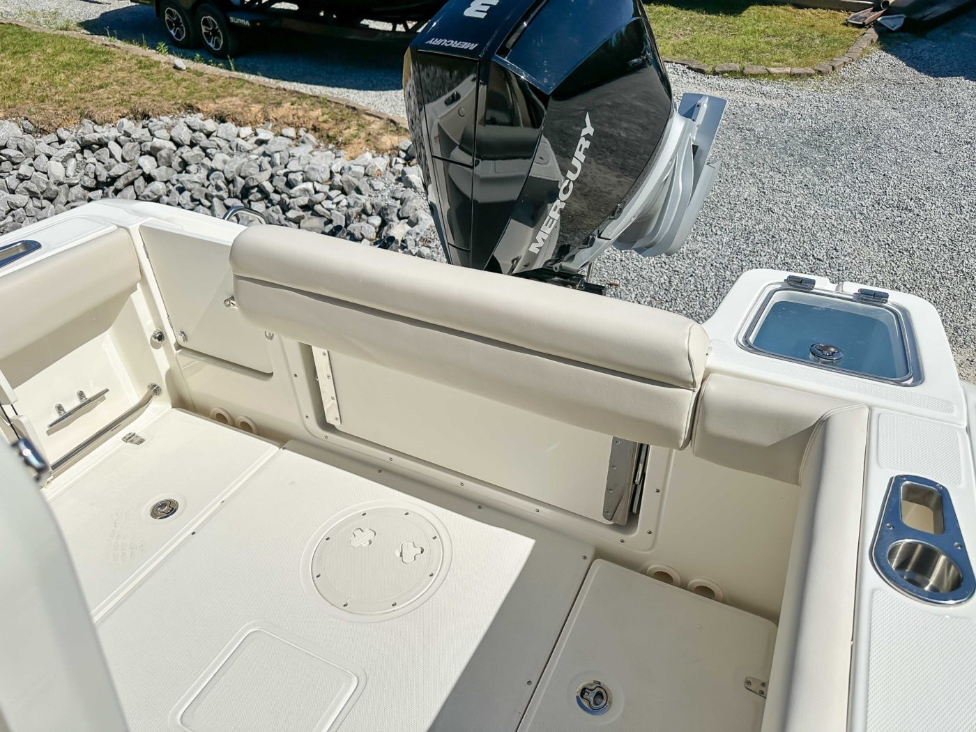 All hardware 316-L stainless steel All rails welded 316-L stainless steel DECK/COCKPIT 8 stainless steel cleats bow (2), stern with stainless steel hawse pipes (2), spring line (2) 25 interior freeboard Bow and stern eyes Cockpit courtesy lights Drink holders (6) Gunnel mounted stainless steel rod holders (4) Heavy-duty rub rail (white) Integral swim platform with recessed telescoping stainless steel swim ladder and grab rail Livewell (16 gallons) Motorwell drains (2) Recessed welded stainless steel forward rails Self-bailing cockpit sole Stainless steel anchor roller with cleat Stainless steel cockpit toe rails with downrigger weight holders Stainless steel grab rails Stern stainless steel hawse pipes with drink holders (2) Transom door with stainless steel latch Vertical rod holders (bow)(port and starboard) (4) CONSOLE 12-V receptacle (2)(delete 1 when stereo is selected for USB port) Access panel to electronics Acrylic entry door with lock Acrylic windshield Cast stainless steel steering wheel with knob Compass Courtesy lights (4) Electronics mounting surface Fire extinguisher pocket Helm and companion footrests Instrumentation and electrical switch panel with circuit breaker protection and illuminated text Interior light Molded fiberglass console liner Portable head in console Stainless steel drink holders (2) Stainless steel grab rails (2) Stainless steel opening port light with screen SEATING Bow seating area Integrated forward console seat with base and backrest cushion Fold-out stern seat with backrest bolster Powder coated convertible forward/aft facing leaning post with flip up bolster, fold down work surface and 54 qt. igloo cooler STORAGE Bow anchor locker with drain Console storage with lockable stainless steel latch In-deck fishboxes with overboard drains (port and starboard) with compression latches Insulated bow storage locker / fishbox Under gunnel rod racks MECHANICAL 250 V8 DTS Black Mercury Verado engine with hydraulic steering and fuel/water separator Automatic bilge pump Dual battery trays with switch Electric horn Fuel tank (110 gallons) LED navigation lights Recessed electric trim tabs with indicators SmartCraft deluxe gauge package (replaced with VesselView 4 on dual engine option Stainless steel propeller Tilt steering Transducer mount area Vessel view mobile