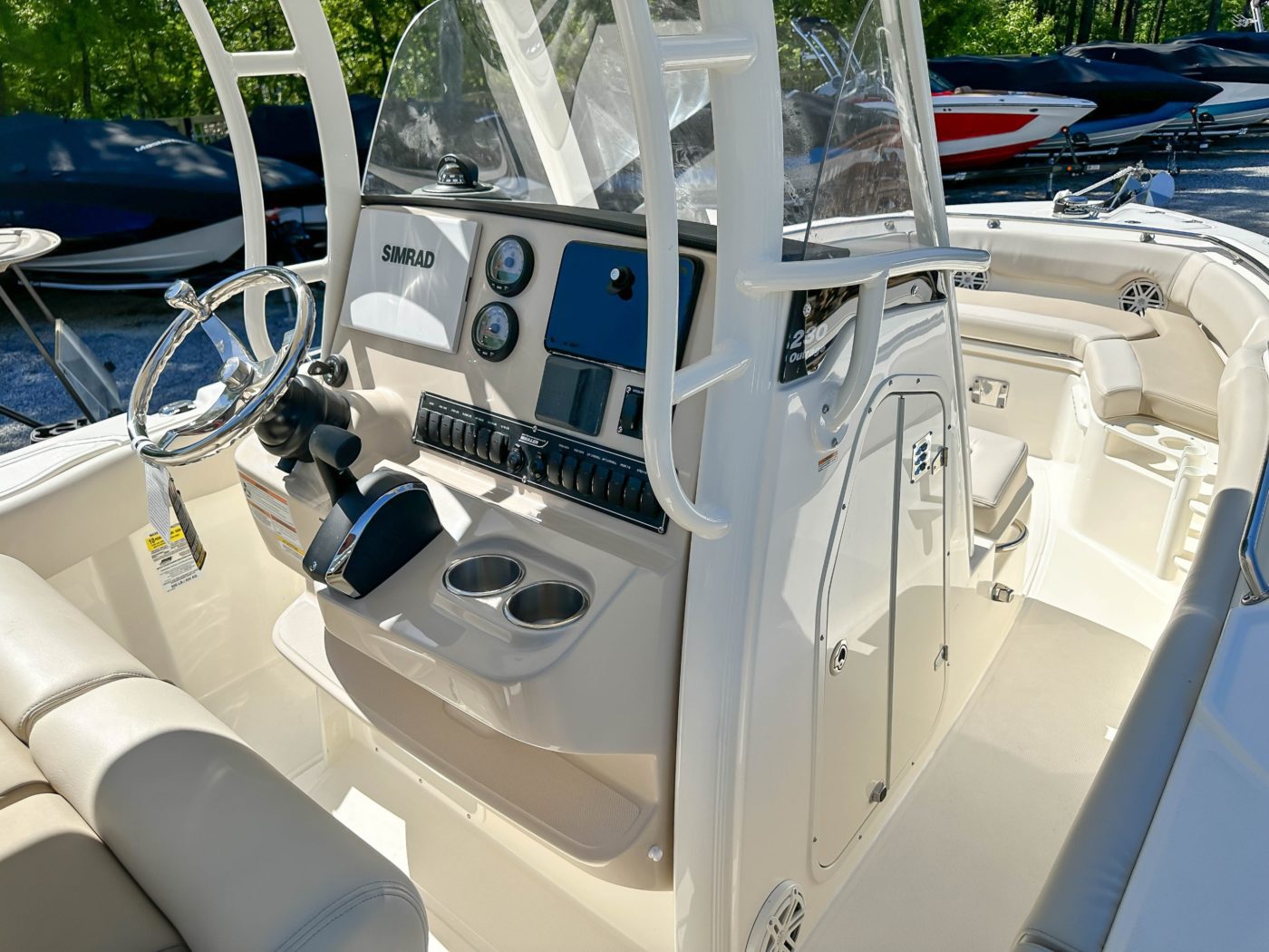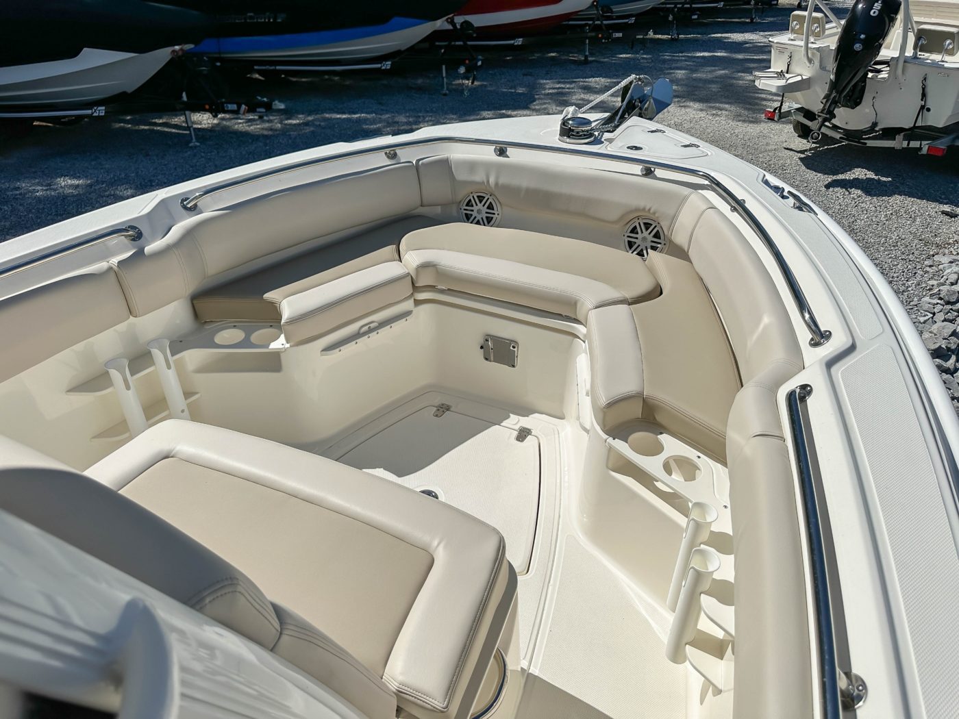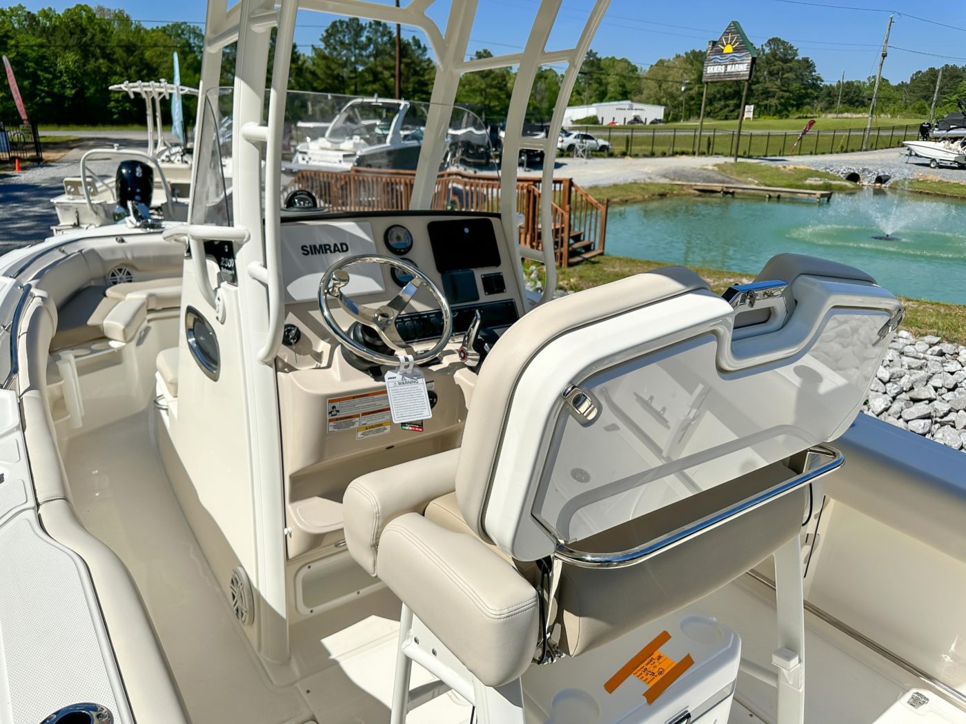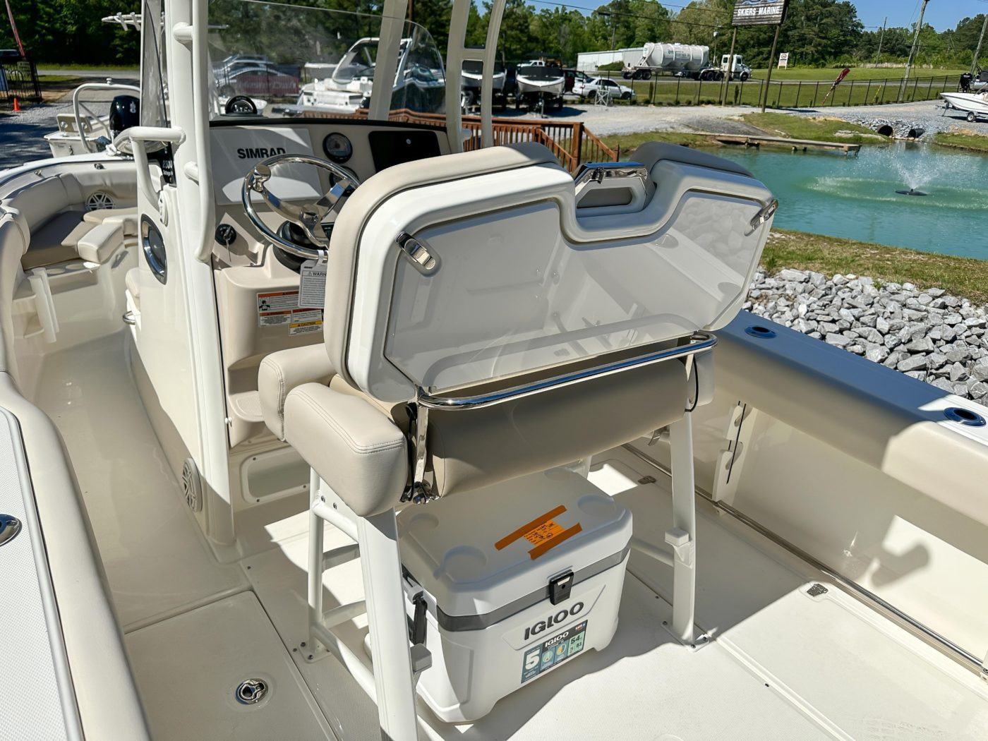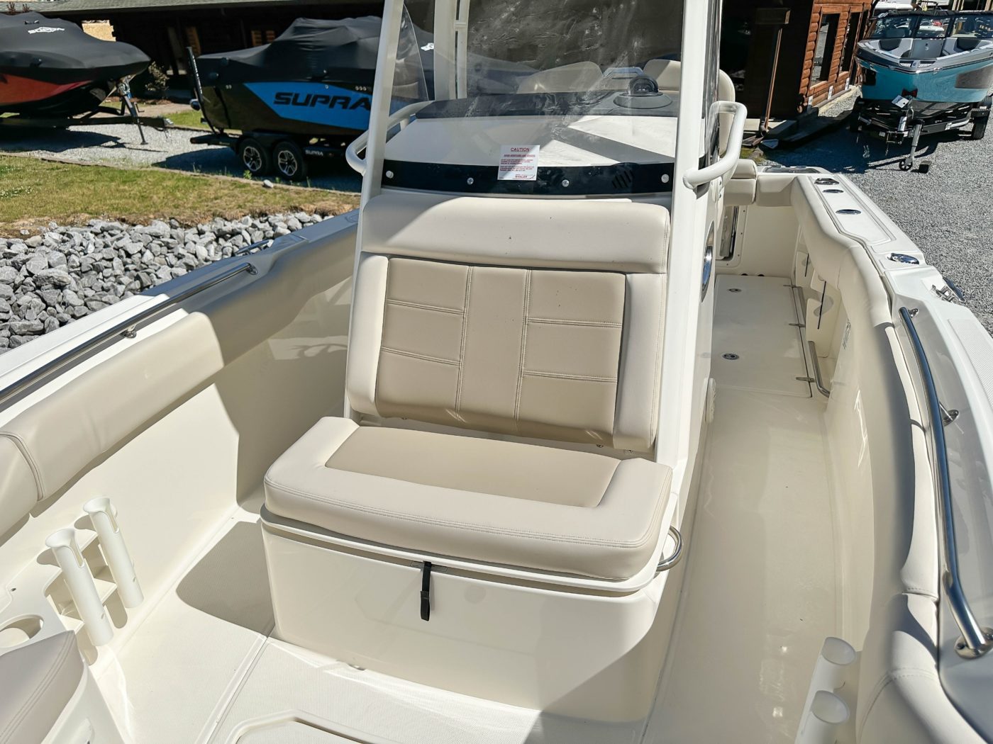 All hardware 316-L stainless steel All rails welded 316-L stainless steel DECK/COCKPIT 8 stainless steel cleats bow (2), stern with stainless steel hawse pipes (2), spring line (2) 25 interior freeboard Bow and stern eyes Cockpit courtesy lights Drink holders (6) Gunnel mounted stainless steel rod holders (4) Heavy-duty rub rail (white) Integral swim platform with recessed telescoping stainless steel swim ladder and grab rail Livewell (16 gallons) Motorwell drains (2) Recessed welded stainless steel forward rails Self-bailing cockpit sole Stainless steel anchor roller with cleat Stainless steel cockpit toe rails with downrigger weight holders Stainless steel grab rails Stern stainless steel hawse pipes with drink holders (2) Transom door with stainless steel latch Vertical rod holders (bow)(port and starboard) (4) CONSOLE 12-V receptacle (2)(delete 1 when stereo is selected for USB port) Access panel to electronics Acrylic entry door with lock Acrylic windshield Cast stainless steel steering wheel with knob Compass Courtesy lights (4) Electronics mounting surface Fire extinguisher pocket Helm and companion footrests Instrumentation and electrical switch panel with circuit breaker protection and illuminated text Interior light Molded fiberglass console liner Portable head in console Stainless steel drink holders (2) Stainless steel grab rails (2) Stainless steel opening port light with screen SEATING Bow seating area Integrated forward console seat with base and backrest cushion Fold-out stern seat with backrest bolster Powder coated convertible forward/aft facing leaning post with flip up bolster, fold down work surface and 54 qt. igloo cooler STORAGE Bow anchor locker with drain Console storage with lockable stainless steel latch In-deck fishboxes with overboard drains (port and starboard) with compression latches Insulated bow storage locker / fishbox Under gunnel rod racks MECHANICAL 250 V8 DTS Black Mercury Verado engine with hydraulic steering and fuel/water separator Automatic bilge pump Dual battery trays with switch Electric horn Fuel tank (110 gallons) LED navigation lights Recessed electric trim tabs with indicators SmartCraft deluxe gauge package (replaced with VesselView 4 on dual engine option Stainless steel propeller Tilt steering Transducer mount area Vessel view mobile
