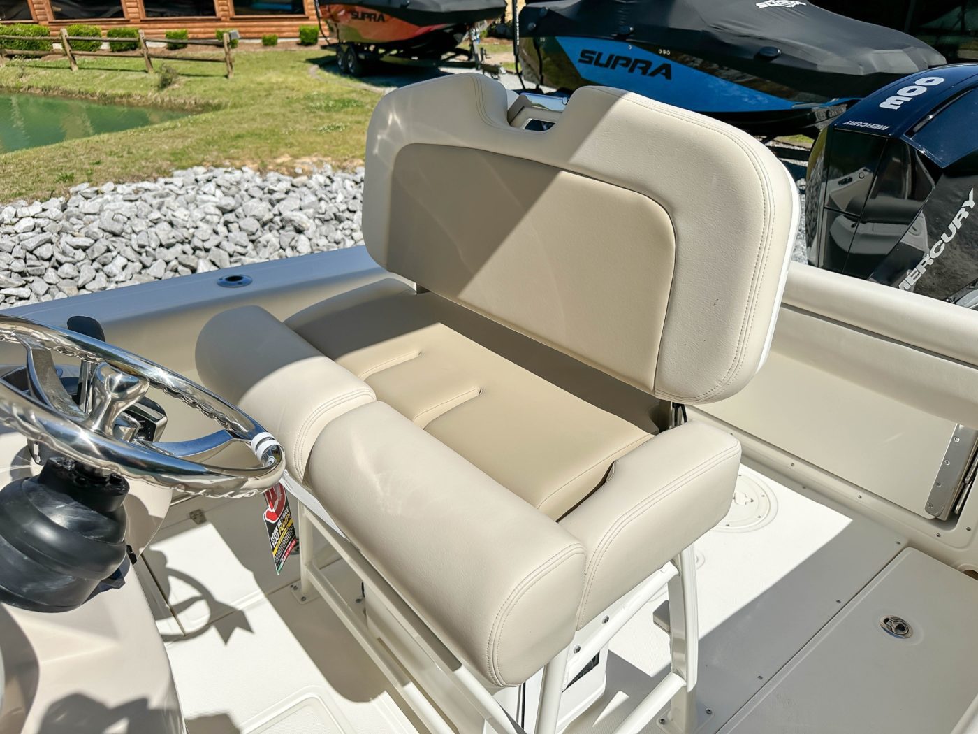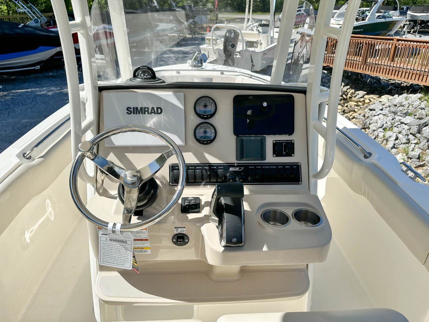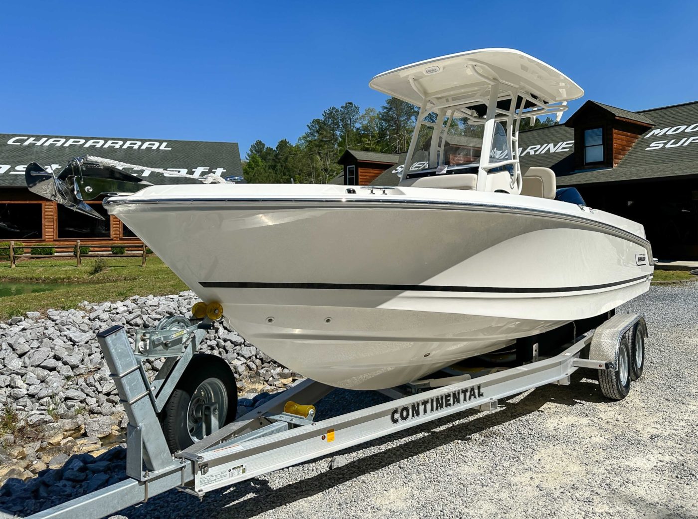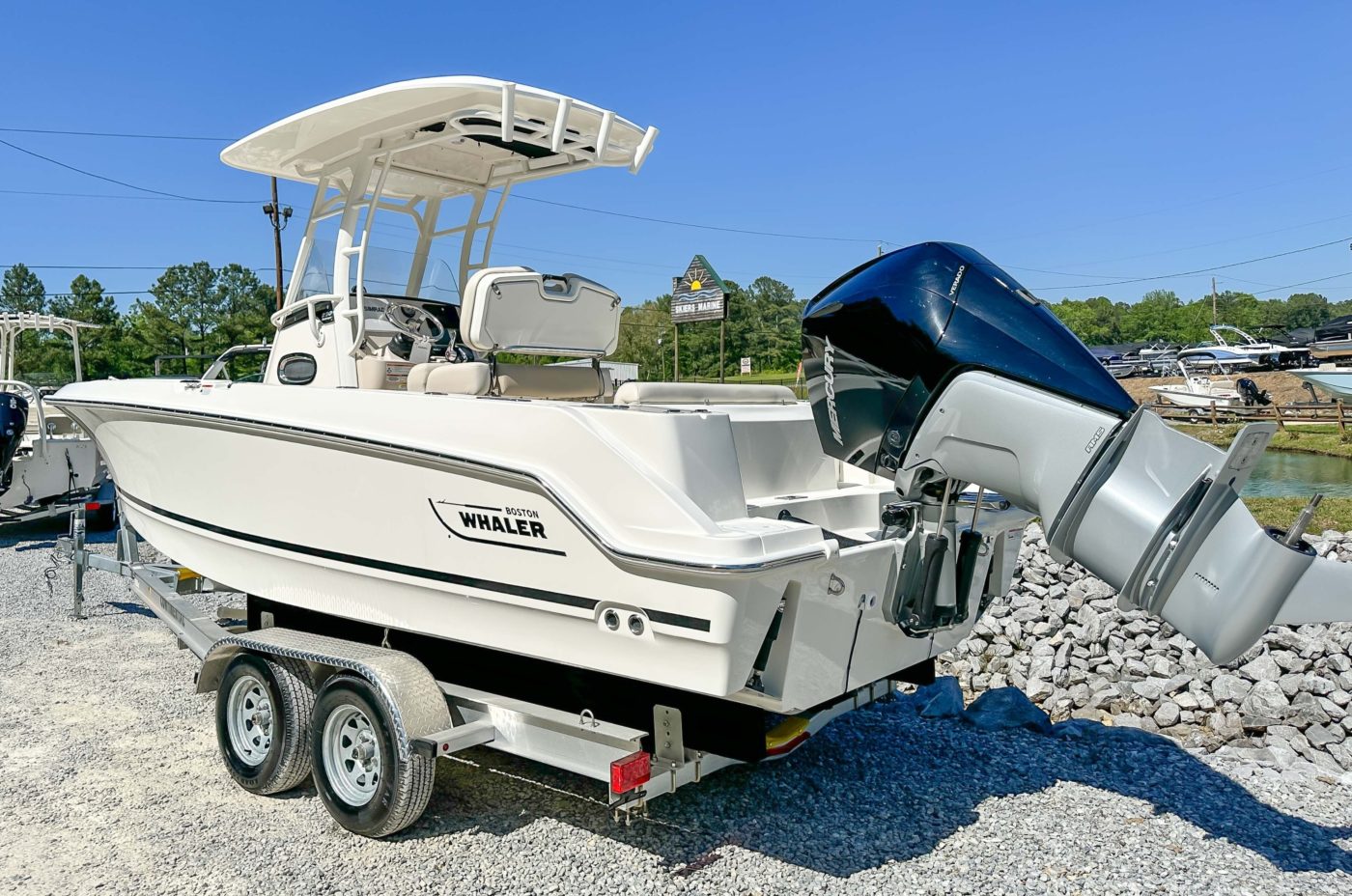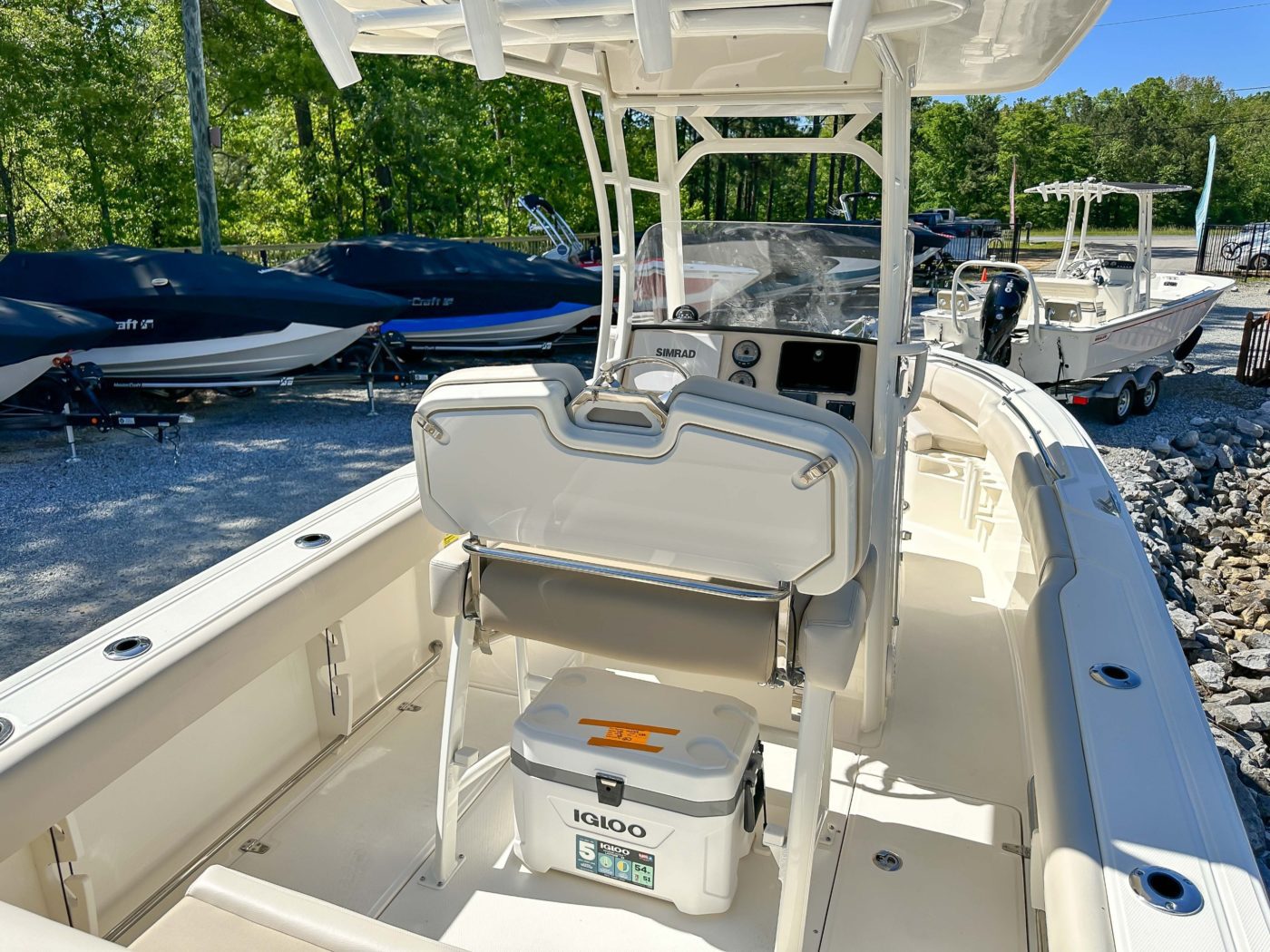 All hardware 316-L stainless steel All rails welded 316-L stainless steel DECK/COCKPIT 8 stainless steel cleats bow (2), stern with stainless steel hawse pipes (2), spring line (2) 25 interior freeboard Bow and stern eyes Cockpit courtesy lights Drink holders (6) Gunnel mounted stainless steel rod holders (4) Heavy-duty rub rail (white) Integral swim platform with recessed telescoping stainless steel swim ladder and grab rail Livewell (16 gallons) Motorwell drains (2) Recessed welded stainless steel forward rails Self-bailing cockpit sole Stainless steel anchor roller with cleat Stainless steel cockpit toe rails with downrigger weight holders Stainless steel grab rails Stern stainless steel hawse pipes with drink holders (2) Transom door with stainless steel latch Vertical rod holders (bow)(port and starboard) (4) CONSOLE 12-V receptacle (2)(delete 1 when stereo is selected for USB port) Access panel to electronics Acrylic entry door with lock Acrylic windshield Cast stainless steel steering wheel with knob Compass Courtesy lights (4) Electronics mounting surface Fire extinguisher pocket Helm and companion footrests Instrumentation and electrical switch panel with circuit breaker protection and illuminated text Interior light Molded fiberglass console liner Portable head in console Stainless steel drink holders (2) Stainless steel grab rails (2) Stainless steel opening port light with screen SEATING Bow seating area Integrated forward console seat with base and backrest cushion Fold-out stern seat with backrest bolster Powder coated convertible forward/aft facing leaning post with flip up bolster, fold down work surface and 54 qt. igloo cooler STORAGE Bow anchor locker with drain Console storage with lockable stainless steel latch In-deck fishboxes with overboard drains (port and starboard) with compression latches Insulated bow storage locker / fishbox Under gunnel rod racks MECHANICAL 250 V8 DTS Black Mercury Verado engine with hydraulic steering and fuel/water separator Automatic bilge pump Dual battery trays with switch Electric horn Fuel tank (110 gallons) LED navigation lights Recessed electric trim tabs with indicators SmartCraft deluxe gauge package (replaced with VesselView 4 on dual engine option Stainless steel propeller Tilt steering Transducer mount area Vessel view mobile