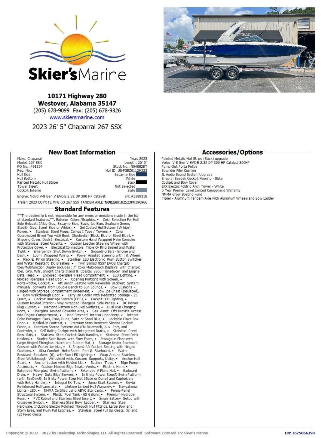 • Trailer – Aluminum Tandem Axle with Aluminum Wheels and Bow Ladder