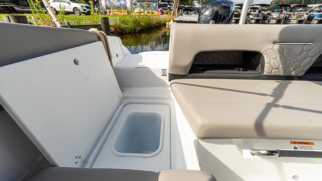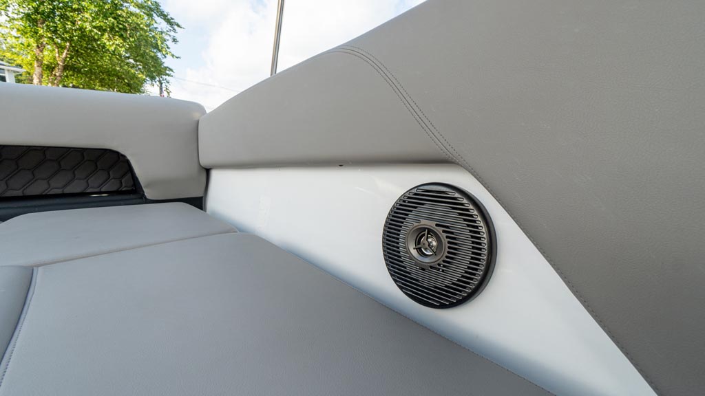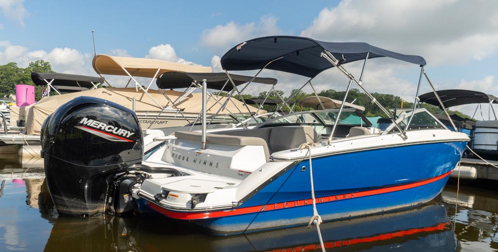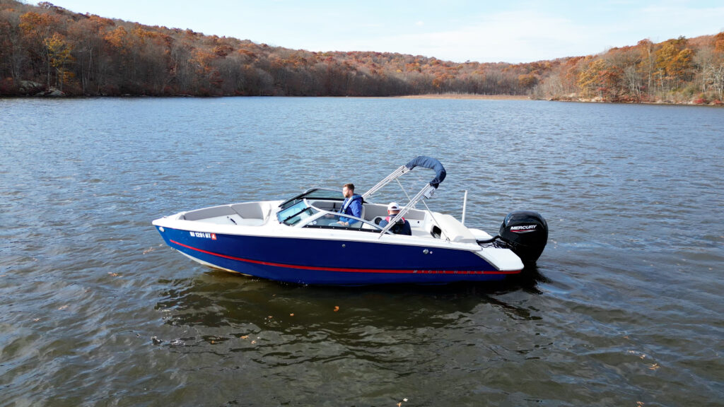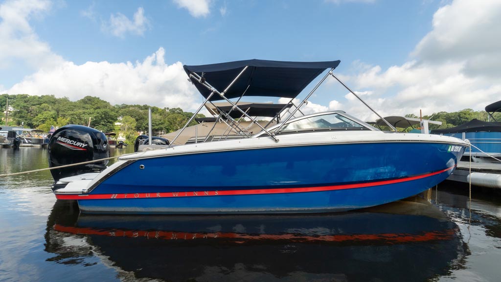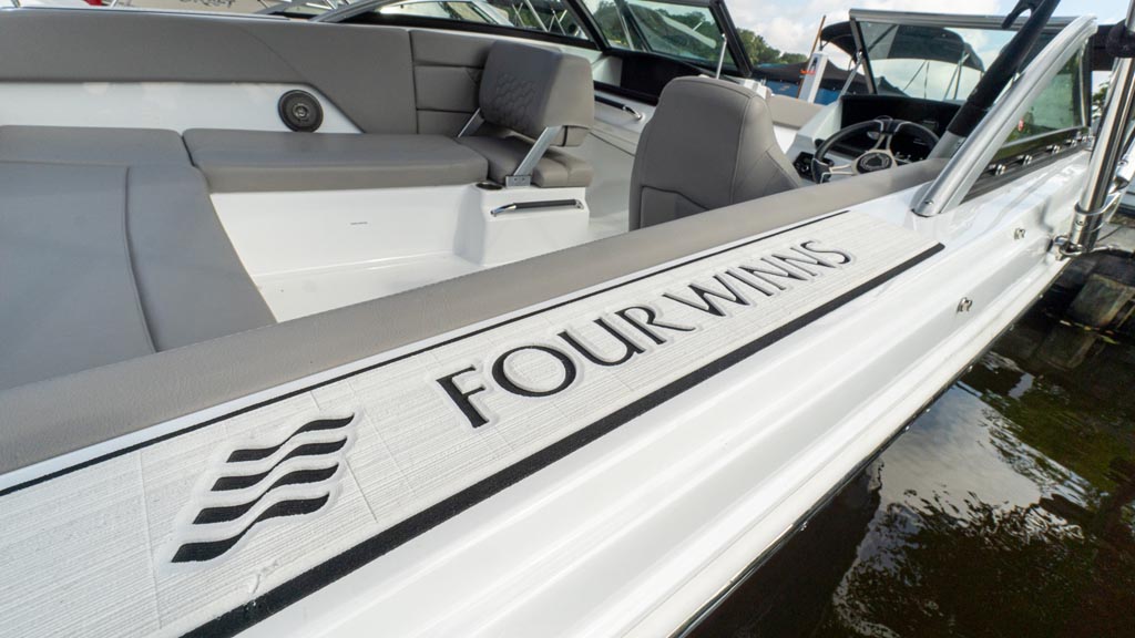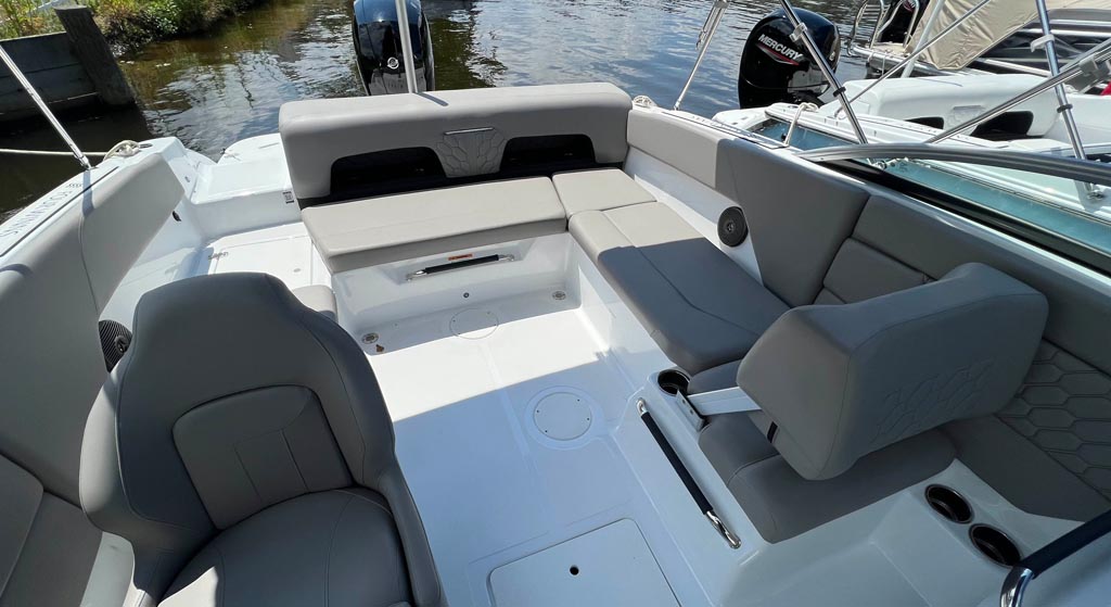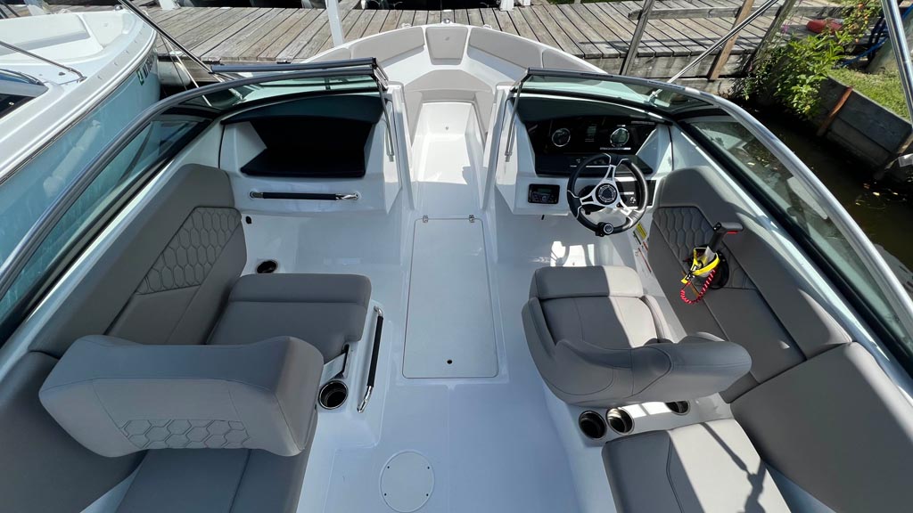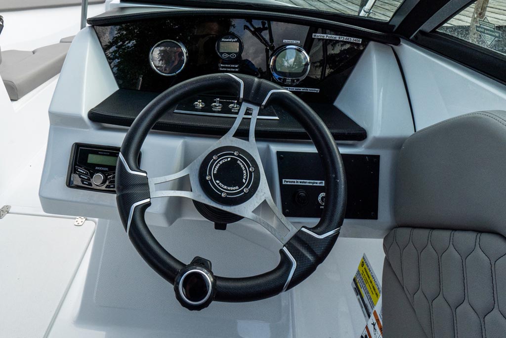 This strikingly gorgeous denim blue 2023 Four Winns H1C OB with red gel stripe and lunar interior color scheme is poised to set the new standard in the 20 foot bowrider segment.