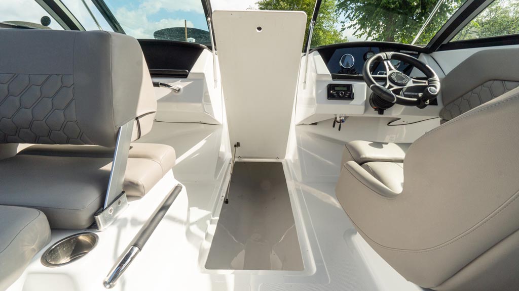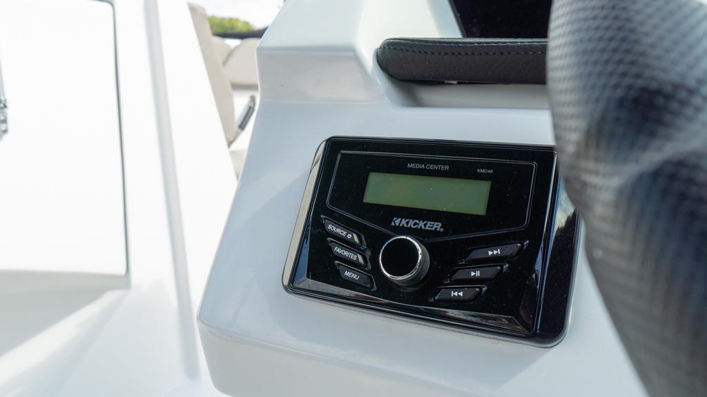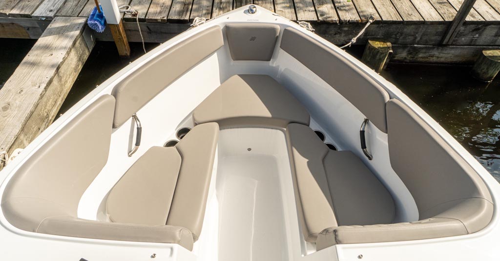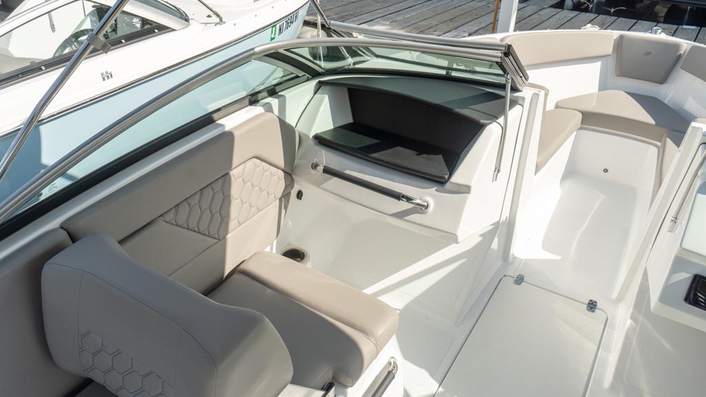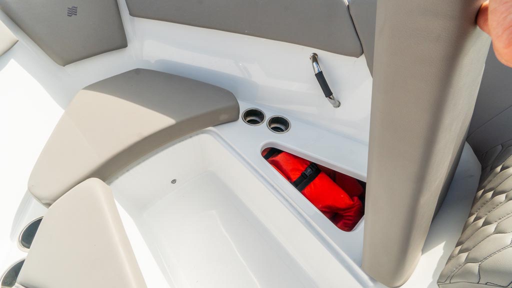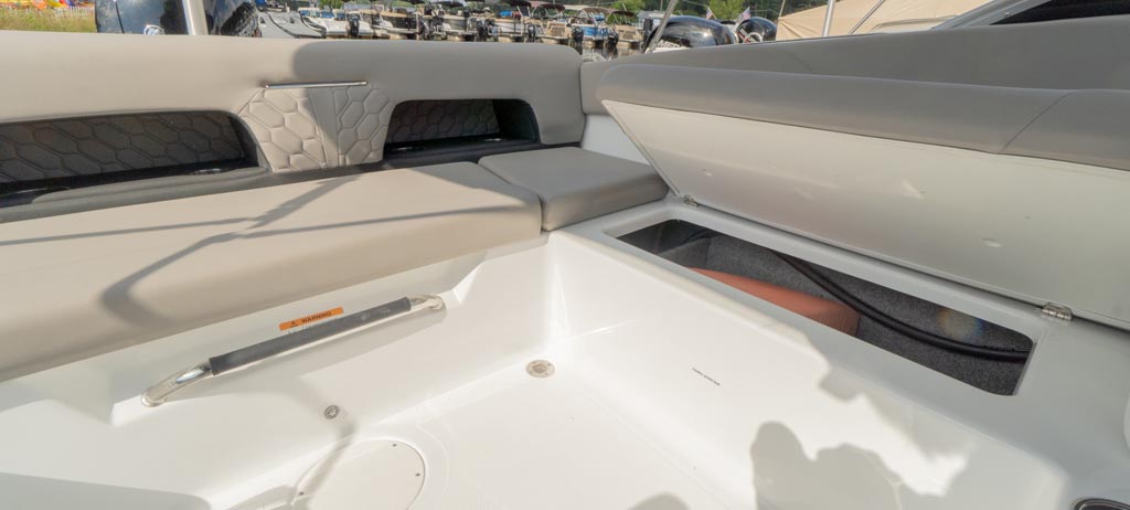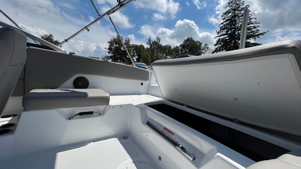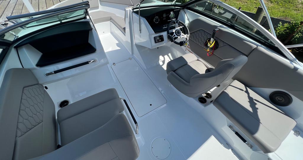 Fine appointments, leather wrapped grab handles, stainless cup holders, quilted stitching and all the details that raise the bar AND meet our expectations. We love the stylish lines and comfortable seating this beauty offers. Outfitted with a perfect combination of additional options, including: Ski tow pylon; cockpit and bow cover; bimini with canvas; GPS plotter with depth sounder dash mount; dual battery with switch.