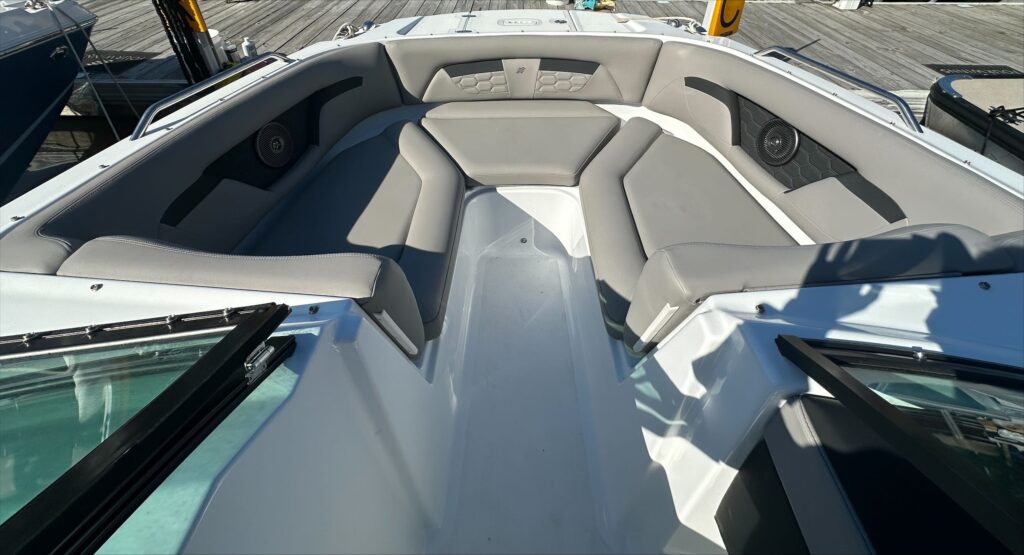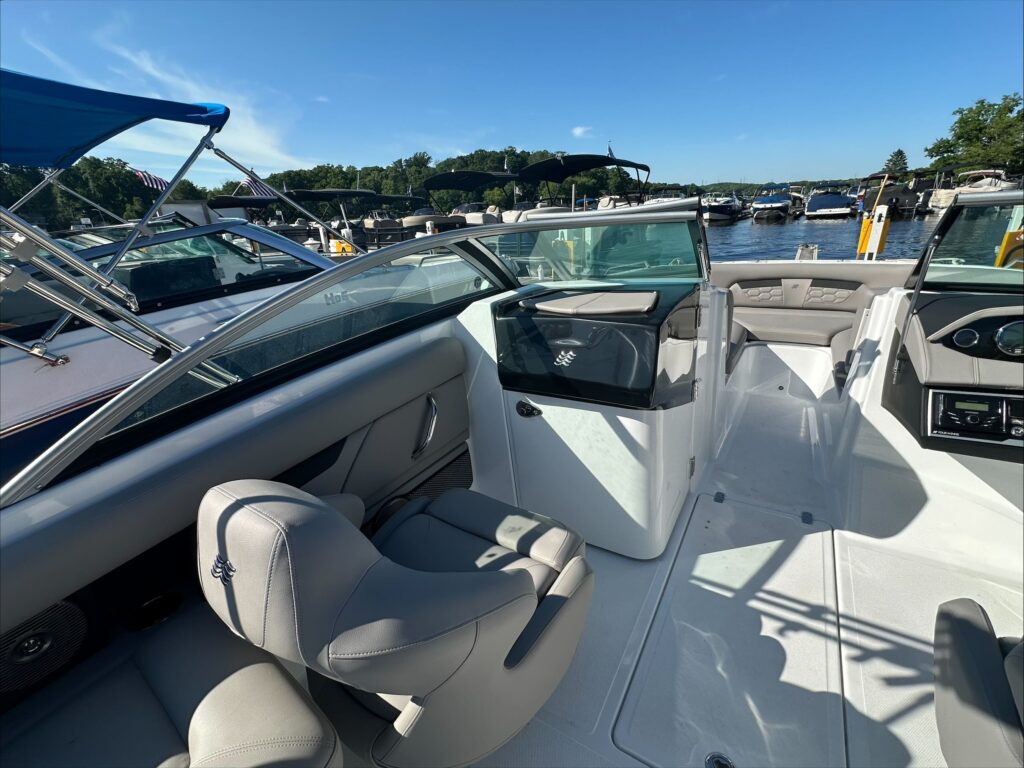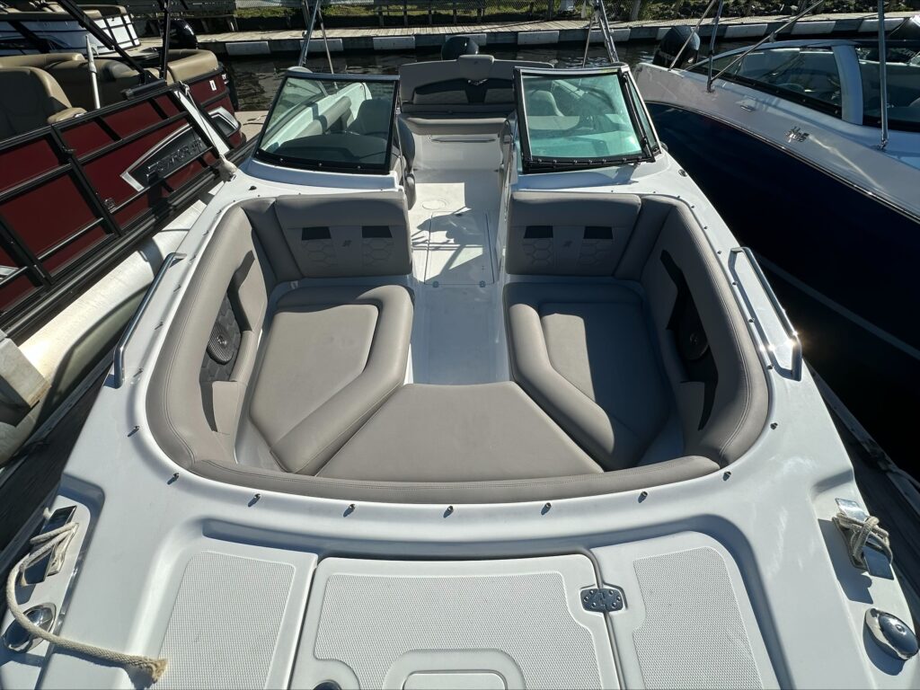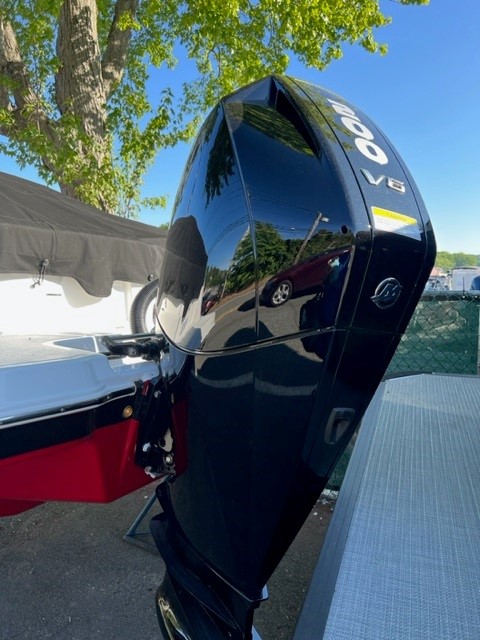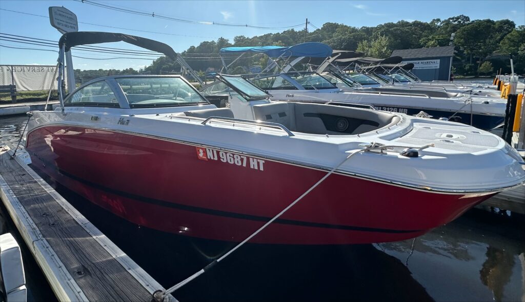 This beautifully classic red HD3 OB is a hybrid deck boat that raises the bar on everything. The interior is furnished with gorgeous upholstery and plush bucket seats that are designed with so much padding you could take an endless ride.