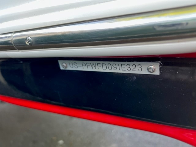 Features include black bimini top with canvas and cover, white and crimson red solid color hull, GPS Plotter, cockpit and bow covers, dual battery system with switch, and premium steering wheel.