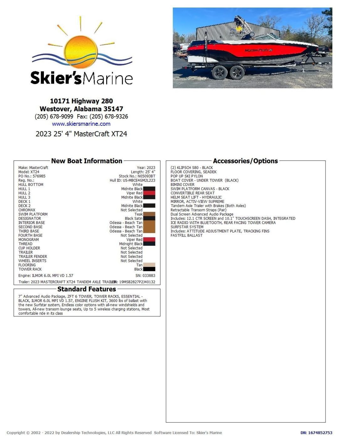 FLOOR COVERING, SEADEKPOP UP SKI PYLONBIMINI COVERSWIM PLATFORM CANVAS – BLACKBOAT COVER – UNDER TOWER (BLACK)CONVERTIBLE REAR SEATHELM SEAT LIFT – HYDRAULICMIRROR, ACTIV-VIEW SUPREMETandem Axle Trailer with Brakes (Both Axles)Retractable Transom Straps (Pair)Dual Screen Advanced Audio Package Includes: 12.1 CTR SCREEN and 10.1″ TOUCHSCREEN DASH, INTEGRATED ICE RADIO WITH BLUETOOTH, REAR FACING TOWER CAMERASURFSTAR SYSTEM Includes: ATTITUDE ADJUSTMENT PLATE, TRACKING FINSFASTFILL BALLASTMASTERCRAFT “SUMMER OF SAVINGS” ZFT 6 TOWERTOWER RACKS, ESSENTIAL – BLACKILMOR 6.0L MPI VD 1.57ENGINE FLUSH KIT3600 lbs of ballast with the new Surfstar systemEndless color options with all-new windshields and towersAll-new transom lounge seatsUp to 5 wireless charging stationsMost comfortable ride in its class