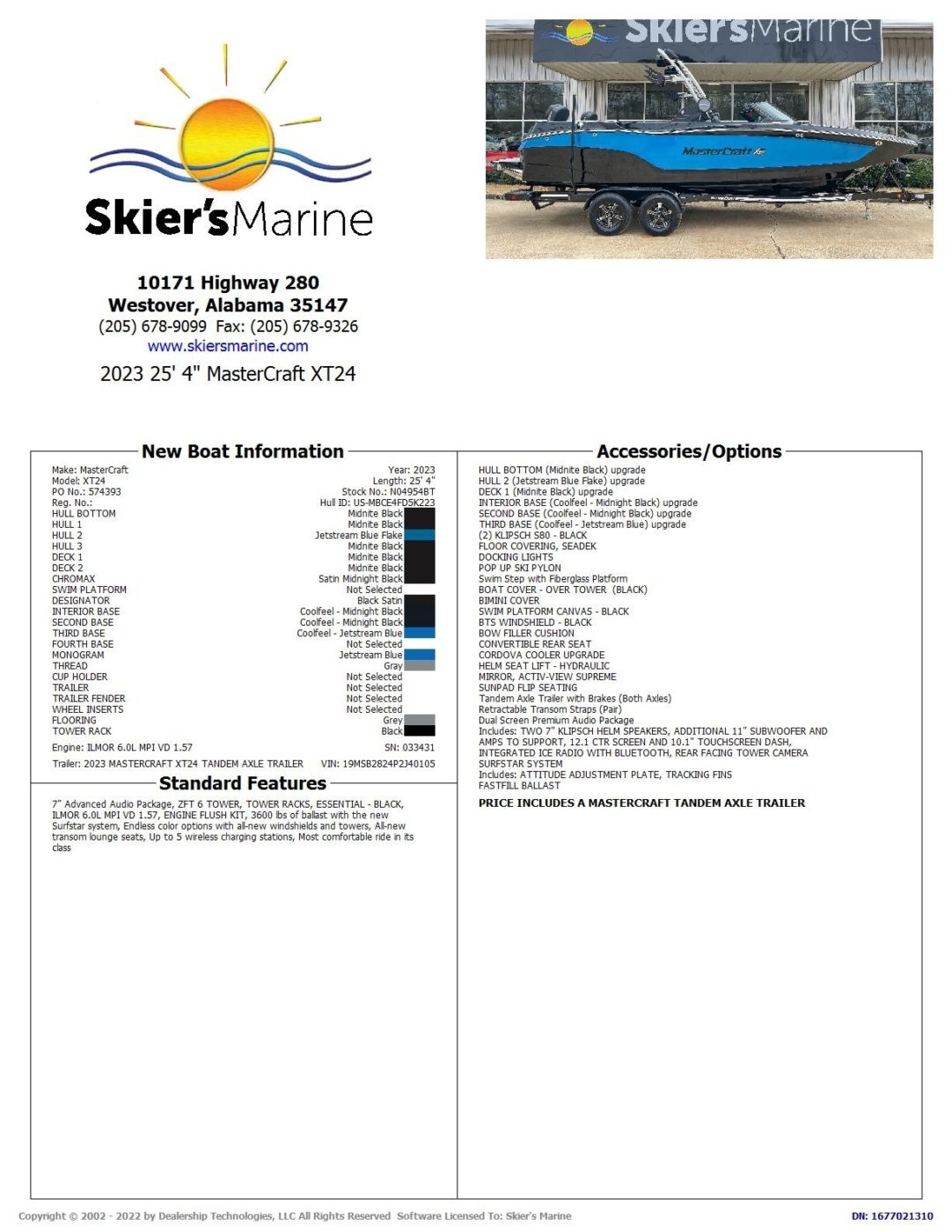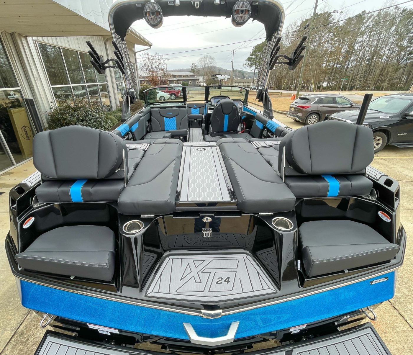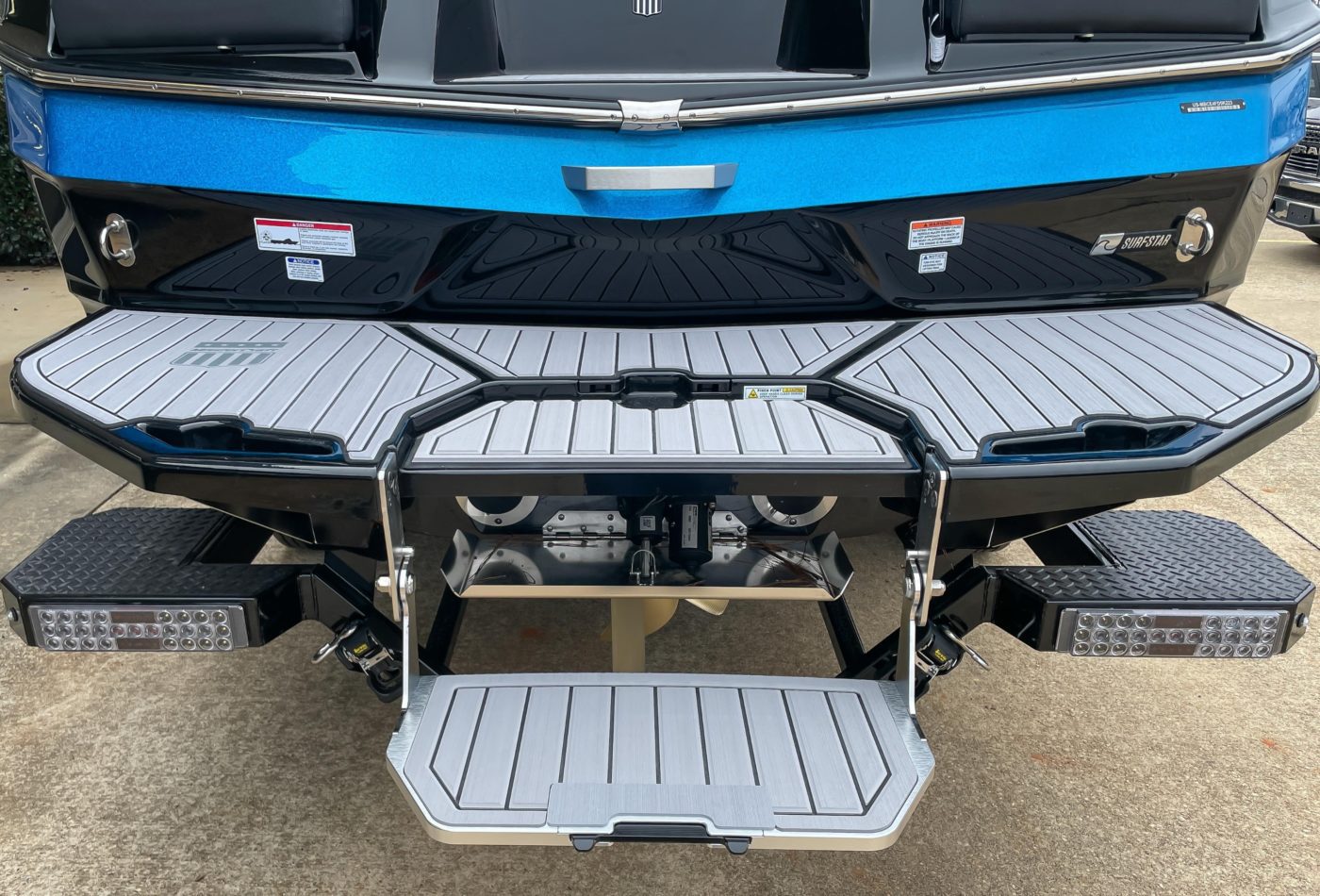 HULL 2 (Jetstream Blue Flake) upgradeDECK 1 (Midnite Black) upgradeINTERIOR BASE (Coolfeel – Midnight Black) upgradeSECOND BASE (Coolfeel – Midnight Black) upgradeTHIRD BASE (Coolfeel – Jetstream Blue) upgrade(2) KLIPSCH S80 – BLACKFLOOR COVERING, SEADEKDOCKING LIGHTSPOP UP SKI PYLONSwim Step with Fiberglass PlatformBIMINI COVERSWIM PLATFORM CANVAS – BLACKBOAT COVER – OVER TOWER (BLACK)BOW FILLER CUSHIONCONVERTIBLE REAR SEATCORDOVA COOLER UPGRADEHELM SEAT LIFT – HYDRAULICSUNPAD FLIP SEATINGBTS WINDSHIELD – BLACKMIRROR, ACTIV-VIEW SUPREMETandem Axle Trailer with Brakes (Both Axles)Retractable Transom Straps (Pair)Dual Screen Premium Audio Package Includes: TWO 7″ KLIPSCH HELM SPEAKERS, ADDITIONAL 11″ SUBWOOFER AND AMPS TO SUPPORT, 12.1 CTR SCREEN AND 10.1″ TOUCHSCREEN DASH, INTEGRATED ICE RADIO WITH BLUETOOTH, REAR FACING TOWER CAMERASURFSTAR SYSTEM Includes: ATTITUDE ADJUSTMENT PLATE, TRACKING FINSFASTFILL BALLASTPRICE INCLUDES A MASTERCRAFT TANDEM AXLE TRAILERMASTERCRAFT “SUMMER OF SAVINGS” ZFT 6 TOWERTOWER RACKS, ESSENTIAL – BLACKILMOR 6.0L MPI VD 1.57ENGINE FLUSH KIT3600 lbs of ballast with the new Surfstar systemEndless color options with all-new windshields and towersAll-new transom lounge seatsUp to 5 wireless charging stationsMost comfortable ride in its class