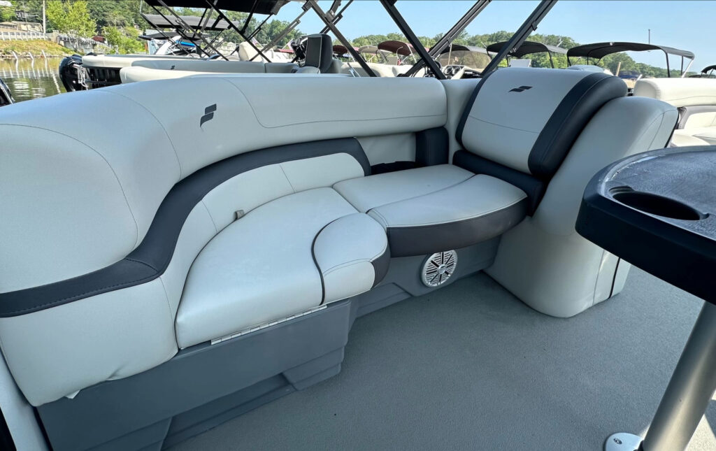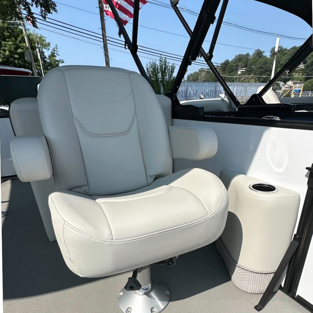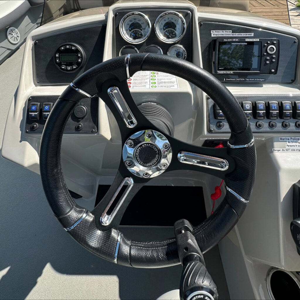 Equipped with plenty of convenient features including black power bimini top and playpen cover, full vinyl flooring in gray, Jensen radio and sound system, Graph Helix 5 GPS, pylon ski tow, and more!