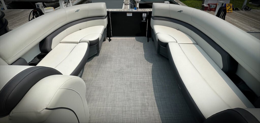 Features include full seaweave flooring in gray, extended rear deck with closeout, black power bimini top and playpen cover, GPS with flush mount, pylon ski tow, and more!