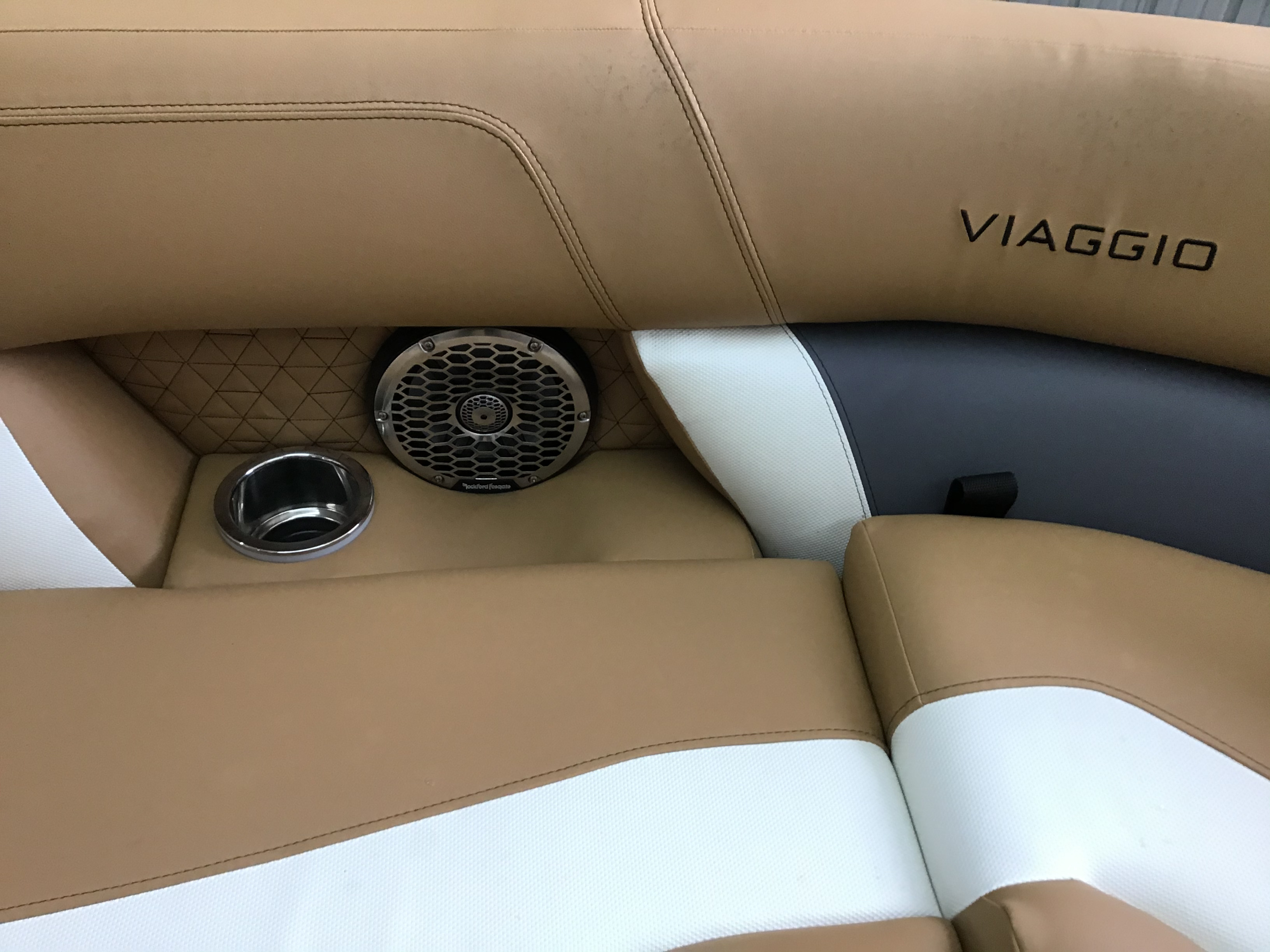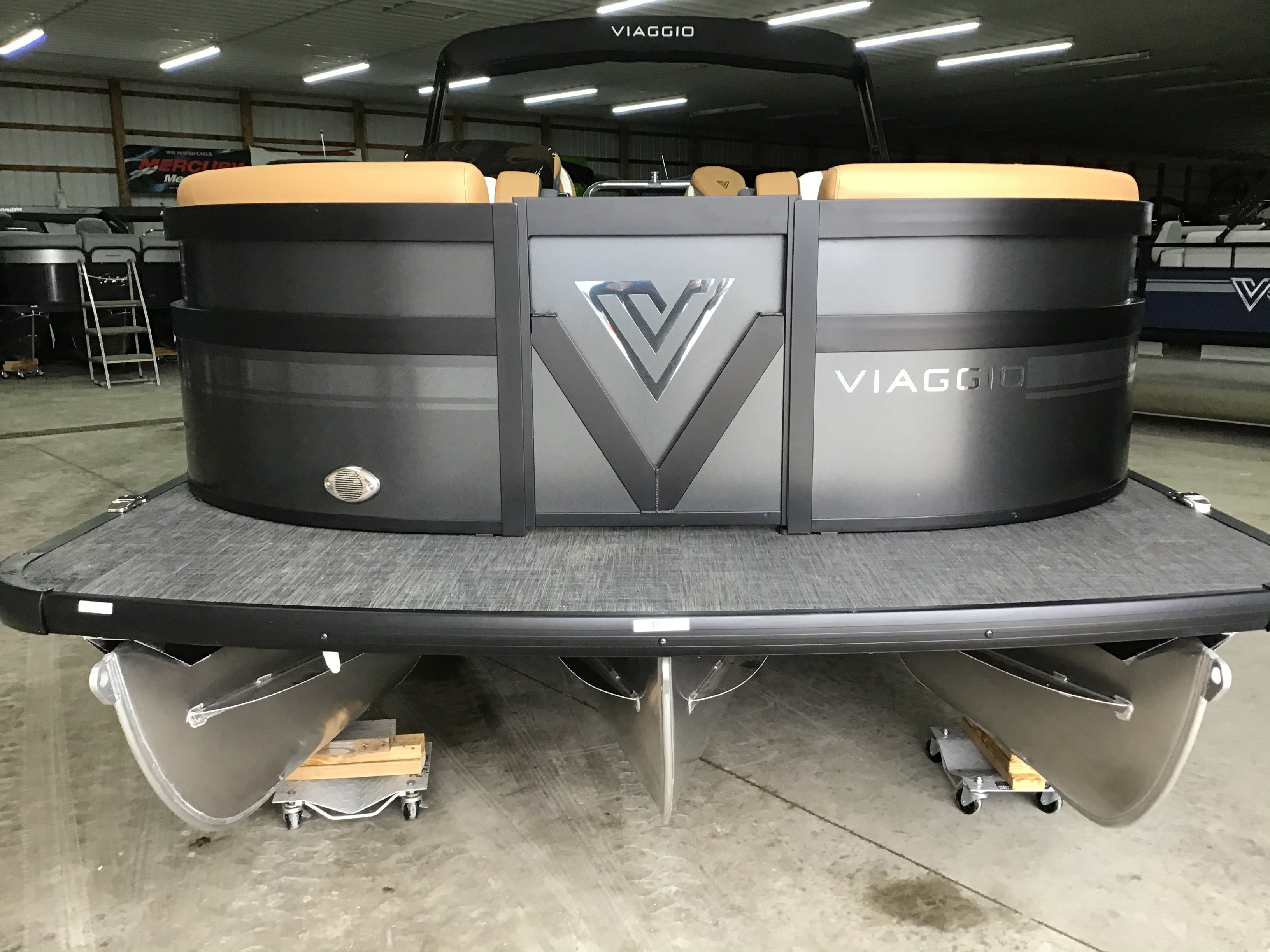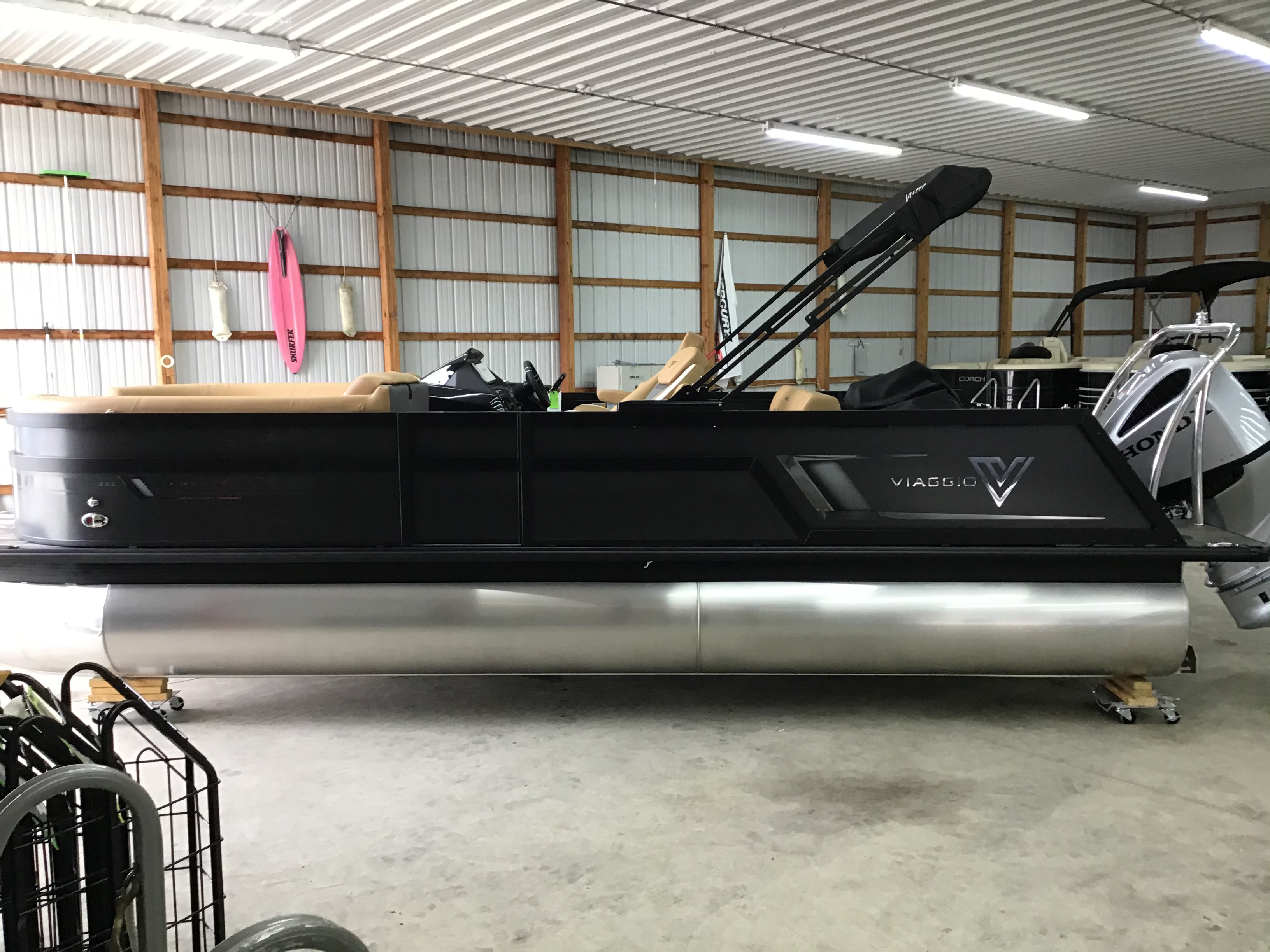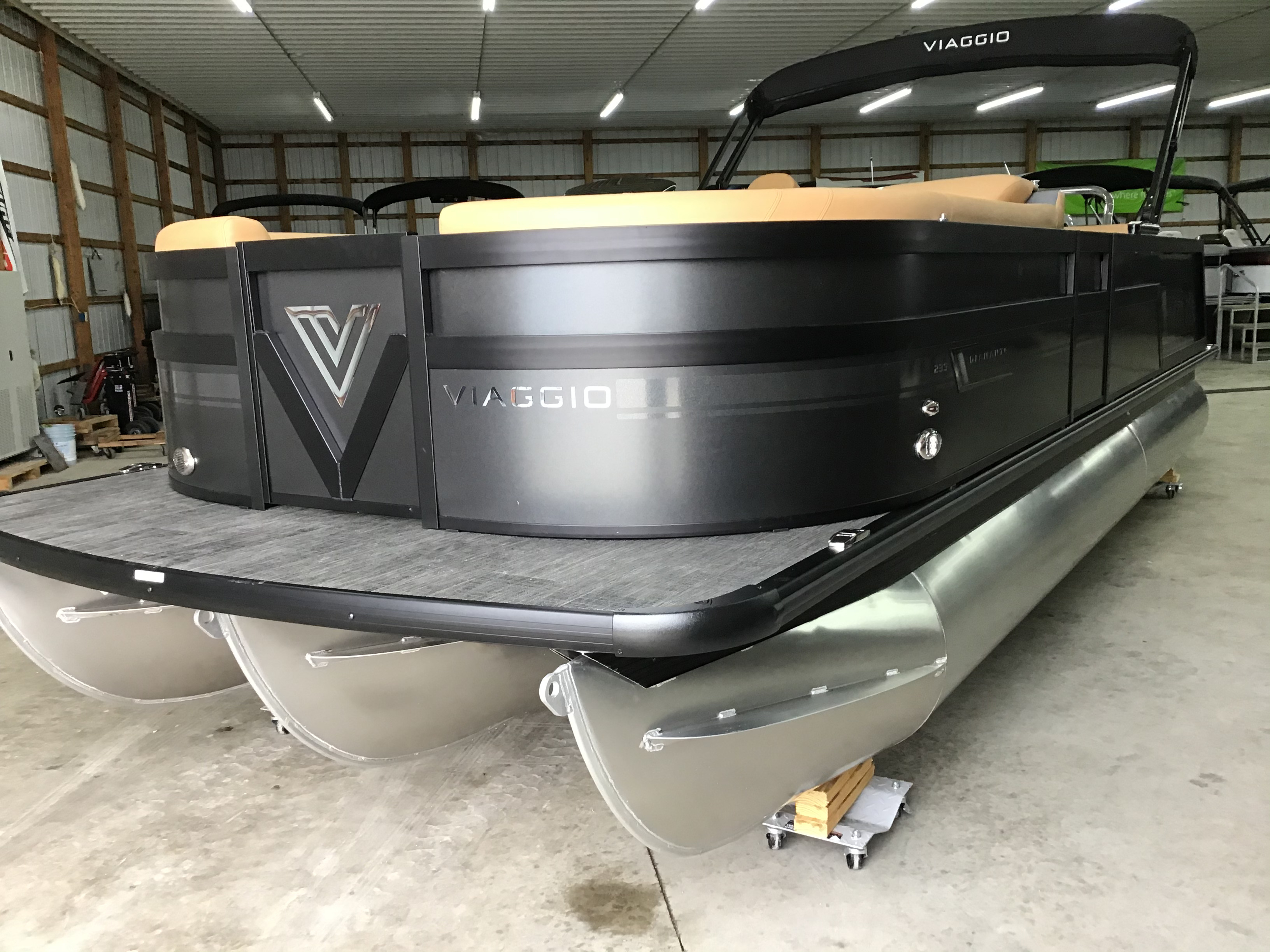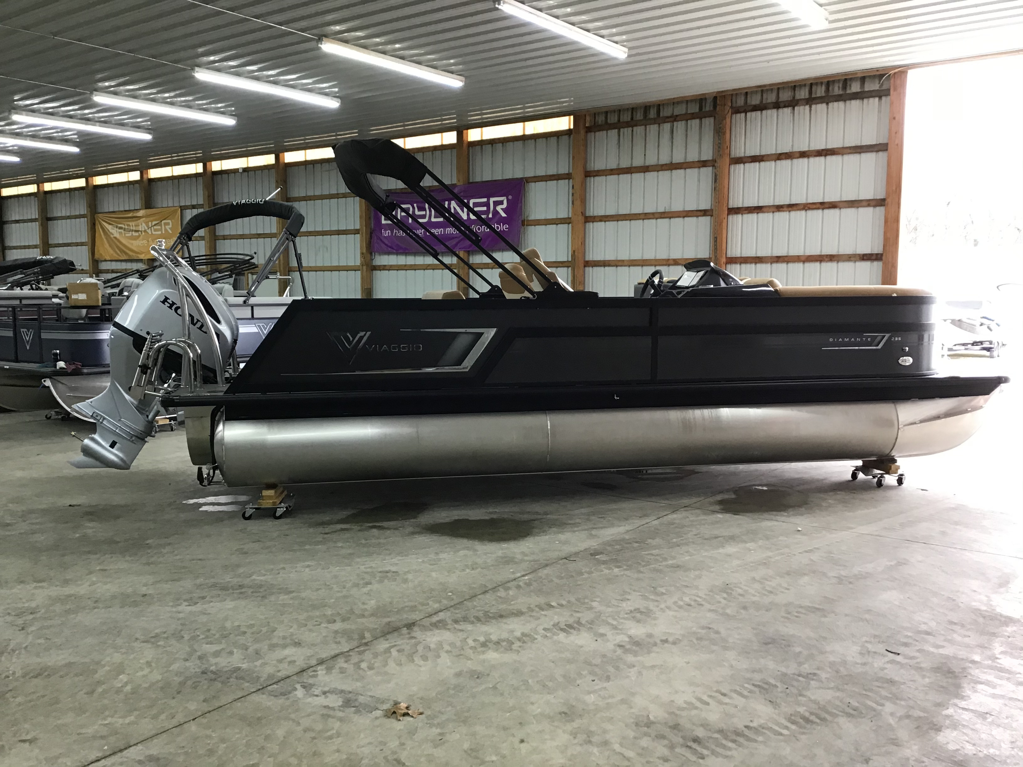 New 2023 Viaggio Diamante S 23 Tritoon with Full Platinum Package, Power Bimini and BF250 hp Honda, available now at Fay’s Marina in La Porte, Indiana