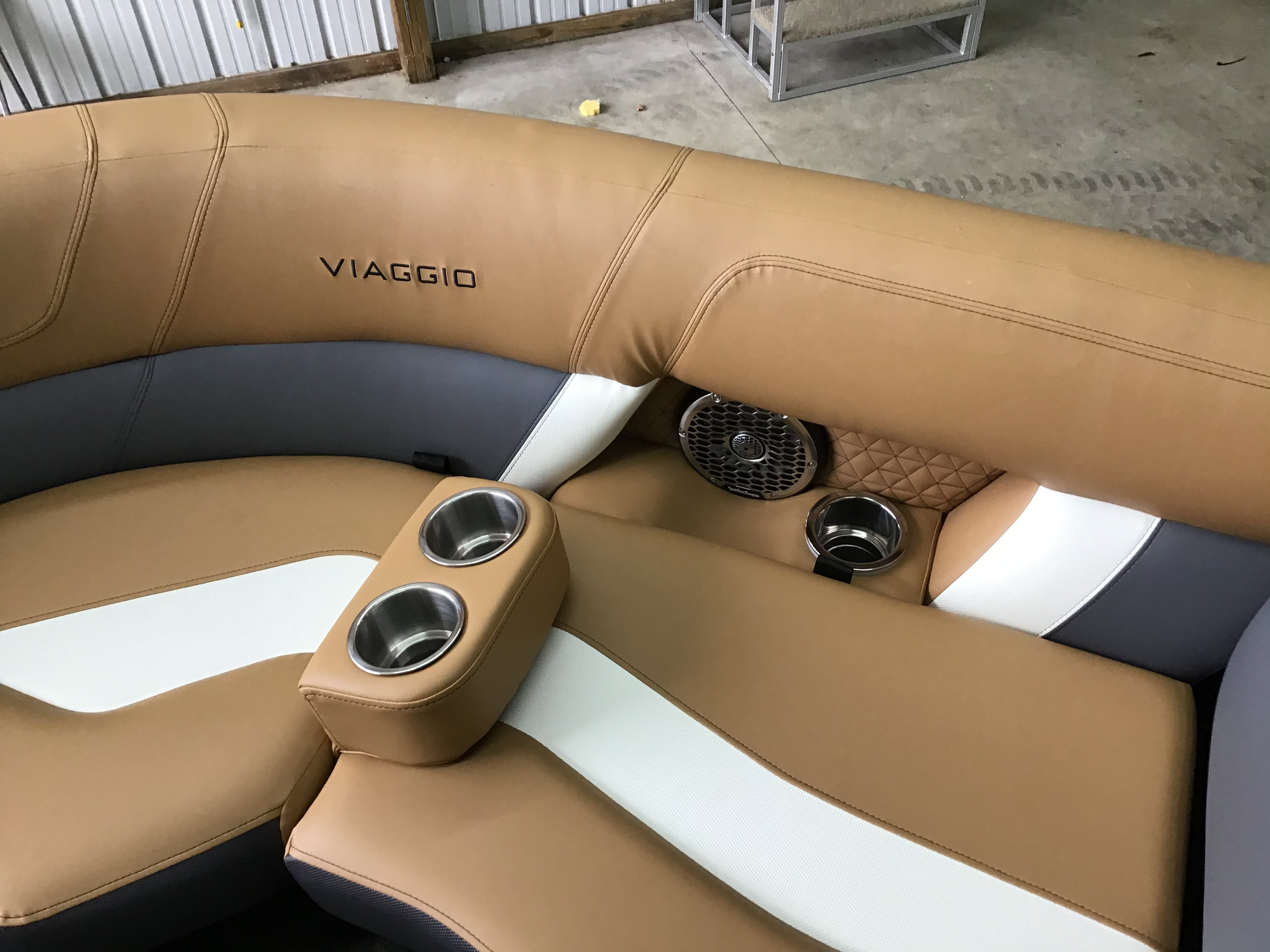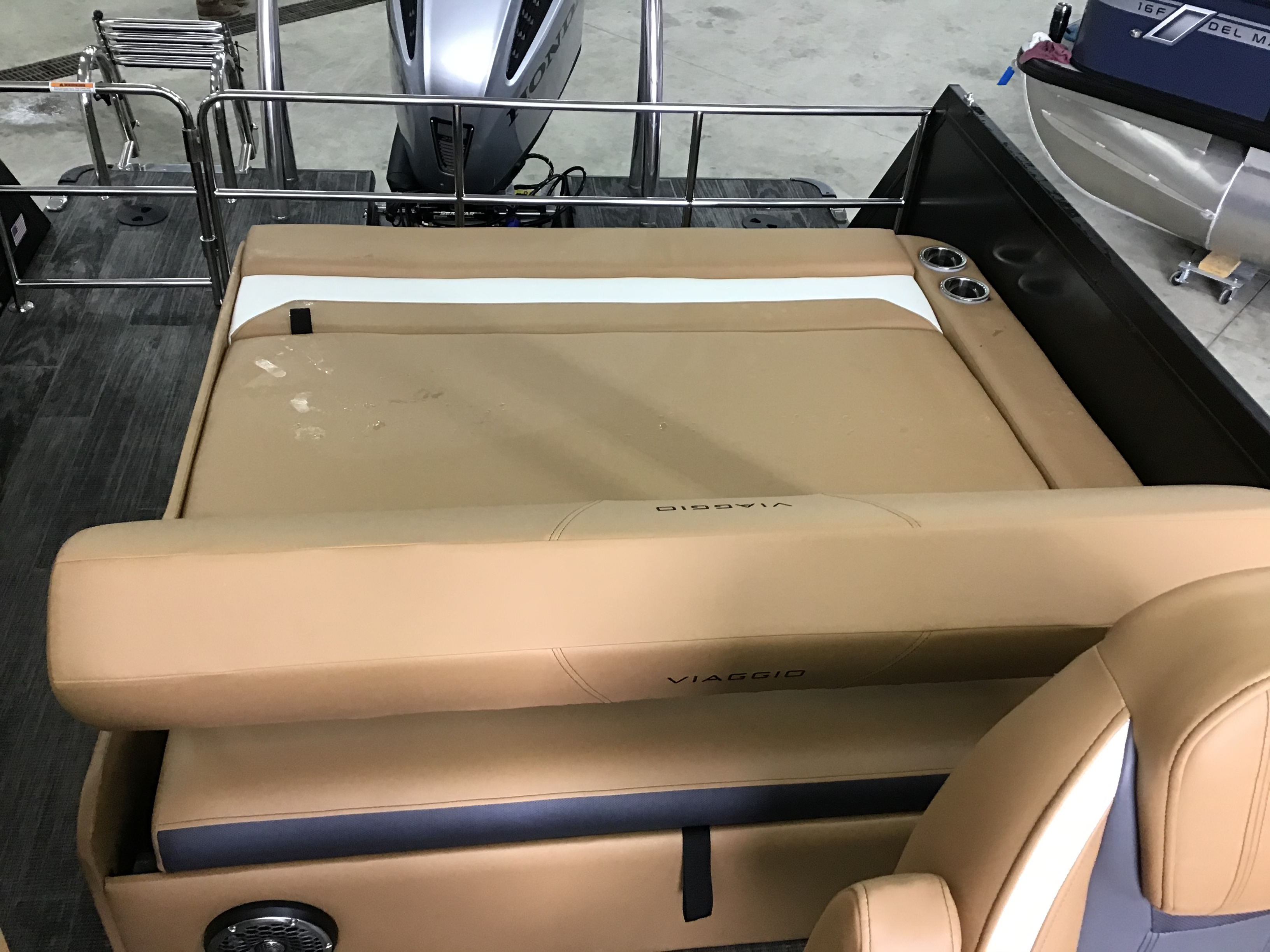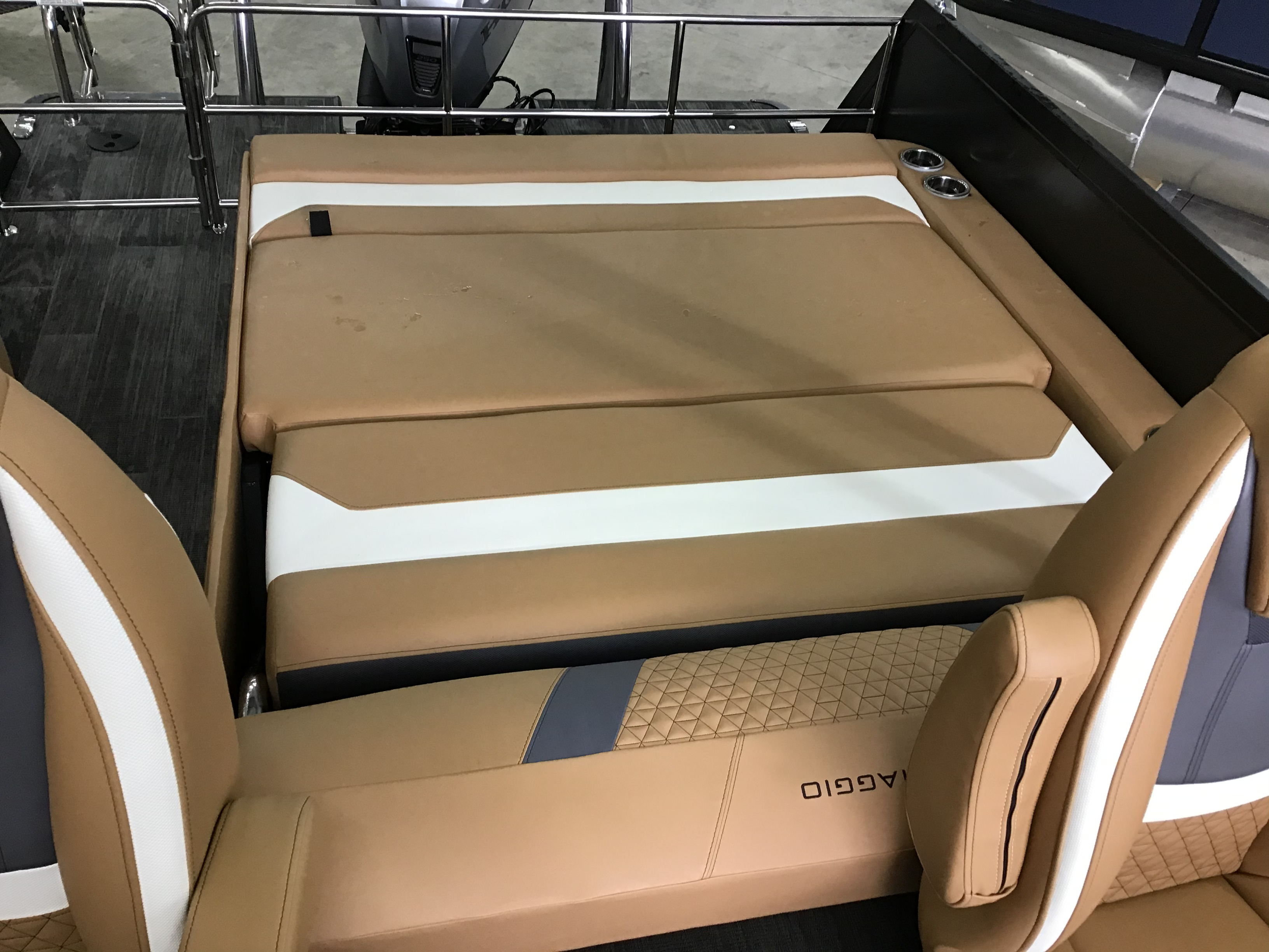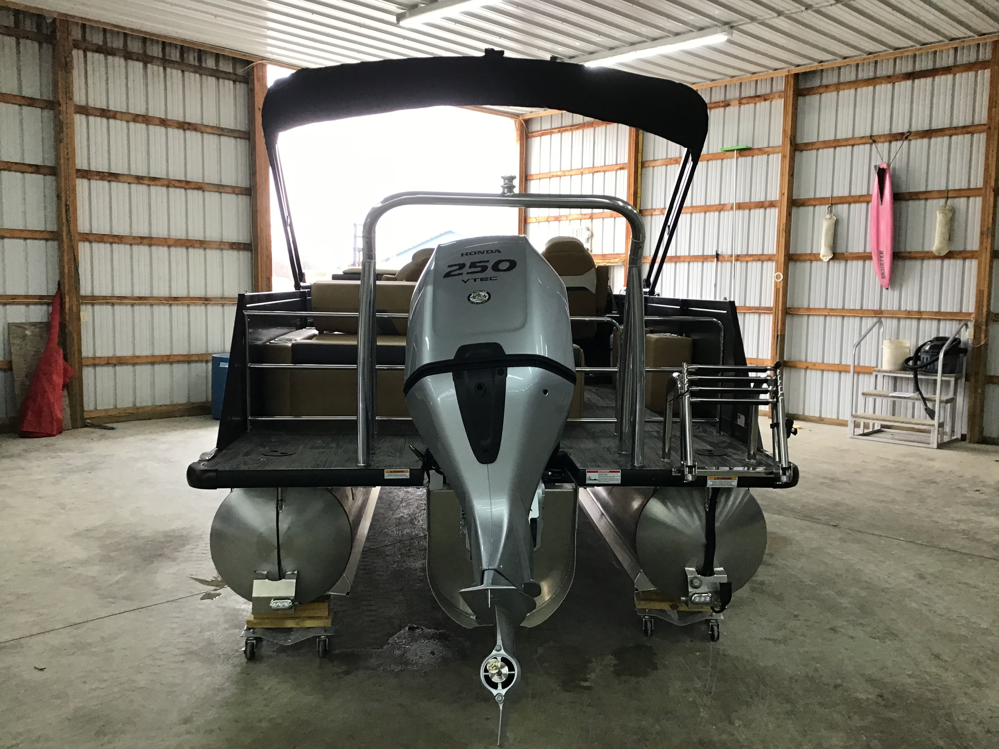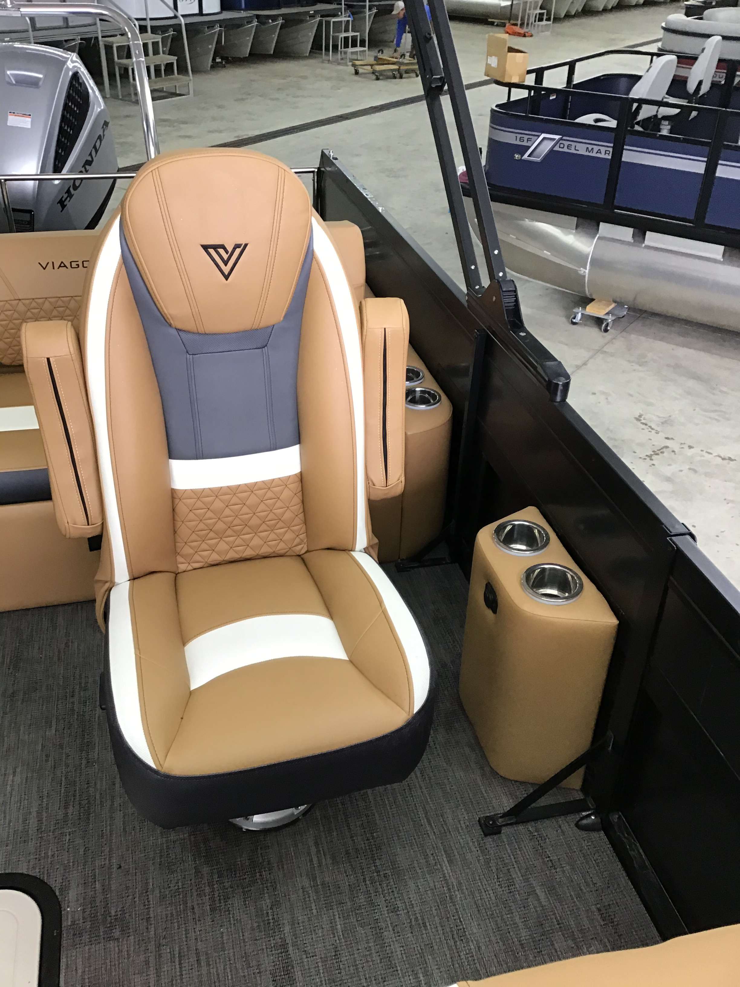 New 2023 Viaggio Diamante S 23 Tritoon with Full Platinum Package, Power Bimini and BF250 hp Honda, available now at Fay’s Marina in La Porte, Indiana