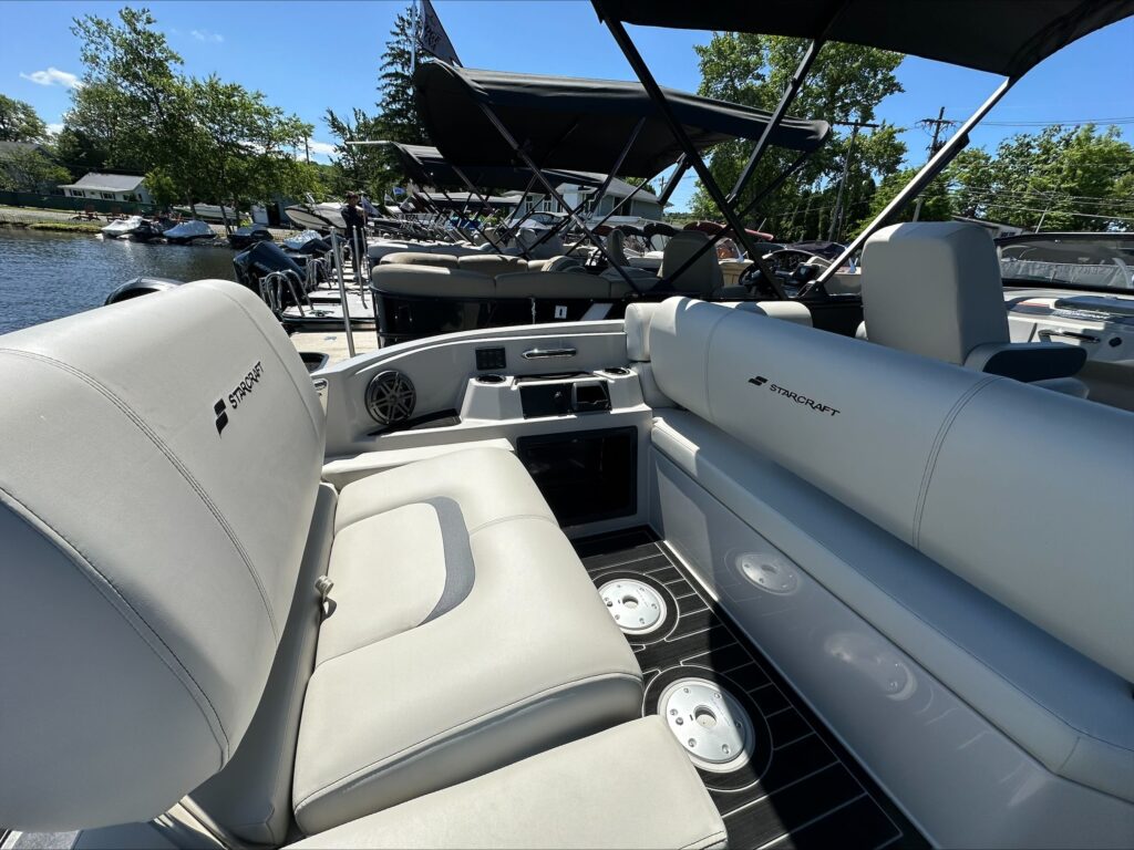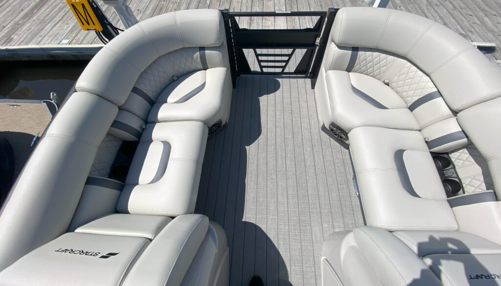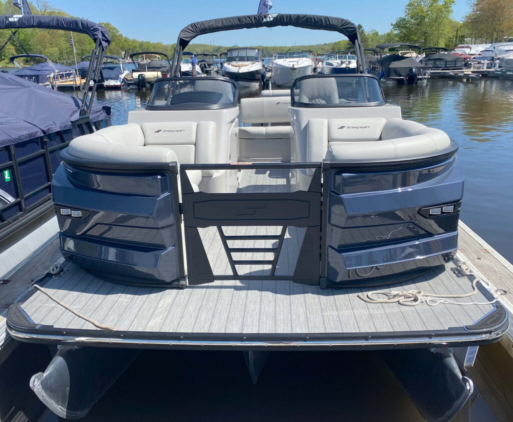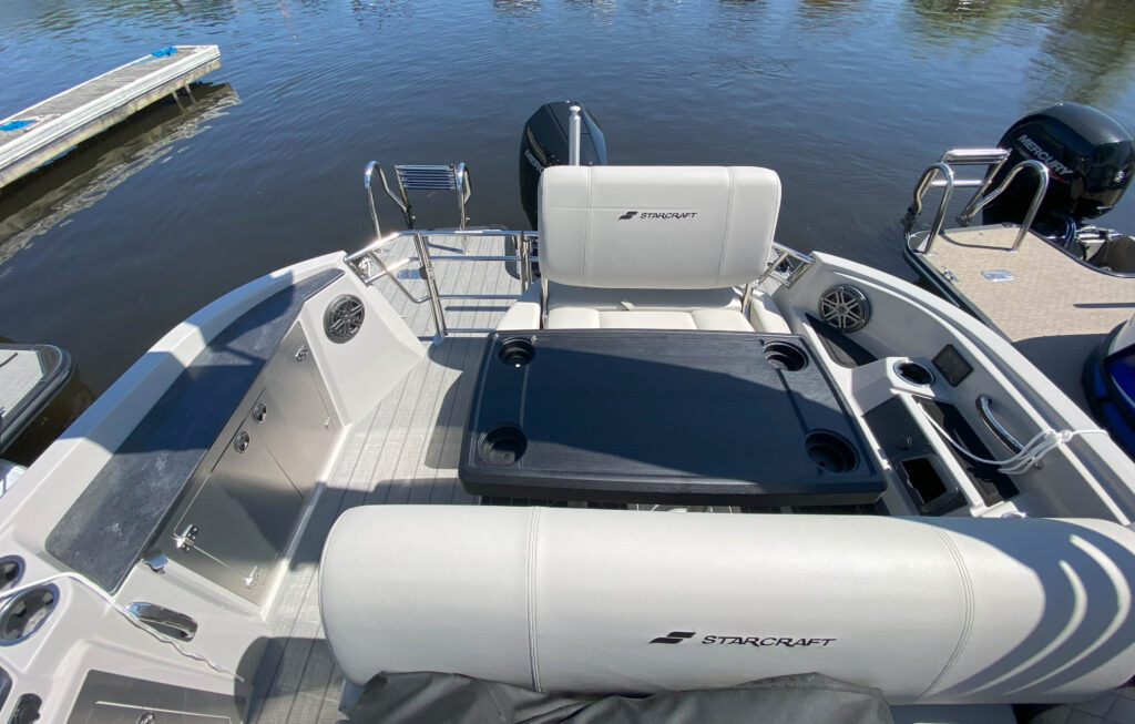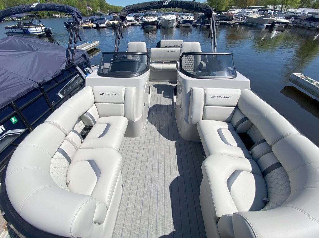 Luxury lives here. Starcraft Marine’s new flagship pontoon boat series, this RX with sharp blue steel panels is all about pampering you and your family with plush furniture and performance.