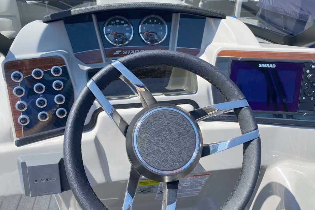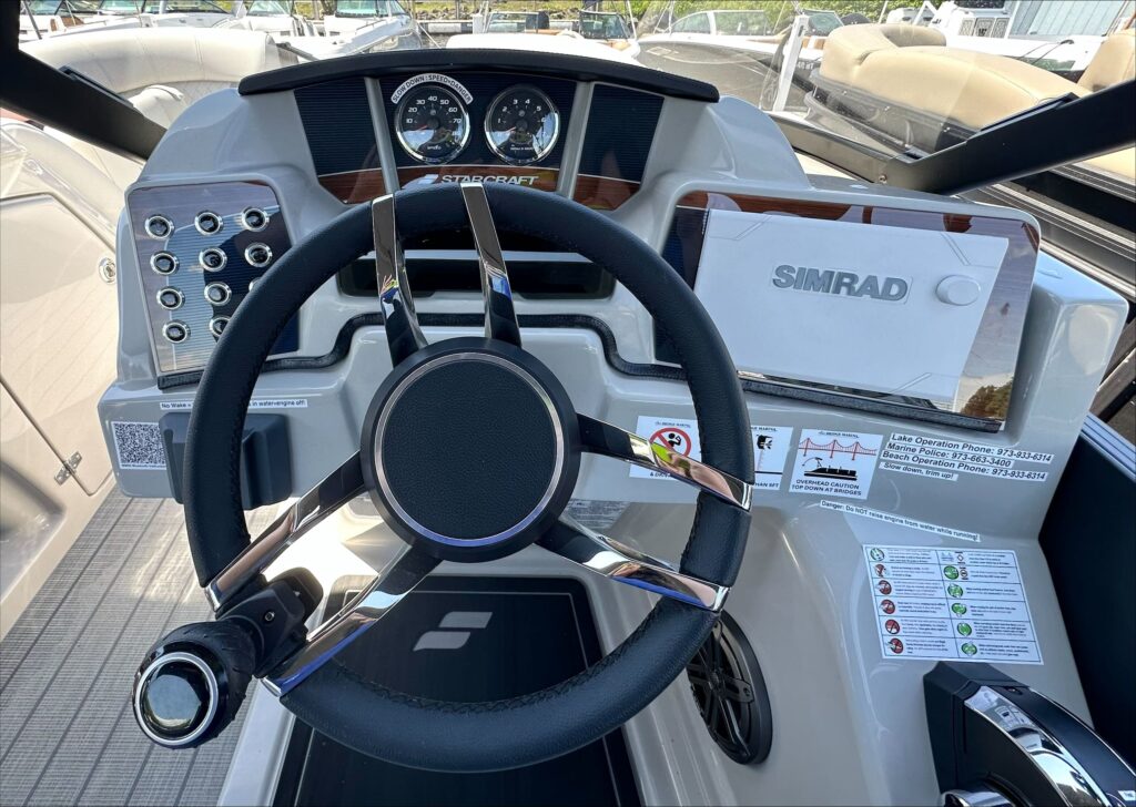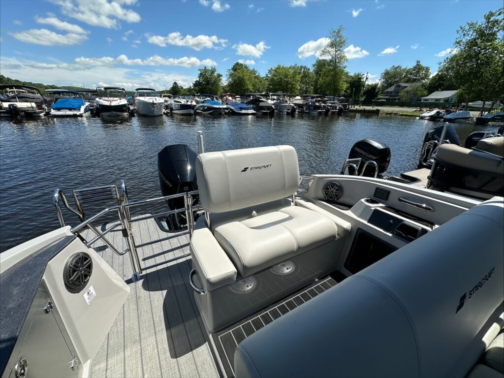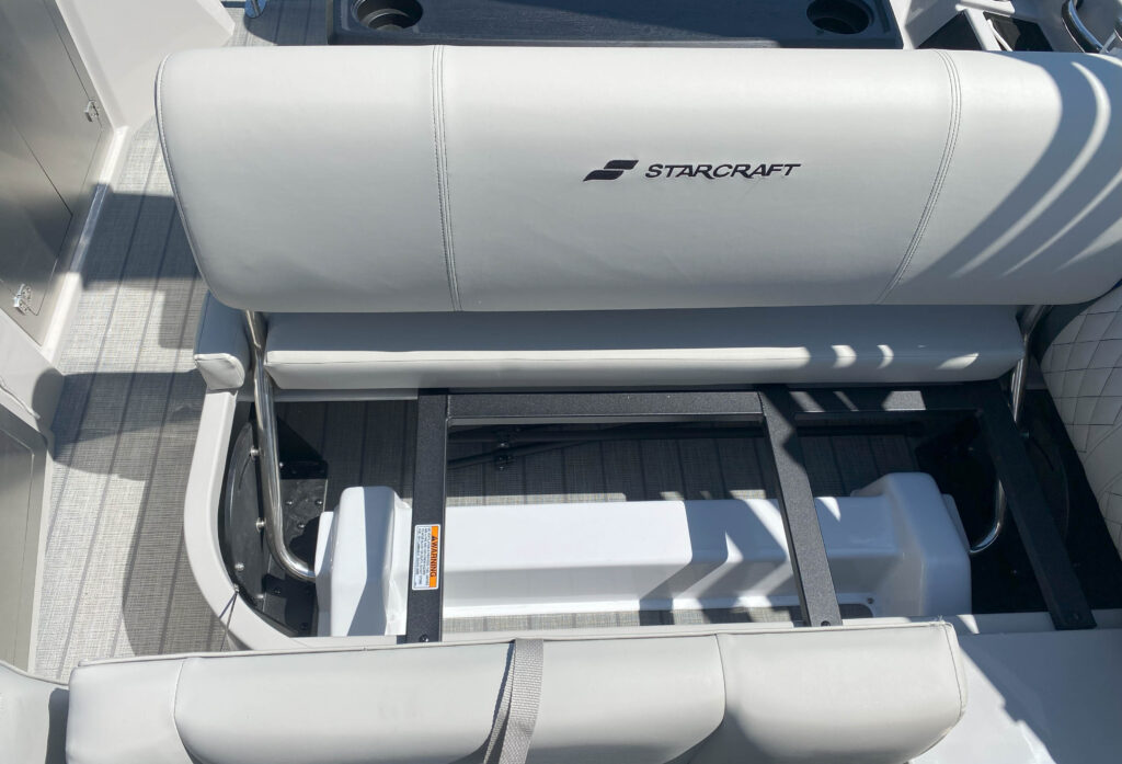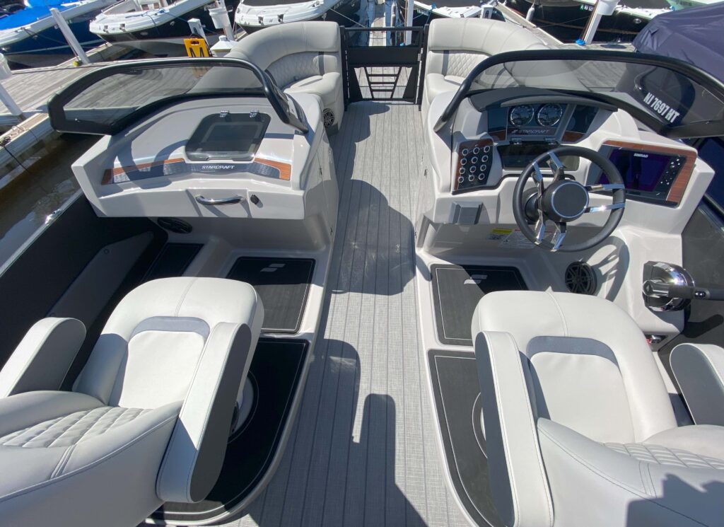 Luxury lives here. Starcraft Marine’s new flagship pontoon boat series, this RX with sharp blue steel panels is all about pampering you and your family with plush furniture and performance.
