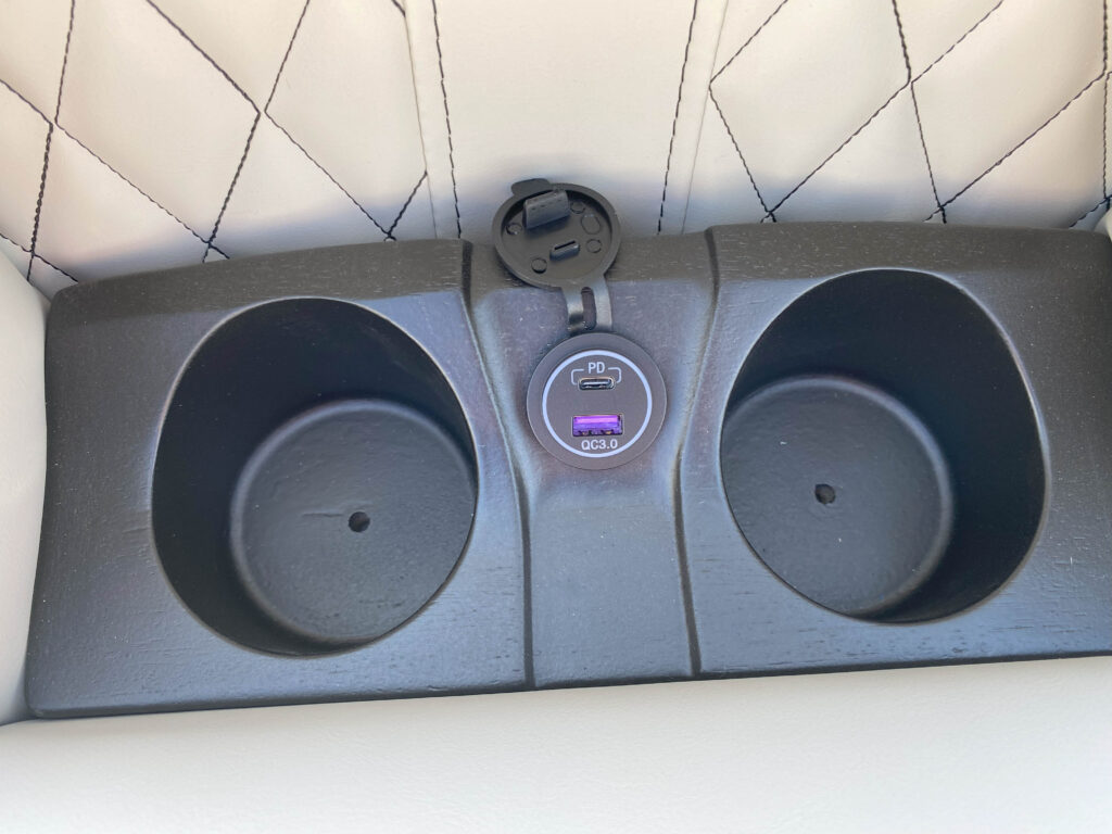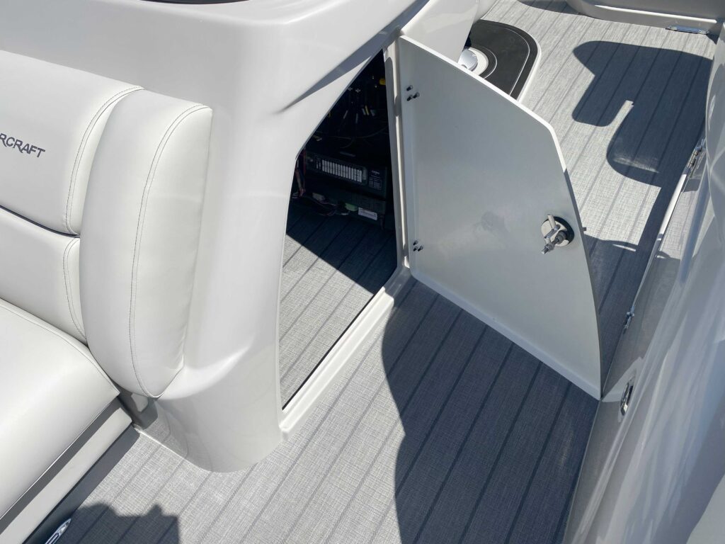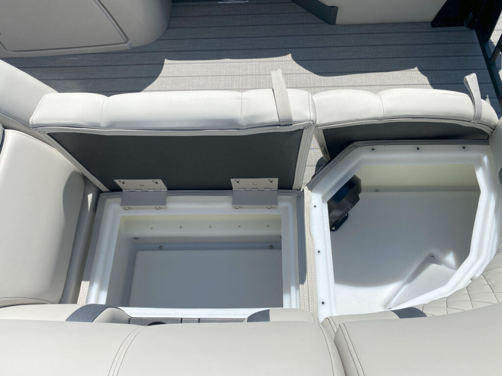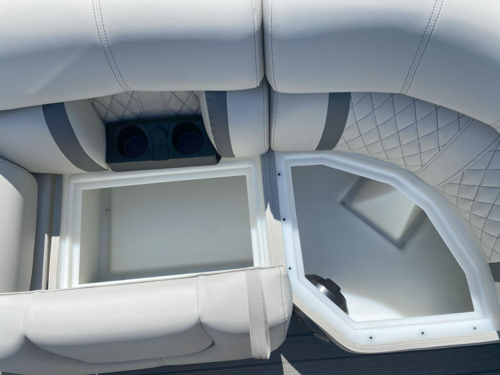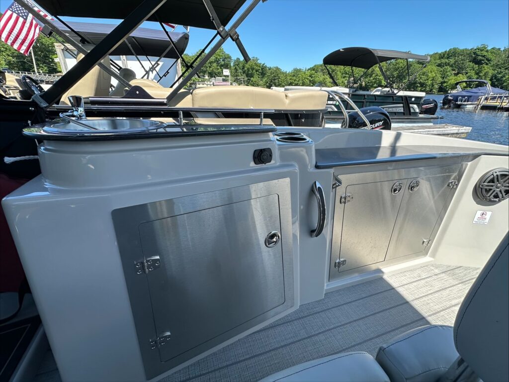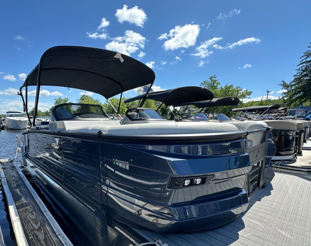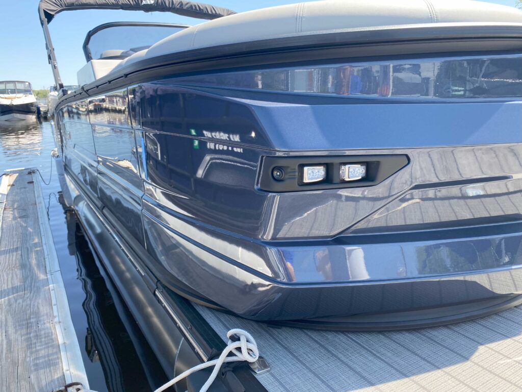 Features include durable ABS panels that give this triple pontoon a unique look unlike any other, Audio Plus 225 Sound Package, Big Water Package, extended deck, full teak weave flooring in gray, black power bimini top and playpen cover, dual battery with switch, Blue Lighting Package, light up cupholders, mood lights, and more!