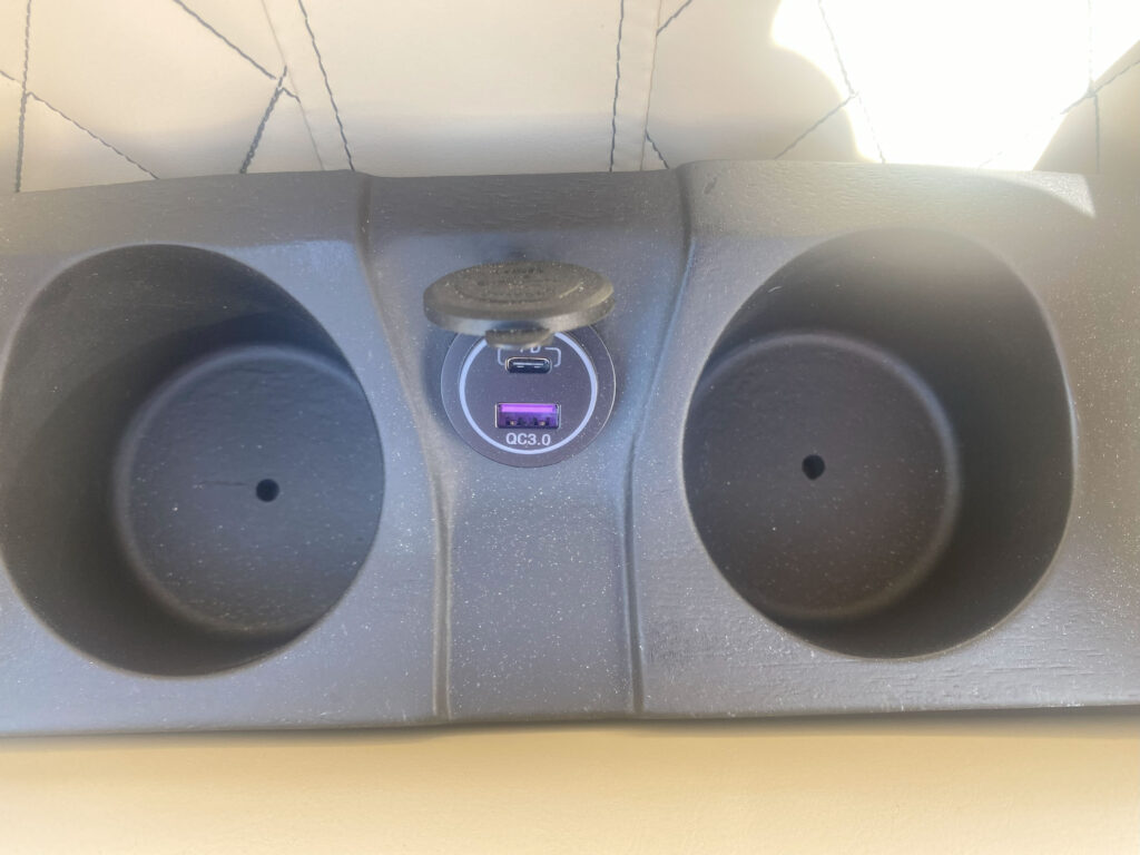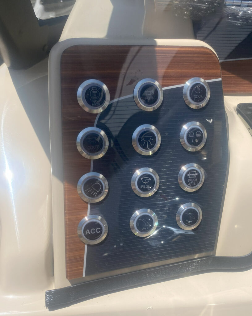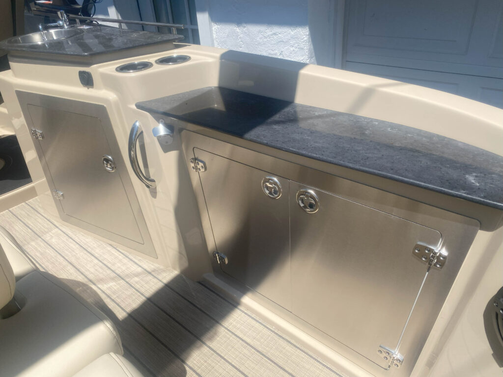 Features include black power bimini top and playpen cover, full teak weave flooring in brown, stylish black panels, changing room, extended deck, remote switch panel with backup ignition, power assist steering, dual battery with switch, lighted cupholders, Graph Simrad chart plotter and fish finder, and more!