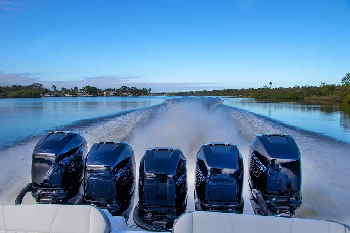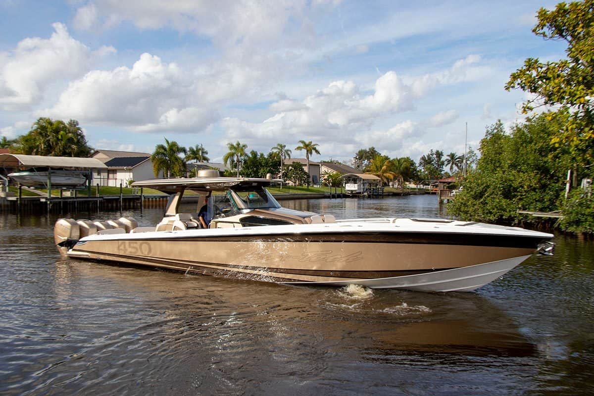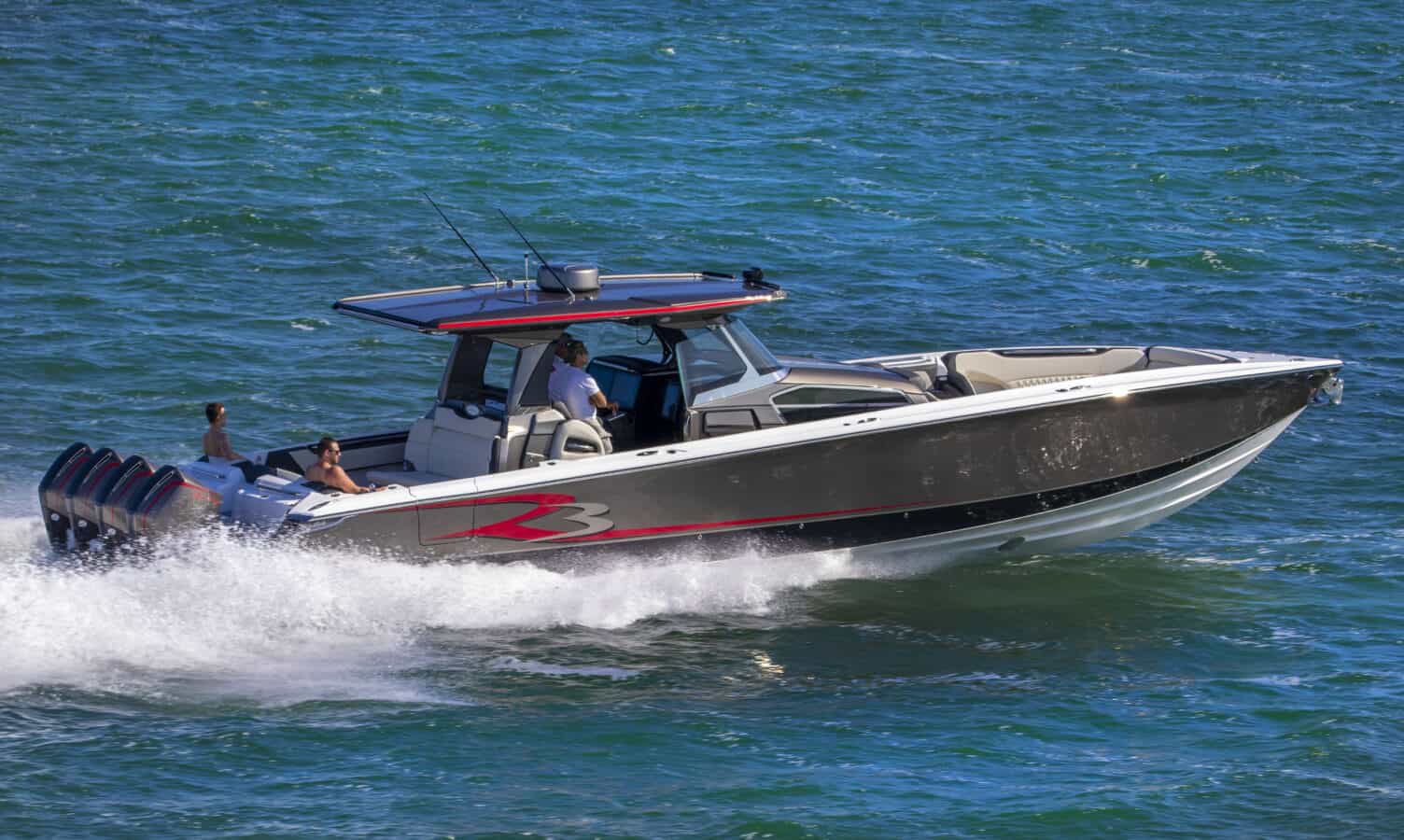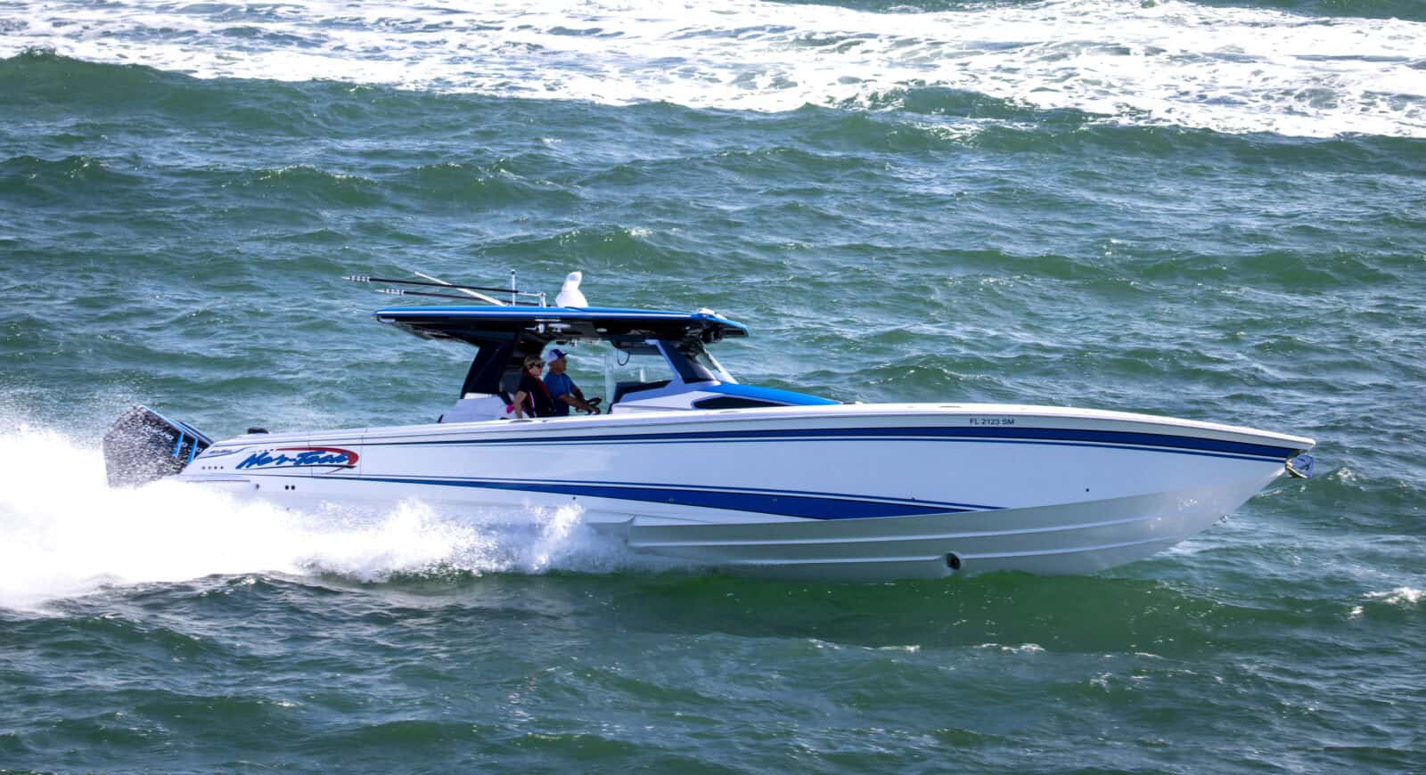 Boating meets sport meets art with the Nor-Tech 450 Sport. The sleek, sweeping lines of this machine are just the start of watching heads turn. The clean, streamlined construction make this 45-foot boat look even bigger. Add quad or quint Mercury motors, and the power will magnetize you to hop on board. In fact, everyone will want to be aboard the 450 Sport, and there’s plenty of room and luxurious creature comforts — including a wraparound sofa and wetbar. As with every Nor-Tech, the 450 Sport is put through a rigorous sea trial to ensure quality control.