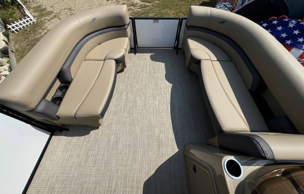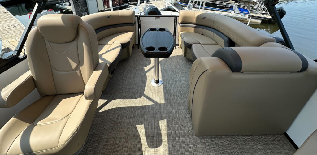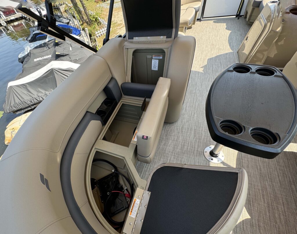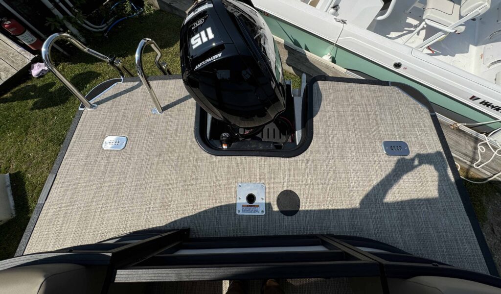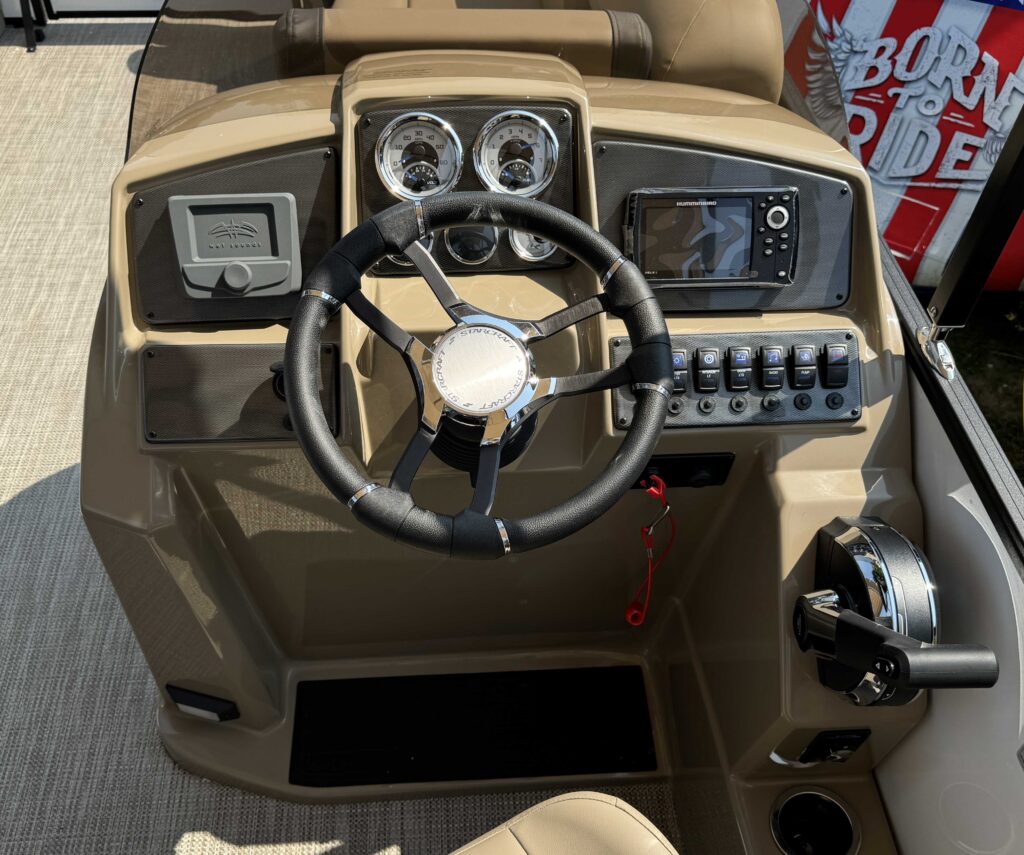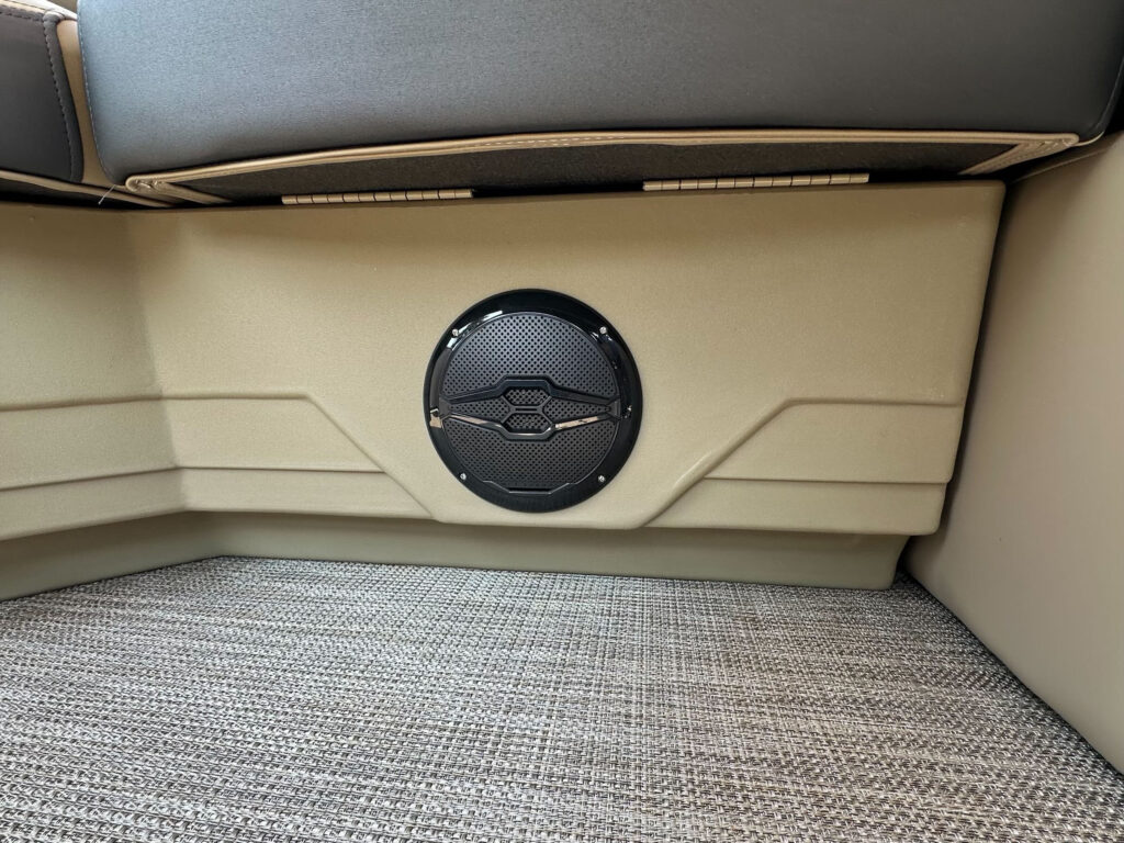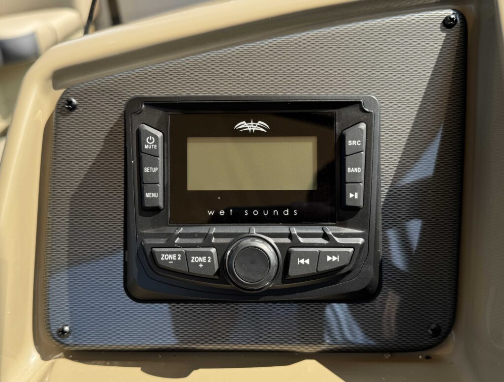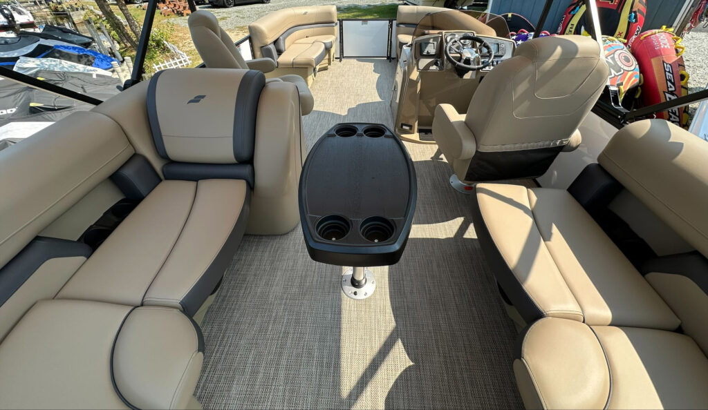 This boat comes fully loaded with great features like tan power bimini top and cover, full sea weave flooring in brown, two High Back helm chairs in mocha, hydraulic Seastar steering, GPS, Wet Sounds radio and sound system with four speakers, extended deck, pylon ski tow, and more!