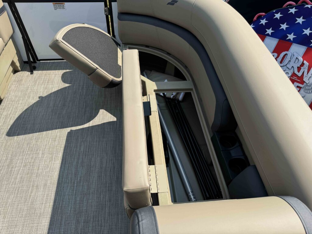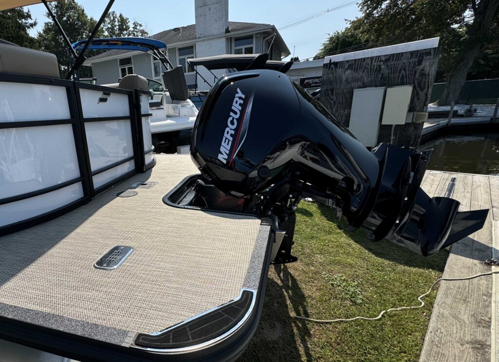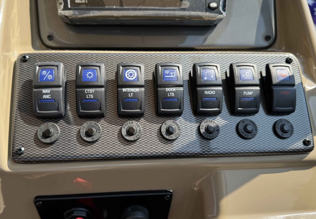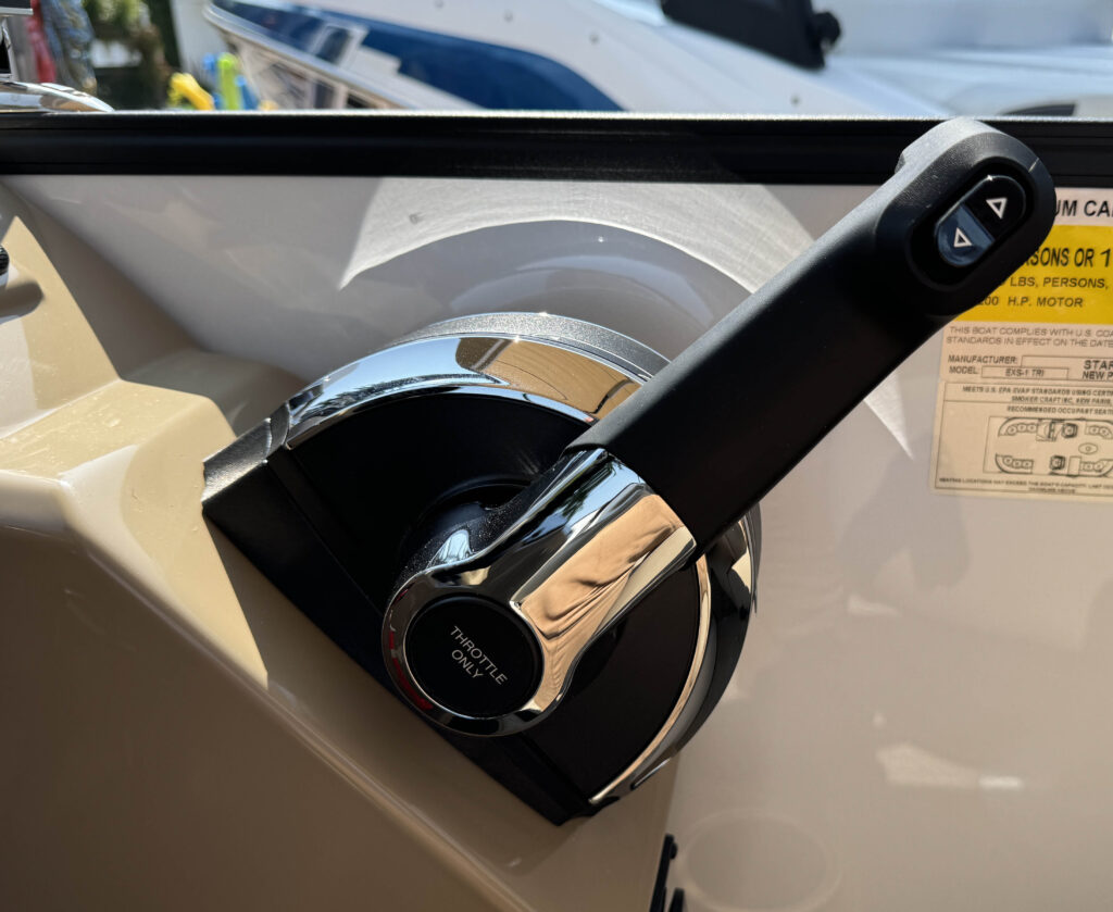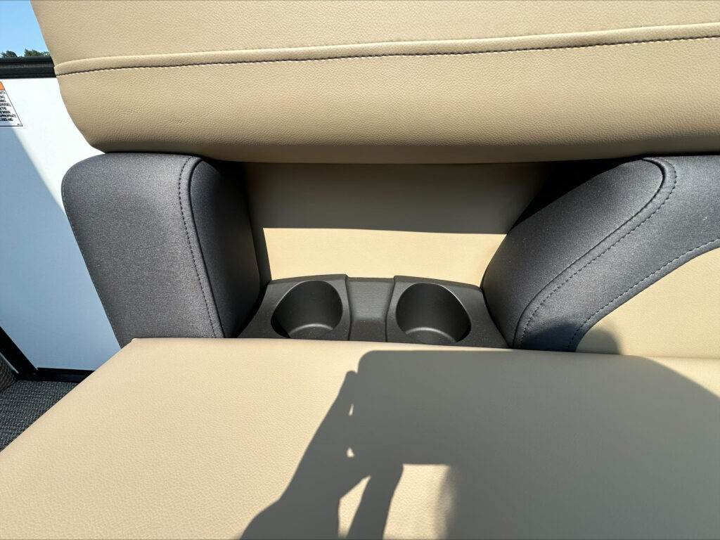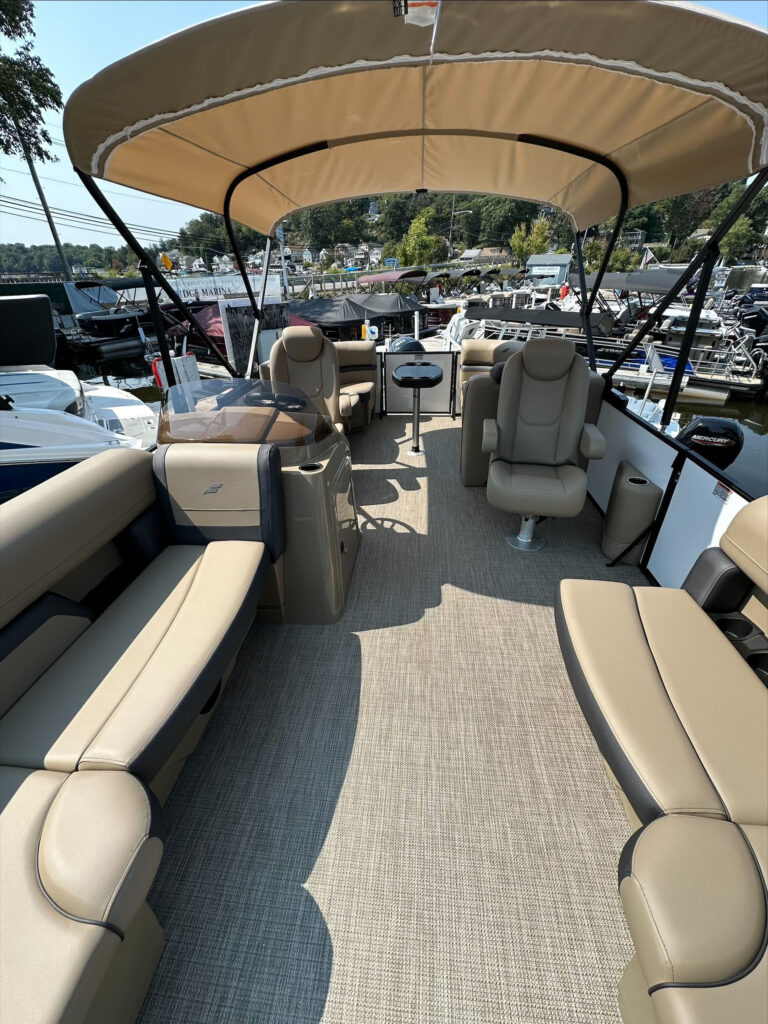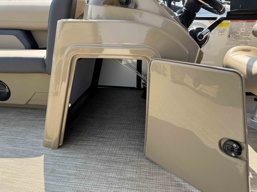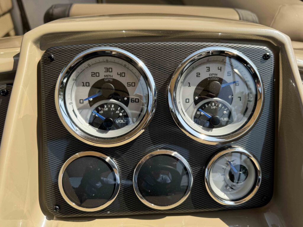 This boat comes fully loaded with great features like tan power bimini top and cover, full sea weave flooring in brown, two High Back helm chairs in mocha, hydraulic Seastar steering, GPS, Wet Sounds radio and sound system with four speakers, extended deck, pylon ski tow, and more!